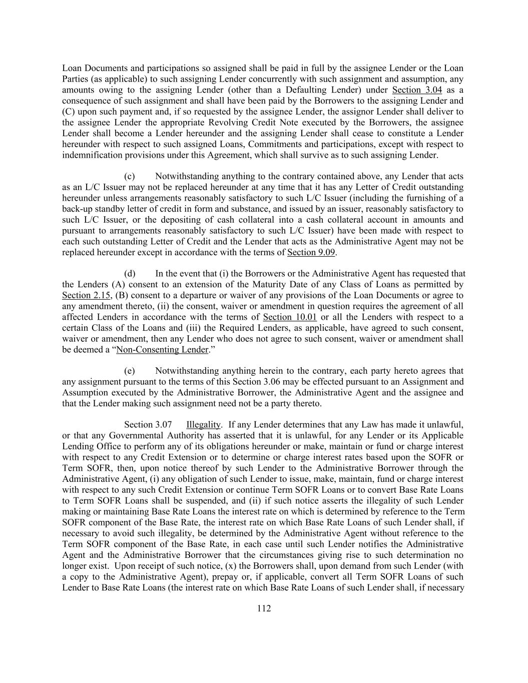 Loan Documents and participations so assigned shall be paid in full by the assignee Lender or the Loan Parties (as applicable) to such assigning Lender concurrently with such assignment and assumption, any amounts owing to the assigning Lender (other than a Defaulting Lender) under Section 3.04 as a consequence of such assignment and shall have been paid by the Borrowers to the assigning Lender and (C) upon such payment and, if so requested by the assignee Lender, the assignor Lender shall deliver to the assignee Lender the appropriate Revolving Credit Note executed by the Borrowers, the assignee Lender shall become a Lender hereunder and the assigning Lender shall cease to constitute a Lender hereunder with respect to such assigned Loans, Commitments and participations, except with respect to indemnification provisions under this Agreement, which shall survive as to such assigning Lender. (c) Notwithstanding anything to the contrary contained above, any Lender that acts as an L/C Issuer may not be replaced hereunder at any time that it has any Letter of Credit outstanding hereunder unless arrangements reasonably satisfactory to such L/C Issuer (including the furnishing of a back-up standby letter of credit in form and substance, and issued by an issuer, reasonably satisfactory to such L/C Issuer, or the depositing of cash collateral into a cash collateral account in amounts and pursuant to arrangements reasonably satisfactory to such L/C Issuer) have been made with respect to each such outstanding Letter of Credit and the Lender that acts as the Administrative Agent may not be replaced hereunder except in accordance with the terms of Section 9.09. (d) In the event that (i) the Borrowers or the Administrative Agent has requested that the Lenders (A) consent to an extension of the Maturity Date of any Class of Loans as permitted by Section 2.15, (B) consent to a departure or waiver of any provisions of the Loan Documents or agree to any amendment thereto, (ii) the consent, waiver or amendment in question requires the agreement of all affected Lenders in accordance with the terms of Section 10.01 or all the Lenders with respect to a certain Class of the Loans and (iii) the Required Lenders, as applicable, have agreed to such consent, waiver or amendment, then any Lender who does not agree to such consent, waiver or amendment shall be deemed a “Non-Consenting Lender.” (e) Notwithstanding anything herein to the contrary, each party hereto agrees that any assignment pursuant to the terms of this Section 3.06 may be effected pursuant to an Assignment and Assumption executed by the Administrative Borrower, the Administrative Agent and the assignee and that the Lender making such assignment need not be a party thereto. Section 3.07 Illegality. If any Lender determines that any Law has made it unlawful, or that any Governmental Authority has asserted that it is unlawful, for any Lender or its Applicable Lending Office to perform any of its obligations hereunder or make, maintain or fund or charge interest with respect to any Credit Extension or to determine or charge interest rates based upon the SOFR or Term SOFR, then, upon notice thereof by such Lender to the Administrative Borrower through the Administrative Agent, (i) any obligation of such Lender to issue, make, maintain, fund or charge interest with respect to any such Credit Extension or continue Term SOFR Loans or to convert Base Rate Loans to Term SOFR Loans shall be suspended, and (ii) if such notice asserts the illegality of such Lender making or maintaining Base Rate Loans the interest rate on which is determined by reference to the Term SOFR component of the Base Rate, the interest rate on which Base Rate Loans of such Lender shall, if necessary to avoid such illegality, be determined by the Administrative Agent without reference to the Term SOFR component of the Base Rate, in each case until such Lender notifies the Administrative Agent and the Administrative Borrower that the circumstances giving rise to such determination no longer exist. Upon receipt of such notice, (x) the Borrowers shall, upon demand from such Lender (with a copy to the Administrative Agent), prepay or, if applicable, convert all Term SOFR Loans of such Lender to Base Rate Loans (the interest rate on which Base Rate Loans of such Lender shall, if necessary 112
