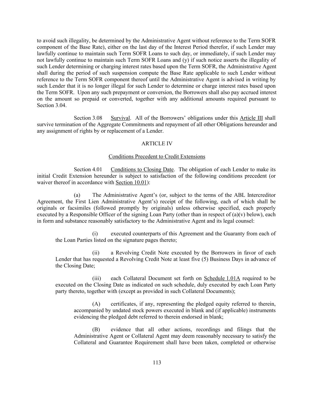 to avoid such illegality, be determined by the Administrative Agent without reference to the Term SOFR component of the Base Rate), either on the last day of the Interest Period therefor, if such Lender may lawfully continue to maintain such Term SOFR Loans to such day, or immediately, if such Lender may not lawfully continue to maintain such Term SOFR Loans and (y) if such notice asserts the illegality of such Lender determining or charging interest rates based upon the Term SOFR, the Administrative Agent shall during the period of such suspension compute the Base Rate applicable to such Lender without reference to the Term SOFR component thereof until the Administrative Agent is advised in writing by such Lender that it is no longer illegal for such Lender to determine or charge interest rates based upon the Term SOFR. Upon any such prepayment or conversion, the Borrowers shall also pay accrued interest on the amount so prepaid or converted, together with any additional amounts required pursuant to Section 3.04. Section 3.08 Survival. All of the Borrowers’ obligations under this Article III shall survive termination of the Aggregate Commitments and repayment of all other Obligations hereunder and any assignment of rights by or replacement of a Lender. ARTICLE IV Conditions Precedent to Credit Extensions Section 4.01 Conditions to Closing Date. The obligation of each Lender to make its initial Credit Extension hereunder is subject to satisfaction of the following conditions precedent (or waiver thereof in accordance with Section 10.01): (a) The Administrative Agent’s (or, subject to the terms of the ABL Intercreditor Agreement, the First Lien Administrative Agent’s) receipt of the following, each of which shall be originals or facsimiles (followed promptly by originals) unless otherwise specified, each properly executed by a Responsible Officer of the signing Loan Party (other than in respect of (a)(v) below), each in form and substance reasonably satisfactory to the Administrative Agent and its legal counsel: (i) executed counterparts of this Agreement and the Guaranty from each of the Loan Parties listed on the signature pages thereto; (ii) a Revolving Credit Note executed by the Borrowers in favor of each Lender that has requested a Revolving Credit Note at least five (5) Business Days in advance of the Closing Date; (iii) each Collateral Document set forth on Schedule 1.01A required to be executed on the Closing Date as indicated on such schedule, duly executed by each Loan Party party thereto, together with (except as provided in such Collateral Documents); (A) certificates, if any, representing the pledged equity referred to therein, accompanied by undated stock powers executed in blank and (if applicable) instruments evidencing the pledged debt referred to therein endorsed in blank; (B) evidence that all other actions, recordings and filings that the Administrative Agent or Collateral Agent may deem reasonably necessary to satisfy the Collateral and Guarantee Requirement shall have been taken, completed or otherwise 113