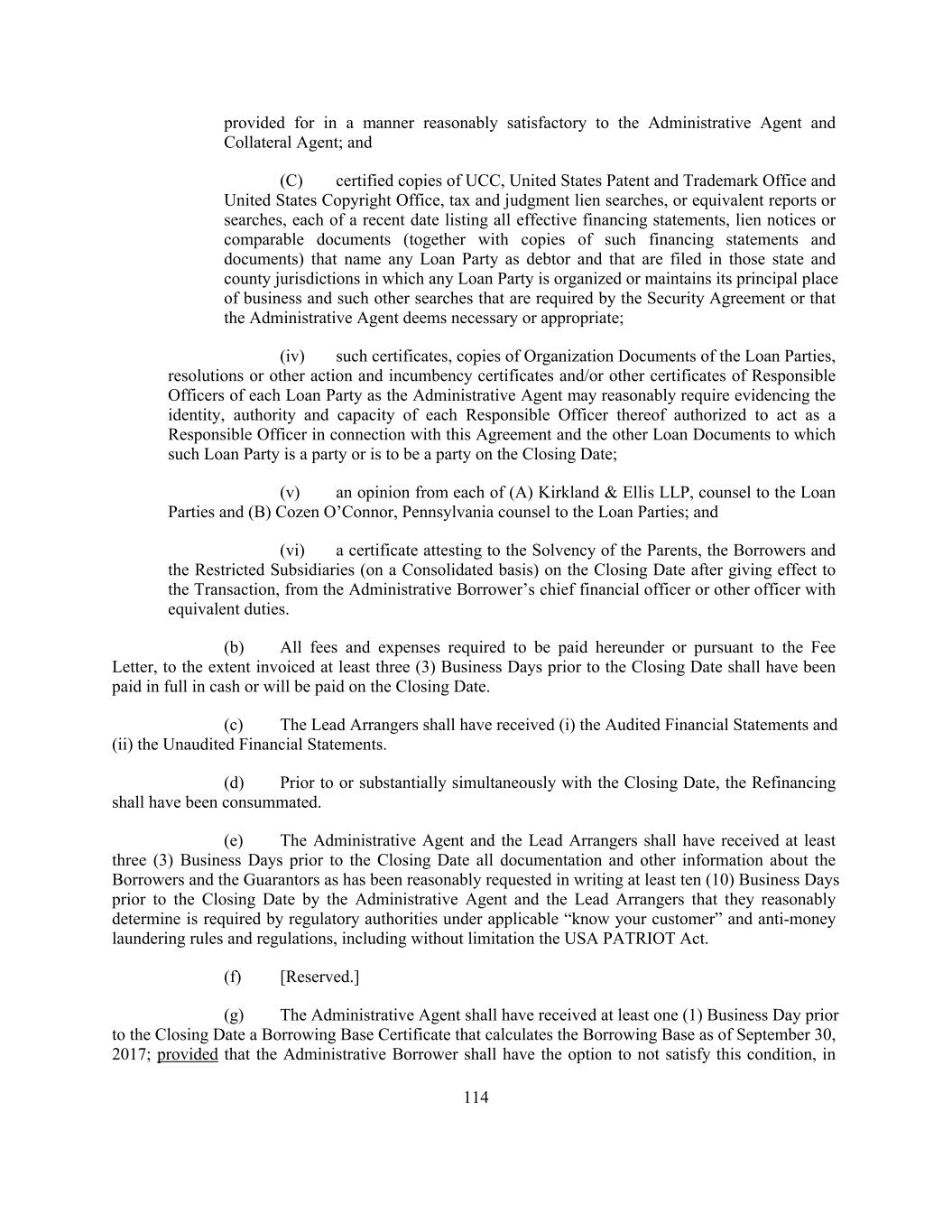 provided for in a manner reasonably satisfactory to the Administrative Agent and Collateral Agent; and (C) certified copies of UCC, United States Patent and Trademark Office and United States Copyright Office, tax and judgment lien searches, or equivalent reports or searches, each of a recent date listing all effective financing statements, lien notices or comparable documents (together with copies of such financing statements and documents) that name any Loan Party as debtor and that are filed in those state and county jurisdictions in which any Loan Party is organized or maintains its principal place of business and such other searches that are required by the Security Agreement or that the Administrative Agent deems necessary or appropriate; (iv) such certificates, copies of Organization Documents of the Loan Parties, resolutions or other action and incumbency certificates and/or other certificates of Responsible Officers of each Loan Party as the Administrative Agent may reasonably require evidencing the identity, authority and capacity of each Responsible Officer thereof authorized to act as a Responsible Officer in connection with this Agreement and the other Loan Documents to which such Loan Party is a party or is to be a party on the Closing Date; (v) an opinion from each of (A) Kirkland & Ellis LLP, counsel to the Loan Parties and (B) Cozen O’Connor, Pennsylvania counsel to the Loan Parties; and (vi) a certificate attesting to the Solvency of the Parents, the Borrowers and the Restricted Subsidiaries (on a Consolidated basis) on the Closing Date after giving effect to the Transaction, from the Administrative Borrower’s chief financial officer or other officer with equivalent duties. (b) All fees and expenses required to be paid hereunder or pursuant to the Fee Letter, to the extent invoiced at least three (3) Business Days prior to the Closing Date shall have been paid in full in cash or will be paid on the Closing Date. (c) The Lead Arrangers shall have received (i) the Audited Financial Statements and (ii) the Unaudited Financial Statements. (d) Prior to or substantially simultaneously with the Closing Date, the Refinancing shall have been consummated. (e) The Administrative Agent and the Lead Arrangers shall have received at least three (3) Business Days prior to the Closing Date all documentation and other information about the Borrowers and the Guarantors as has been reasonably requested in writing at least ten (10) Business Days prior to the Closing Date by the Administrative Agent and the Lead Arrangers that they reasonably determine is required by regulatory authorities under applicable “know your customer” and anti-money laundering rules and regulations, including without limitation the USA PATRIOT Act. (f) [Reserved.] (g) The Administrative Agent shall have received at least one (1) Business Day prior to the Closing Date a Borrowing Base Certificate that calculates the Borrowing Base as of September 30, 2017; provided that the Administrative Borrower shall have the option to not satisfy this condition, in 114