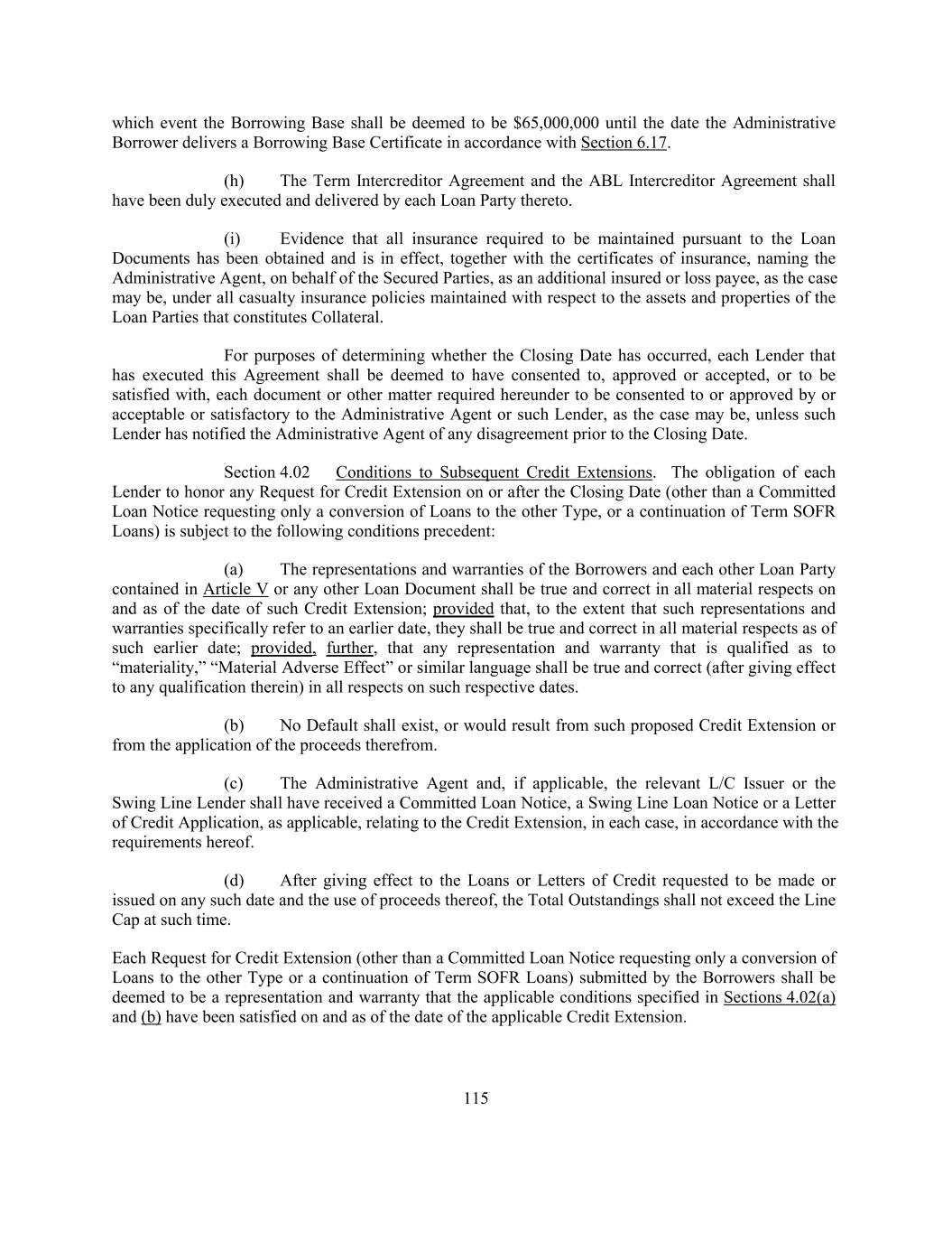 which event the Borrowing Base shall be deemed to be $65,000,000 until the date the Administrative Borrower delivers a Borrowing Base Certificate in accordance with Section 6.17. (h) The Term Intercreditor Agreement and the ABL Intercreditor Agreement shall have been duly executed and delivered by each Loan Party thereto. (i) Evidence that all insurance required to be maintained pursuant to the Loan Documents has been obtained and is in effect, together with the certificates of insurance, naming the Administrative Agent, on behalf of the Secured Parties, as an additional insured or loss payee, as the case may be, under all casualty insurance policies maintained with respect to the assets and properties of the Loan Parties that constitutes Collateral. For purposes of determining whether the Closing Date has occurred, each Lender that has executed this Agreement shall be deemed to have consented to, approved or accepted, or to be satisfied with, each document or other matter required hereunder to be consented to or approved by or acceptable or satisfactory to the Administrative Agent or such Lender, as the case may be, unless such Lender has notified the Administrative Agent of any disagreement prior to the Closing Date. Section 4.02 Conditions to Subsequent Credit Extensions. The obligation of each Lender to honor any Request for Credit Extension on or after the Closing Date (other than a Committed Loan Notice requesting only a conversion of Loans to the other Type, or a continuation of Term SOFR Loans) is subject to the following conditions precedent: (a) The representations and warranties of the Borrowers and each other Loan Party contained in Article V or any other Loan Document shall be true and correct in all material respects on and as of the date of such Credit Extension; provided that, to the extent that such representations and warranties specifically refer to an earlier date, they shall be true and correct in all material respects as of such earlier date; provided, further, that any representation and warranty that is qualified as to “materiality,” “Material Adverse Effect” or similar language shall be true and correct (after giving effect to any qualification therein) in all respects on such respective dates. (b) No Default shall exist, or would result from such proposed Credit Extension or from the application of the proceeds therefrom. (c) The Administrative Agent and, if applicable, the relevant L/C Issuer or the Swing Line Lender shall have received a Committed Loan Notice, a Swing Line Loan Notice or a Letter of Credit Application, as applicable, relating to the Credit Extension, in each case, in accordance with the requirements hereof. (d) After giving effect to the Loans or Letters of Credit requested to be made or issued on any such date and the use of proceeds thereof, the Total Outstandings shall not exceed the Line Cap at such time. Each Request for Credit Extension (other than a Committed Loan Notice requesting only a conversion of Loans to the other Type or a continuation of Term SOFR Loans) submitted by the Borrowers shall be deemed to be a representation and warranty that the applicable conditions specified in Sections 4.02(a) and (b) have been satisfied on and as of the date of the applicable Credit Extension. 115