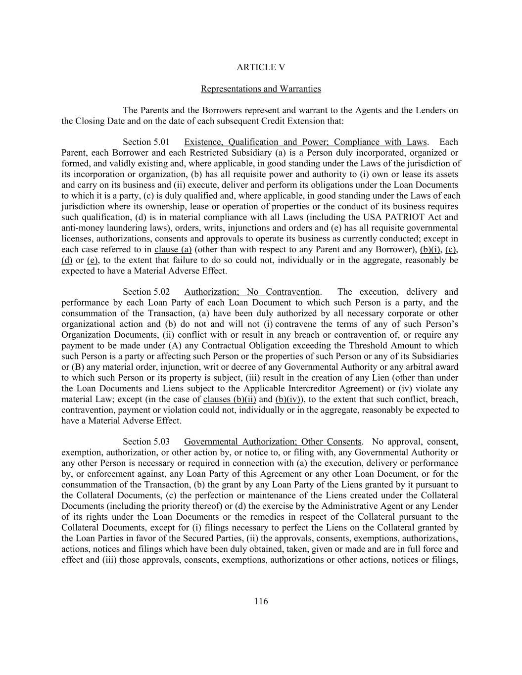 ARTICLE V Representations and Warranties The Parents and the Borrowers represent and warrant to the Agents and the Lenders on the Closing Date and on the date of each subsequent Credit Extension that: Section 5.01 Existence, Qualification and Power; Compliance with Laws. Each Parent, each Borrower and each Restricted Subsidiary (a) is a Person duly incorporated, organized or formed, and validly existing and, where applicable, in good standing under the Laws of the jurisdiction of its incorporation or organization, (b) has all requisite power and authority to (i) own or lease its assets and carry on its business and (ii) execute, deliver and perform its obligations under the Loan Documents to which it is a party, (c) is duly qualified and, where applicable, in good standing under the Laws of each jurisdiction where its ownership, lease or operation of properties or the conduct of its business requires such qualification, (d) is in material compliance with all Laws (including the USA PATRIOT Act and anti-money laundering laws), orders, writs, injunctions and orders and (e) has all requisite governmental licenses, authorizations, consents and approvals to operate its business as currently conducted; except in each case referred to in clause (a) (other than with respect to any Parent and any Borrower), (b)(i), (c), (d) or (e), to the extent that failure to do so could not, individually or in the aggregate, reasonably be expected to have a Material Adverse Effect. Section 5.02 Authorization; No Contravention. The execution, delivery and performance by each Loan Party of each Loan Document to which such Person is a party, and the consummation of the Transaction, (a) have been duly authorized by all necessary corporate or other organizational action and (b) do not and will not (i) contravene the terms of any of such Person’s Organization Documents, (ii) conflict with or result in any breach or contravention of, or require any payment to be made under (A) any Contractual Obligation exceeding the Threshold Amount to which such Person is a party or affecting such Person or the properties of such Person or any of its Subsidiaries or (B) any material order, injunction, writ or decree of any Governmental Authority or any arbitral award to which such Person or its property is subject, (iii) result in the creation of any Lien (other than under the Loan Documents and Liens subject to the Applicable Intercreditor Agreement) or (iv) violate any material Law; except (in the case of clauses (b)(ii) and (b)(iv)), to the extent that such conflict, breach, contravention, payment or violation could not, individually or in the aggregate, reasonably be expected to have a Material Adverse Effect. Section 5.03 Governmental Authorization; Other Consents. No approval, consent, exemption, authorization, or other action by, or notice to, or filing with, any Governmental Authority or any other Person is necessary or required in connection with (a) the execution, delivery or performance by, or enforcement against, any Loan Party of this Agreement or any other Loan Document, or for the consummation of the Transaction, (b) the grant by any Loan Party of the Liens granted by it pursuant to the Collateral Documents, (c) the perfection or maintenance of the Liens created under the Collateral Documents (including the priority thereof) or (d) the exercise by the Administrative Agent or any Lender of its rights under the Loan Documents or the remedies in respect of the Collateral pursuant to the Collateral Documents, except for (i) filings necessary to perfect the Liens on the Collateral granted by the Loan Parties in favor of the Secured Parties, (ii) the approvals, consents, exemptions, authorizations, actions, notices and filings which have been duly obtained, taken, given or made and are in full force and effect and (iii) those approvals, consents, exemptions, authorizations or other actions, notices or filings, 116