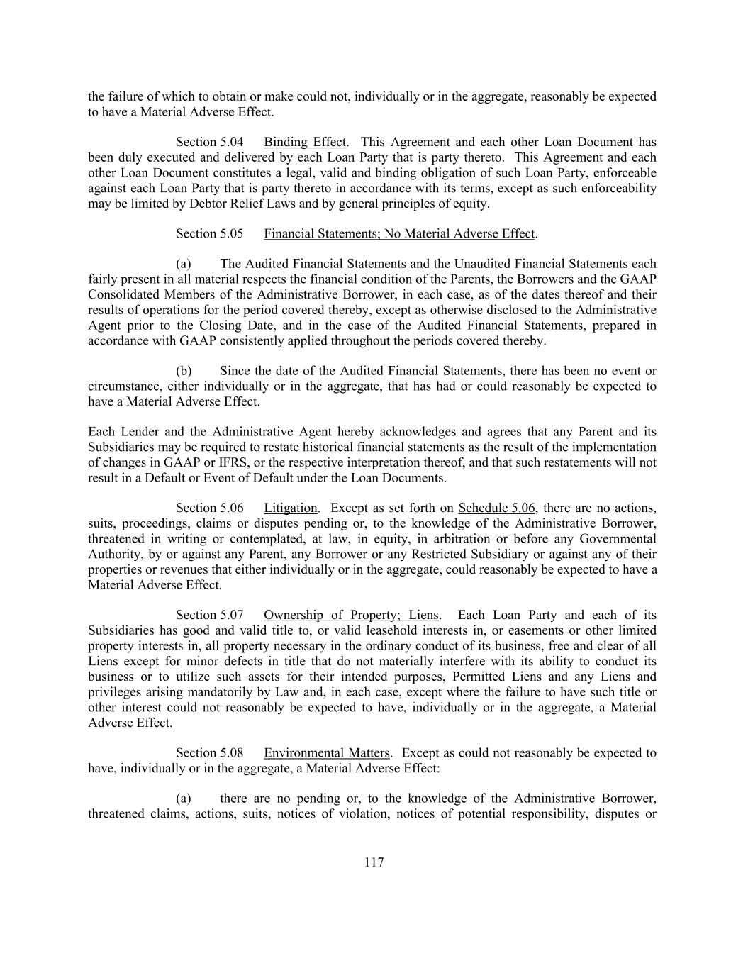 the failure of which to obtain or make could not, individually or in the aggregate, reasonably be expected to have a Material Adverse Effect. Section 5.04 Binding Effect. This Agreement and each other Loan Document has been duly executed and delivered by each Loan Party that is party thereto. This Agreement and each other Loan Document constitutes a legal, valid and binding obligation of such Loan Party, enforceable against each Loan Party that is party thereto in accordance with its terms, except as such enforceability may be limited by Debtor Relief Laws and by general principles of equity. Section 5.05 Financial Statements; No Material Adverse Effect. (a) The Audited Financial Statements and the Unaudited Financial Statements each fairly present in all material respects the financial condition of the Parents, the Borrowers and the GAAP Consolidated Members of the Administrative Borrower, in each case, as of the dates thereof and their results of operations for the period covered thereby, except as otherwise disclosed to the Administrative Agent prior to the Closing Date, and in the case of the Audited Financial Statements, prepared in accordance with GAAP consistently applied throughout the periods covered thereby. (b) Since the date of the Audited Financial Statements, there has been no event or circumstance, either individually or in the aggregate, that has had or could reasonably be expected to have a Material Adverse Effect. Each Lender and the Administrative Agent hereby acknowledges and agrees that any Parent and its Subsidiaries may be required to restate historical financial statements as the result of the implementation of changes in GAAP or IFRS, or the respective interpretation thereof, and that such restatements will not result in a Default or Event of Default under the Loan Documents. Section 5.06 Litigation. Except as set forth on Schedule 5.06, there are no actions, suits, proceedings, claims or disputes pending or, to the knowledge of the Administrative Borrower, threatened in writing or contemplated, at law, in equity, in arbitration or before any Governmental Authority, by or against any Parent, any Borrower or any Restricted Subsidiary or against any of their properties or revenues that either individually or in the aggregate, could reasonably be expected to have a Material Adverse Effect. Section 5.07 Ownership of Property; Liens. Each Loan Party and each of its Subsidiaries has good and valid title to, or valid leasehold interests in, or easements or other limited property interests in, all property necessary in the ordinary conduct of its business, free and clear of all Liens except for minor defects in title that do not materially interfere with its ability to conduct its business or to utilize such assets for their intended purposes, Permitted Liens and any Liens and privileges arising mandatorily by Law and, in each case, except where the failure to have such title or other interest could not reasonably be expected to have, individually or in the aggregate, a Material Adverse Effect. Section 5.08 Environmental Matters. Except as could not reasonably be expected to have, individually or in the aggregate, a Material Adverse Effect: (a) there are no pending or, to the knowledge of the Administrative Borrower, threatened claims, actions, suits, notices of violation, notices of potential responsibility, disputes or 117
