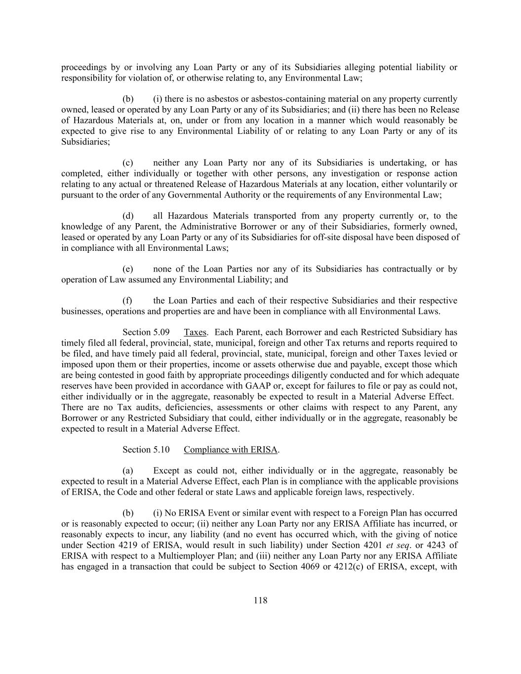 proceedings by or involving any Loan Party or any of its Subsidiaries alleging potential liability or responsibility for violation of, or otherwise relating to, any Environmental Law; (b) (i) there is no asbestos or asbestos-containing material on any property currently owned, leased or operated by any Loan Party or any of its Subsidiaries; and (ii) there has been no Release of Hazardous Materials at, on, under or from any location in a manner which would reasonably be expected to give rise to any Environmental Liability of or relating to any Loan Party or any of its Subsidiaries; (c) neither any Loan Party nor any of its Subsidiaries is undertaking, or has completed, either individually or together with other persons, any investigation or response action relating to any actual or threatened Release of Hazardous Materials at any location, either voluntarily or pursuant to the order of any Governmental Authority or the requirements of any Environmental Law; (d) all Hazardous Materials transported from any property currently or, to the knowledge of any Parent, the Administrative Borrower or any of their Subsidiaries, formerly owned, leased or operated by any Loan Party or any of its Subsidiaries for off-site disposal have been disposed of in compliance with all Environmental Laws; (e) none of the Loan Parties nor any of its Subsidiaries has contractually or by operation of Law assumed any Environmental Liability; and (f) the Loan Parties and each of their respective Subsidiaries and their respective businesses, operations and properties are and have been in compliance with all Environmental Laws. Section 5.09 Taxes. Each Parent, each Borrower and each Restricted Subsidiary has timely filed all federal, provincial, state, municipal, foreign and other Tax returns and reports required to be filed, and have timely paid all federal, provincial, state, municipal, foreign and other Taxes levied or imposed upon them or their properties, income or assets otherwise due and payable, except those which are being contested in good faith by appropriate proceedings diligently conducted and for which adequate reserves have been provided in accordance with GAAP or, except for failures to file or pay as could not, either individually or in the aggregate, reasonably be expected to result in a Material Adverse Effect. There are no Tax audits, deficiencies, assessments or other claims with respect to any Parent, any Borrower or any Restricted Subsidiary that could, either individually or in the aggregate, reasonably be expected to result in a Material Adverse Effect. Section 5.10 Compliance with ERISA. (a) Except as could not, either individually or in the aggregate, reasonably be expected to result in a Material Adverse Effect, each Plan is in compliance with the applicable provisions of ERISA, the Code and other federal or state Laws and applicable foreign laws, respectively. (b) (i) No ERISA Event or similar event with respect to a Foreign Plan has occurred or is reasonably expected to occur; (ii) neither any Loan Party nor any ERISA Affiliate has incurred, or reasonably expects to incur, any liability (and no event has occurred which, with the giving of notice under Section 4219 of ERISA, would result in such liability) under Section 4201 et seq. or 4243 of ERISA with respect to a Multiemployer Plan; and (iii) neither any Loan Party nor any ERISA Affiliate has engaged in a transaction that could be subject to Section 4069 or 4212(c) of ERISA, except, with 118