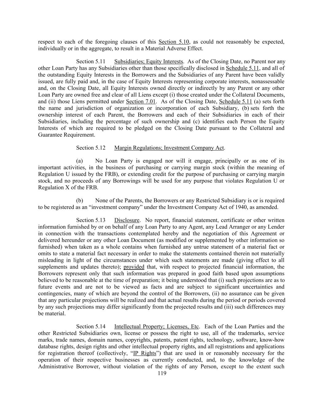 respect to each of the foregoing clauses of this Section 5.10, as could not reasonably be expected, individually or in the aggregate, to result in a Material Adverse Effect. Section 5.11 Subsidiaries; Equity Interests. As of the Closing Date, no Parent nor any other Loan Party has any Subsidiaries other than those specifically disclosed in Schedule 5.11, and all of the outstanding Equity Interests in the Borrowers and the Subsidiaries of any Parent have been validly issued, are fully paid and, in the case of Equity Interests representing corporate interests, nonassessable and, on the Closing Date, all Equity Interests owned directly or indirectly by any Parent or any other Loan Party are owned free and clear of all Liens except (i) those created under the Collateral Documents, and (ii) those Liens permitted under Section 7.01. As of the Closing Date, Schedule 5.11 (a) sets forth the name and jurisdiction of organization or incorporation of each Subsidiary, (b) sets forth the ownership interest of each Parent, the Borrowers and each of their Subsidiaries in each of their Subsidiaries, including the percentage of such ownership and (c) identifies each Person the Equity Interests of which are required to be pledged on the Closing Date pursuant to the Collateral and Guarantee Requirement. Section 5.12 Margin Regulations; Investment Company Act. (a) No Loan Party is engaged nor will it engage, principally or as one of its important activities, in the business of purchasing or carrying margin stock (within the meaning of Regulation U issued by the FRB), or extending credit for the purpose of purchasing or carrying margin stock, and no proceeds of any Borrowings will be used for any purpose that violates Regulation U or Regulation X of the FRB. (b) None of the Parents, the Borrowers or any Restricted Subsidiary is or is required to be registered as an “investment company” under the Investment Company Act of 1940, as amended. Section 5.13 Disclosure. No report, financial statement, certificate or other written information furnished by or on behalf of any Loan Party to any Agent, any Lead Arranger or any Lender in connection with the transactions contemplated hereby and the negotiation of this Agreement or delivered hereunder or any other Loan Document (as modified or supplemented by other information so furnished) when taken as a whole contains when furnished any untrue statement of a material fact or omits to state a material fact necessary in order to make the statements contained therein not materially misleading in light of the circumstances under which such statements are made (giving effect to all supplements and updates thereto); provided that, with respect to projected financial information, the Borrowers represent only that such information was prepared in good faith based upon assumptions believed to be reasonable at the time of preparation; it being understood that (i) such projections are as to future events and are not to be viewed as facts and are subject to significant uncertainties and contingencies, many of which are beyond the control of the Borrowers, (ii) no assurance can be given that any particular projections will be realized and that actual results during the period or periods covered by any such projections may differ significantly from the projected results and (iii) such differences may be material. Section 5.14 Intellectual Property; Licenses, Etc. Each of the Loan Parties and the other Restricted Subsidiaries own, license or possess the right to use, all of the trademarks, service marks, trade names, domain names, copyrights, patents, patent rights, technology, software, know-how database rights, design rights and other intellectual property rights, and all registrations and applications for registration thereof (collectively, “IP Rights”) that are used in or reasonably necessary for the operation of their respective businesses as currently conducted, and, to the knowledge of the Administrative Borrower, without violation of the rights of any Person, except to the extent such 119