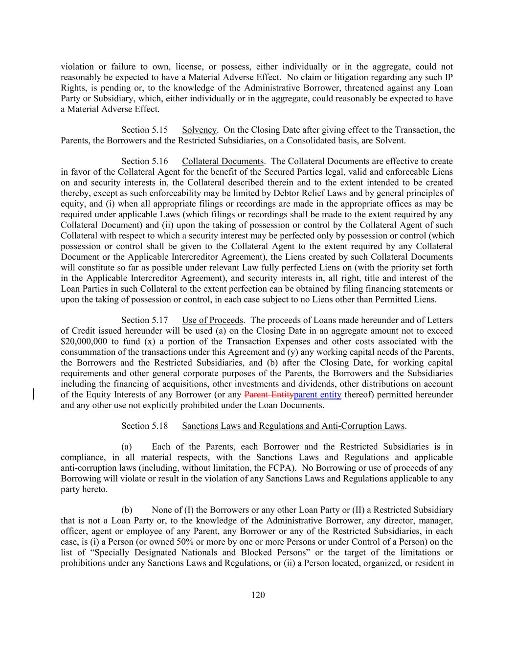 violation or failure to own, license, or possess, either individually or in the aggregate, could not reasonably be expected to have a Material Adverse Effect. No claim or litigation regarding any such IP Rights, is pending or, to the knowledge of the Administrative Borrower, threatened against any Loan Party or Subsidiary, which, either individually or in the aggregate, could reasonably be expected to have a Material Adverse Effect. Section 5.15 Solvency. On the Closing Date after giving effect to the Transaction, the Parents, the Borrowers and the Restricted Subsidiaries, on a Consolidated basis, are Solvent. Section 5.16 Collateral Documents. The Collateral Documents are effective to create in favor of the Collateral Agent for the benefit of the Secured Parties legal, valid and enforceable Liens on and security interests in, the Collateral described therein and to the extent intended to be created thereby, except as such enforceability may be limited by Debtor Relief Laws and by general principles of equity, and (i) when all appropriate filings or recordings are made in the appropriate offices as may be required under applicable Laws (which filings or recordings shall be made to the extent required by any Collateral Document) and (ii) upon the taking of possession or control by the Collateral Agent of such Collateral with respect to which a security interest may be perfected only by possession or control (which possession or control shall be given to the Collateral Agent to the extent required by any Collateral Document or the Applicable Intercreditor Agreement), the Liens created by such Collateral Documents will constitute so far as possible under relevant Law fully perfected Liens on (with the priority set forth in the Applicable Intercreditor Agreement), and security interests in, all right, title and interest of the Loan Parties in such Collateral to the extent perfection can be obtained by filing financing statements or upon the taking of possession or control, in each case subject to no Liens other than Permitted Liens. Section 5.17 Use of Proceeds. The proceeds of Loans made hereunder and of Letters of Credit issued hereunder will be used (a) on the Closing Date in an aggregate amount not to exceed $20,000,000 to fund (x) a portion of the Transaction Expenses and other costs associated with the consummation of the transactions under this Agreement and (y) any working capital needs of the Parents, the Borrowers and the Restricted Subsidiaries, and (b) after the Closing Date, for working capital requirements and other general corporate purposes of the Parents, the Borrowers and the Subsidiaries including the financing of acquisitions, other investments and dividends, other distributions on account of the Equity Interests of any Borrower (or any Parent Entityparent entity thereof) permitted hereunder and any other use not explicitly prohibited under the Loan Documents. Section 5.18 Sanctions Laws and Regulations and Anti-Corruption Laws. (a) Each of the Parents, each Borrower and the Restricted Subsidiaries is in compliance, in all material respects, with the Sanctions Laws and Regulations and applicable anti-corruption laws (including, without limitation, the FCPA). No Borrowing or use of proceeds of any Borrowing will violate or result in the violation of any Sanctions Laws and Regulations applicable to any party hereto. (b) None of (I) the Borrowers or any other Loan Party or (II) a Restricted Subsidiary that is not a Loan Party or, to the knowledge of the Administrative Borrower, any director, manager, officer, agent or employee of any Parent, any Borrower or any of the Restricted Subsidiaries, in each case, is (i) a Person (or owned 50% or more by one or more Persons or under Control of a Person) on the list of “Specially Designated Nationals and Blocked Persons” or the target of the limitations or prohibitions under any Sanctions Laws and Regulations, or (ii) a Person located, organized, or resident in 120