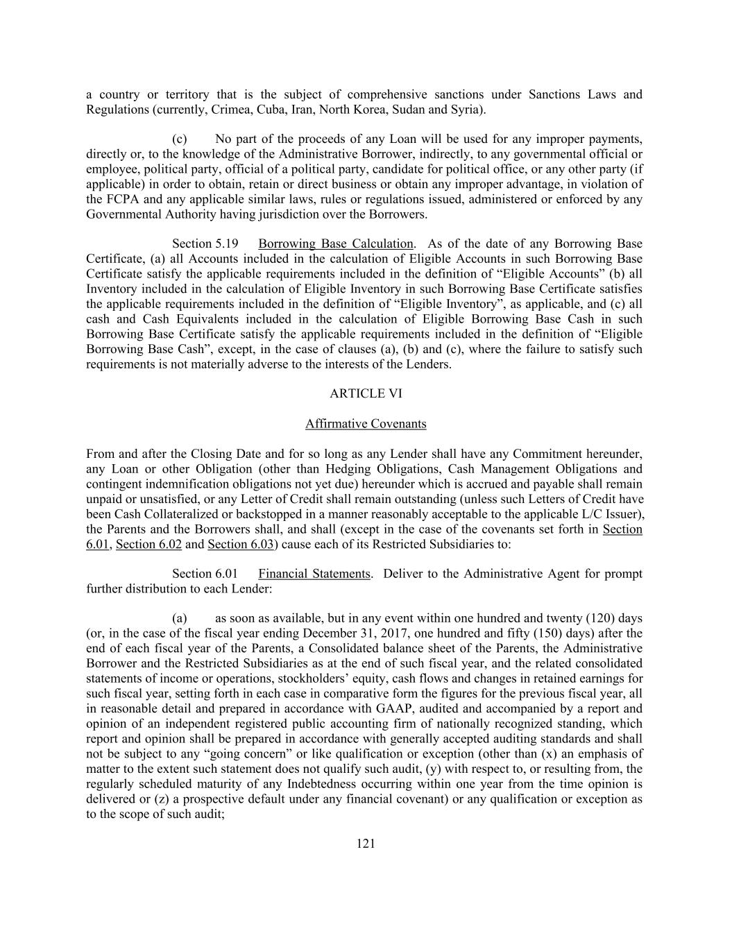 a country or territory that is the subject of comprehensive sanctions under Sanctions Laws and Regulations (currently, Crimea, Cuba, Iran, North Korea, Sudan and Syria). (c) No part of the proceeds of any Loan will be used for any improper payments, directly or, to the knowledge of the Administrative Borrower, indirectly, to any governmental official or employee, political party, official of a political party, candidate for political office, or any other party (if applicable) in order to obtain, retain or direct business or obtain any improper advantage, in violation of the FCPA and any applicable similar laws, rules or regulations issued, administered or enforced by any Governmental Authority having jurisdiction over the Borrowers. Section 5.19 Borrowing Base Calculation. As of the date of any Borrowing Base Certificate, (a) all Accounts included in the calculation of Eligible Accounts in such Borrowing Base Certificate satisfy the applicable requirements included in the definition of “Eligible Accounts” (b) all Inventory included in the calculation of Eligible Inventory in such Borrowing Base Certificate satisfies the applicable requirements included in the definition of “Eligible Inventory”, as applicable, and (c) all cash and Cash Equivalents included in the calculation of Eligible Borrowing Base Cash in such Borrowing Base Certificate satisfy the applicable requirements included in the definition of “Eligible Borrowing Base Cash”, except, in the case of clauses (a), (b) and (c), where the failure to satisfy such requirements is not materially adverse to the interests of the Lenders. ARTICLE VI Affirmative Covenants From and after the Closing Date and for so long as any Lender shall have any Commitment hereunder, any Loan or other Obligation (other than Hedging Obligations, Cash Management Obligations and contingent indemnification obligations not yet due) hereunder which is accrued and payable shall remain unpaid or unsatisfied, or any Letter of Credit shall remain outstanding (unless such Letters of Credit have been Cash Collateralized or backstopped in a manner reasonably acceptable to the applicable L/C Issuer), the Parents and the Borrowers shall, and shall (except in the case of the covenants set forth in Section 6.01, Section 6.02 and Section 6.03) cause each of its Restricted Subsidiaries to: Section 6.01 Financial Statements. Deliver to the Administrative Agent for prompt further distribution to each Lender: (a) as soon as available, but in any event within one hundred and twenty (120) days (or, in the case of the fiscal year ending December 31, 2017, one hundred and fifty (150) days) after the end of each fiscal year of the Parents, a Consolidated balance sheet of the Parents, the Administrative Borrower and the Restricted Subsidiaries as at the end of such fiscal year, and the related consolidated statements of income or operations, stockholders’ equity, cash flows and changes in retained earnings for such fiscal year, setting forth in each case in comparative form the figures for the previous fiscal year, all in reasonable detail and prepared in accordance with GAAP, audited and accompanied by a report and opinion of an independent registered public accounting firm of nationally recognized standing, which report and opinion shall be prepared in accordance with generally accepted auditing standards and shall not be subject to any “going concern” or like qualification or exception (other than (x) an emphasis of matter to the extent such statement does not qualify such audit, (y) with respect to, or resulting from, the regularly scheduled maturity of any Indebtedness occurring within one year from the time opinion is delivered or (z) a prospective default under any financial covenant) or any qualification or exception as to the scope of such audit; 121