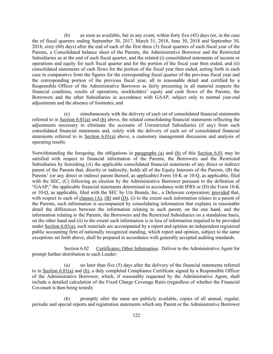 (b) as soon as available, but in any event, within forty five (45) days (or, in the case the of fiscal quarters ending September 30, 2017, March 31, 2018, June 30, 2018 and September 30, 2018, sixty (60) days) after the end of each of the first three (3) fiscal quarters of each fiscal year of the Parents, a Consolidated balance sheet of the Parents, the Administrative Borrower and the Restricted Subsidiaries as at the end of such fiscal quarter, and the related (i) consolidated statements of income or operations and equity for such fiscal quarter and for the portion of the fiscal year then ended, and (ii) consolidated statements of cash flows for the portion of the fiscal year then ended, setting forth in each case in comparative form the figures for the corresponding fiscal quarter of the previous fiscal year and the corresponding portion of the previous fiscal year, all in reasonable detail and certified by a Responsible Officer of the Administrative Borrower as fairly presenting in all material respects the financial condition, results of operations, stockholders’ equity and cash flows of the Parents, the Borrowers and the other Subsidiaries in accordance with GAAP, subject only to normal year-end adjustments and the absence of footnotes; and (c) simultaneously with the delivery of each set of consolidated financial statements referred to in Section 6.01(a) and (b) above, the related consolidating financial statements reflecting the adjustments necessary to eliminate the accounts of Unrestricted Subsidiaries (if any) from such consolidated financial statements and, solely with the delivery of each set of consolidated financial statements referred to in Section 6.01(a) above, a customary management discussion and analysis of operating results. Notwithstanding the foregoing, the obligations in paragraphs (a) and (b) of this Section 6.01 may be satisfied with respect to financial information of the Parents, the Borrowers and the Restricted Subsidiaries by furnishing (A) the applicable consolidated financial statements of any direct or indirect parent of the Parents that, directly or indirectly, holds all of the Equity Interests of the Parents, (B) the Parents’ (or any direct or indirect parent thereof, as applicable) Form 10-K or 10-Q, as applicable, filed with the SEC, (C) following an election by the Administrative Borrower pursuant to the definition of “GAAP,” the applicable financial statements determined in accordance with IFRS or (D) the Form 10-K or 10-Q, as applicable, filed with the SEC by Utz Brands, Inc., a Delaware corporation; provided that, with respect to each of clauses (A), (B) and (D), (i) to the extent such information relates to a parent of the Parents, such information is accompanied by consolidating information that explains in reasonable detail the differences between the information relating to such parent, on the one hand, and the information relating to the Parents, the Borrowers and the Restricted Subsidiaries on a standalone basis, on the other hand and (ii) to the extent such information is in lieu of information required to be provided under Section 6.01(a), such materials are accompanied by a report and opinion an independent registered public accounting firm of nationally recognized standing, which report and opinion, subject to the same exceptions set forth above, shall be prepared in accordance with generally accepted auditing standards. Section 6.02 Certificates; Other Information. Deliver to the Administrative Agent for prompt further distribution to each Lender: (a) no later than five (5) days after the delivery of the financial statements referred to in Section 6.01(a) and (b), a duly completed Compliance Certificate signed by a Responsible Officer of the Administrative Borrower, which, if reasonably requested by the Administrative Agent, shall include a detailed calculation of the Fixed Charge Coverage Ratio (regardless of whether the Financial Covenant is then being tested); (b) promptly after the same are publicly available, copies of all annual, regular, periodic and special reports and registration statements which any Parent or the Administrative Borrower 122