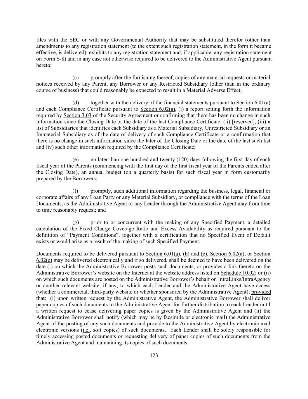 files with the SEC or with any Governmental Authority that may be substituted therefor (other than amendments to any registration statement (to the extent such registration statement, in the form it became effective, is delivered), exhibits to any registration statement and, if applicable, any registration statement on Form S-8) and in any case not otherwise required to be delivered to the Administrative Agent pursuant hereto; (c) promptly after the furnishing thereof, copies of any material requests or material notices received by any Parent, any Borrower or any Restricted Subsidiary (other than in the ordinary course of business) that could reasonably be expected to result in a Material Adverse Effect; (d) together with the delivery of the financial statements pursuant to Section 6.01(a) and each Compliance Certificate pursuant to Section 6.02(a), (i) a report setting forth the information required by Section 3.03 of the Security Agreement or confirming that there has been no change in such information since the Closing Date or the date of the last Compliance Certificate, (ii) [reserved], (iii) a list of Subsidiaries that identifies each Subsidiary as a Material Subsidiary, Unrestricted Subsidiary or an Immaterial Subsidiary as of the date of delivery of such Compliance Certificate or a confirmation that there is no change in such information since the later of the Closing Date or the date of the last such list and (iv) such other information required by the Compliance Certificate; (e) no later than one hundred and twenty (120) days following the first day of each fiscal year of the Parents (commencing with the first day of the first fiscal year of the Parents ended after the Closing Date), an annual budget (on a quarterly basis) for such fiscal year in form customarily prepared by the Borrowers; (f) promptly, such additional information regarding the business, legal, financial or corporate affairs of any Loan Party or any Material Subsidiary, or compliance with the terms of the Loan Documents, as the Administrative Agent or any Lender through the Administrative Agent may from time to time reasonably request; and (g) prior to or concurrent with the making of any Specified Payment, a detailed calculation of the Fixed Charge Coverage Ratio and Excess Availability as required pursuant to the definition of “Payment Conditions”, together with a certification that no Specified Event of Default exists or would arise as a result of the making of such Specified Payment. Documents required to be delivered pursuant to Section 6.01(a), (b) and (c), Section 6.02(a), or Section 6.02(c) may be delivered electronically and if so delivered, shall be deemed to have been delivered on the date (i) on which the Administrative Borrower posts such documents, or provides a link thereto on the Administrative Borrower’s website on the Internet at the website address listed on Schedule 10.02; or (ii) on which such documents are posted on the Administrative Borrower’s behalf on IntraLinks/IntraAgency or another relevant website, if any, to which each Lender and the Administrative Agent have access (whether a commercial, third-party website or whether sponsored by the Administrative Agent); provided that: (i) upon written request by the Administrative Agent, the Administrative Borrower shall deliver paper copies of such documents to the Administrative Agent for further distribution to each Lender until a written request to cease delivering paper copies is given by the Administrative Agent and (ii) the Administrative Borrower shall notify (which may be by facsimile or electronic mail) the Administrative Agent of the posting of any such documents and provide to the Administrative Agent by electronic mail electronic versions (i.e., soft copies) of such documents. Each Lender shall be solely responsible for timely accessing posted documents or requesting delivery of paper copies of such documents from the Administrative Agent and maintaining its copies of such documents. 123