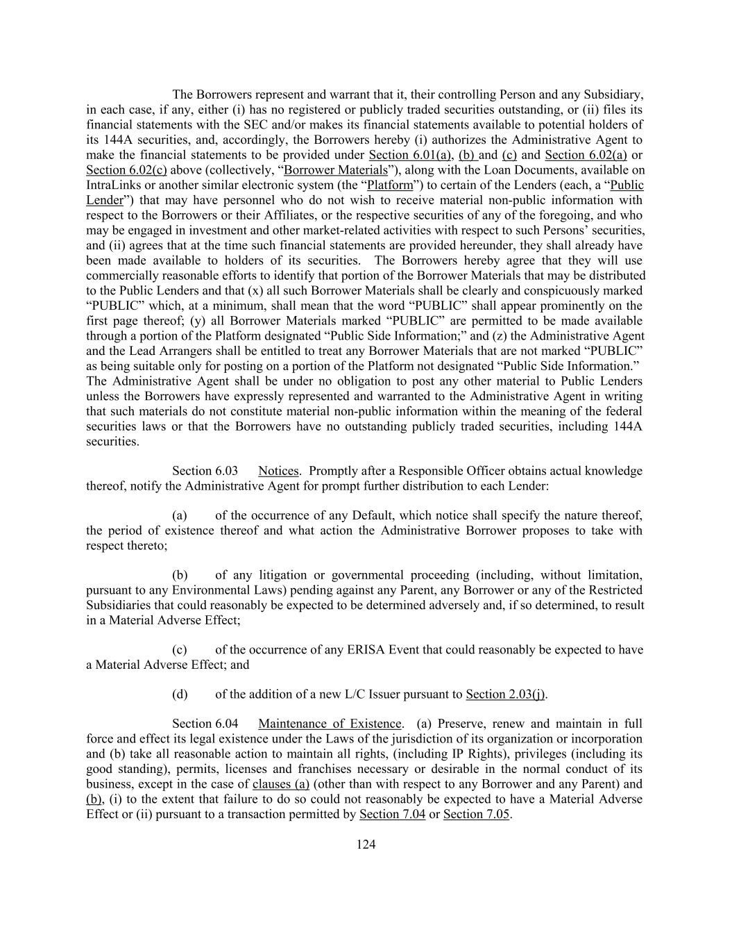 The Borrowers represent and warrant that it, their controlling Person and any Subsidiary, in each case, if any, either (i) has no registered or publicly traded securities outstanding, or (ii) files its financial statements with the SEC and/or makes its financial statements available to potential holders of its 144A securities, and, accordingly, the Borrowers hereby (i) authorizes the Administrative Agent to make the financial statements to be provided under Section 6.01(a), (b) and (c) and Section 6.02(a) or Section 6.02(c) above (collectively, “Borrower Materials”), along with the Loan Documents, available on IntraLinks or another similar electronic system (the “Platform”) to certain of the Lenders (each, a “Public Lender”) that may have personnel who do not wish to receive material non-public information with respect to the Borrowers or their Affiliates, or the respective securities of any of the foregoing, and who may be engaged in investment and other market-related activities with respect to such Persons’ securities, and (ii) agrees that at the time such financial statements are provided hereunder, they shall already have been made available to holders of its securities. The Borrowers hereby agree that they will use commercially reasonable efforts to identify that portion of the Borrower Materials that may be distributed to the Public Lenders and that (x) all such Borrower Materials shall be clearly and conspicuously marked “PUBLIC” which, at a minimum, shall mean that the word “PUBLIC” shall appear prominently on the first page thereof; (y) all Borrower Materials marked “PUBLIC” are permitted to be made available through a portion of the Platform designated “Public Side Information;” and (z) the Administrative Agent and the Lead Arrangers shall be entitled to treat any Borrower Materials that are not marked “PUBLIC” as being suitable only for posting on a portion of the Platform not designated “Public Side Information.” The Administrative Agent shall be under no obligation to post any other material to Public Lenders unless the Borrowers have expressly represented and warranted to the Administrative Agent in writing that such materials do not constitute material non-public information within the meaning of the federal securities laws or that the Borrowers have no outstanding publicly traded securities, including 144A securities. Section 6.03 Notices. Promptly after a Responsible Officer obtains actual knowledge thereof, notify the Administrative Agent for prompt further distribution to each Lender: (a) of the occurrence of any Default, which notice shall specify the nature thereof, the period of existence thereof and what action the Administrative Borrower proposes to take with respect thereto; (b) of any litigation or governmental proceeding (including, without limitation, pursuant to any Environmental Laws) pending against any Parent, any Borrower or any of the Restricted Subsidiaries that could reasonably be expected to be determined adversely and, if so determined, to result in a Material Adverse Effect; (c) of the occurrence of any ERISA Event that could reasonably be expected to have a Material Adverse Effect; and (d) of the addition of a new L/C Issuer pursuant to Section 2.03(j). Section 6.04 Maintenance of Existence. (a) Preserve, renew and maintain in full force and effect its legal existence under the Laws of the jurisdiction of its organization or incorporation and (b) take all reasonable action to maintain all rights, (including IP Rights), privileges (including its good standing), permits, licenses and franchises necessary or desirable in the normal conduct of its business, except in the case of clauses (a) (other than with respect to any Borrower and any Parent) and (b), (i) to the extent that failure to do so could not reasonably be expected to have a Material Adverse Effect or (ii) pursuant to a transaction permitted by Section 7.04 or Section 7.05. 124