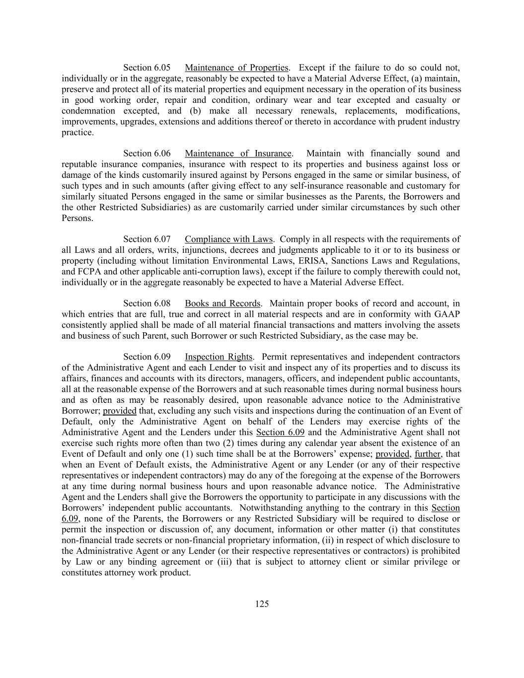 Section 6.05 Maintenance of Properties. Except if the failure to do so could not, individually or in the aggregate, reasonably be expected to have a Material Adverse Effect, (a) maintain, preserve and protect all of its material properties and equipment necessary in the operation of its business in good working order, repair and condition, ordinary wear and tear excepted and casualty or condemnation excepted, and (b) make all necessary renewals, replacements, modifications, improvements, upgrades, extensions and additions thereof or thereto in accordance with prudent industry practice. Section 6.06 Maintenance of Insurance. Maintain with financially sound and reputable insurance companies, insurance with respect to its properties and business against loss or damage of the kinds customarily insured against by Persons engaged in the same or similar business, of such types and in such amounts (after giving effect to any self-insurance reasonable and customary for similarly situated Persons engaged in the same or similar businesses as the Parents, the Borrowers and the other Restricted Subsidiaries) as are customarily carried under similar circumstances by such other Persons. Section 6.07 Compliance with Laws. Comply in all respects with the requirements of all Laws and all orders, writs, injunctions, decrees and judgments applicable to it or to its business or property (including without limitation Environmental Laws, ERISA, Sanctions Laws and Regulations, and FCPA and other applicable anti-corruption laws), except if the failure to comply therewith could not, individually or in the aggregate reasonably be expected to have a Material Adverse Effect. Section 6.08 Books and Records. Maintain proper books of record and account, in which entries that are full, true and correct in all material respects and are in conformity with GAAP consistently applied shall be made of all material financial transactions and matters involving the assets and business of such Parent, such Borrower or such Restricted Subsidiary, as the case may be. Section 6.09 Inspection Rights. Permit representatives and independent contractors of the Administrative Agent and each Lender to visit and inspect any of its properties and to discuss its affairs, finances and accounts with its directors, managers, officers, and independent public accountants, all at the reasonable expense of the Borrowers and at such reasonable times during normal business hours and as often as may be reasonably desired, upon reasonable advance notice to the Administrative Borrower; provided that, excluding any such visits and inspections during the continuation of an Event of Default, only the Administrative Agent on behalf of the Lenders may exercise rights of the Administrative Agent and the Lenders under this Section 6.09 and the Administrative Agent shall not exercise such rights more often than two (2) times during any calendar year absent the existence of an Event of Default and only one (1) such time shall be at the Borrowers’ expense; provided, further, that when an Event of Default exists, the Administrative Agent or any Lender (or any of their respective representatives or independent contractors) may do any of the foregoing at the expense of the Borrowers at any time during normal business hours and upon reasonable advance notice. The Administrative Agent and the Lenders shall give the Borrowers the opportunity to participate in any discussions with the Borrowers’ independent public accountants. Notwithstanding anything to the contrary in this Section 6.09, none of the Parents, the Borrowers or any Restricted Subsidiary will be required to disclose or permit the inspection or discussion of, any document, information or other matter (i) that constitutes non-financial trade secrets or non-financial proprietary information, (ii) in respect of which disclosure to the Administrative Agent or any Lender (or their respective representatives or contractors) is prohibited by Law or any binding agreement or (iii) that is subject to attorney client or similar privilege or constitutes attorney work product. 125