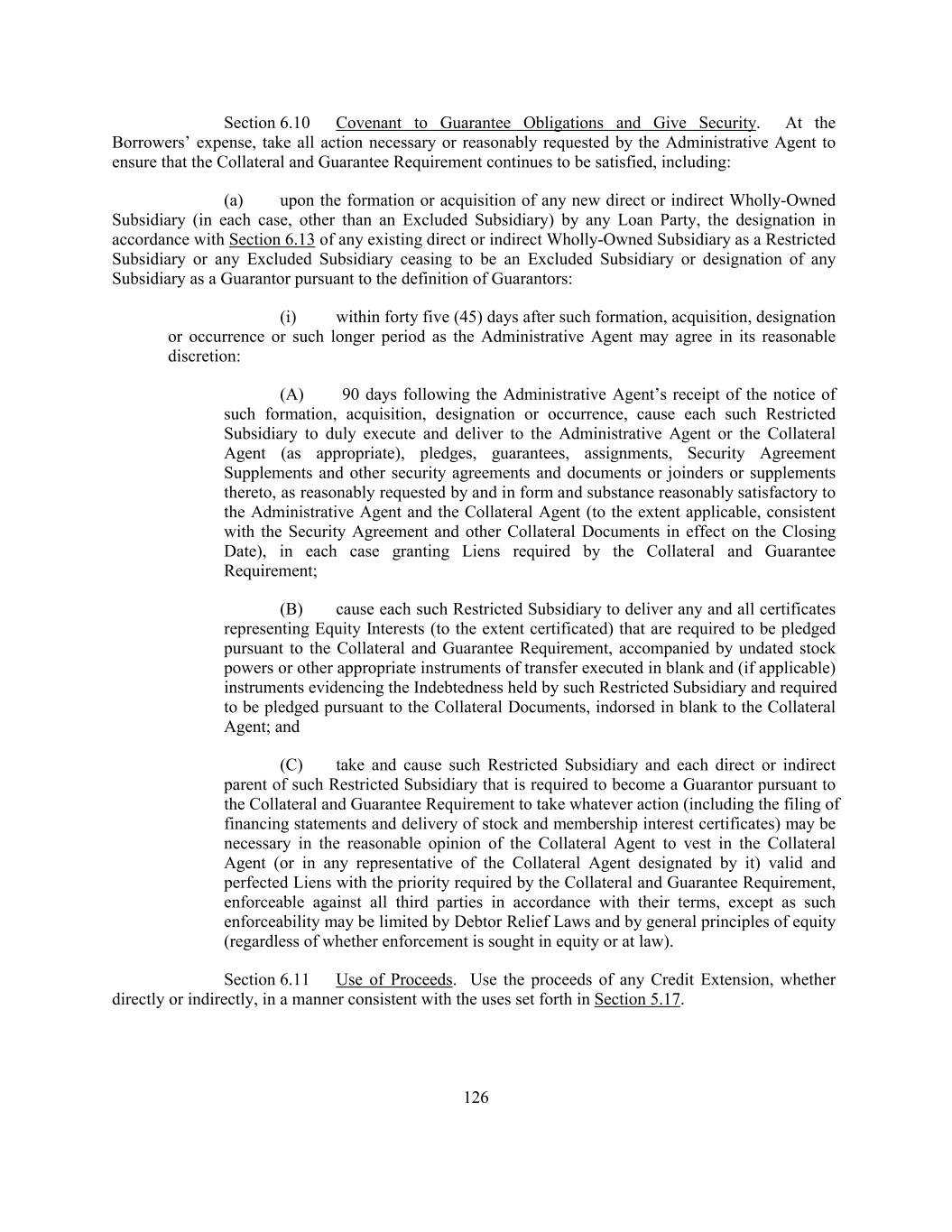 Section 6.10 Covenant to Guarantee Obligations and Give Security. At the Borrowers’ expense, take all action necessary or reasonably requested by the Administrative Agent to ensure that the Collateral and Guarantee Requirement continues to be satisfied, including: (a) upon the formation or acquisition of any new direct or indirect Wholly-Owned Subsidiary (in each case, other than an Excluded Subsidiary) by any Loan Party, the designation in accordance with Section 6.13 of any existing direct or indirect Wholly-Owned Subsidiary as a Restricted Subsidiary or any Excluded Subsidiary ceasing to be an Excluded Subsidiary or designation of any Subsidiary as a Guarantor pursuant to the definition of Guarantors: (i) within forty five (45) days after such formation, acquisition, designation or occurrence or such longer period as the Administrative Agent may agree in its reasonable discretion: (A) 90 days following the Administrative Agent’s receipt of the notice of such formation, acquisition, designation or occurrence, cause each such Restricted Subsidiary to duly execute and deliver to the Administrative Agent or the Collateral Agent (as appropriate), pledges, guarantees, assignments, Security Agreement Supplements and other security agreements and documents or joinders or supplements thereto, as reasonably requested by and in form and substance reasonably satisfactory to the Administrative Agent and the Collateral Agent (to the extent applicable, consistent with the Security Agreement and other Collateral Documents in effect on the Closing Date), in each case granting Liens required by the Collateral and Guarantee Requirement; (B) cause each such Restricted Subsidiary to deliver any and all certificates representing Equity Interests (to the extent certificated) that are required to be pledged pursuant to the Collateral and Guarantee Requirement, accompanied by undated stock powers or other appropriate instruments of transfer executed in blank and (if applicable) instruments evidencing the Indebtedness held by such Restricted Subsidiary and required to be pledged pursuant to the Collateral Documents, indorsed in blank to the Collateral Agent; and (C) take and cause such Restricted Subsidiary and each direct or indirect parent of such Restricted Subsidiary that is required to become a Guarantor pursuant to the Collateral and Guarantee Requirement to take whatever action (including the filing of financing statements and delivery of stock and membership interest certificates) may be necessary in the reasonable opinion of the Collateral Agent to vest in the Collateral Agent (or in any representative of the Collateral Agent designated by it) valid and perfected Liens with the priority required by the Collateral and Guarantee Requirement, enforceable against all third parties in accordance with their terms, except as such enforceability may be limited by Debtor Relief Laws and by general principles of equity (regardless of whether enforcement is sought in equity or at law). Section 6.11 Use of Proceeds. Use the proceeds of any Credit Extension, whether directly or indirectly, in a manner consistent with the uses set forth in Section 5.17. 126