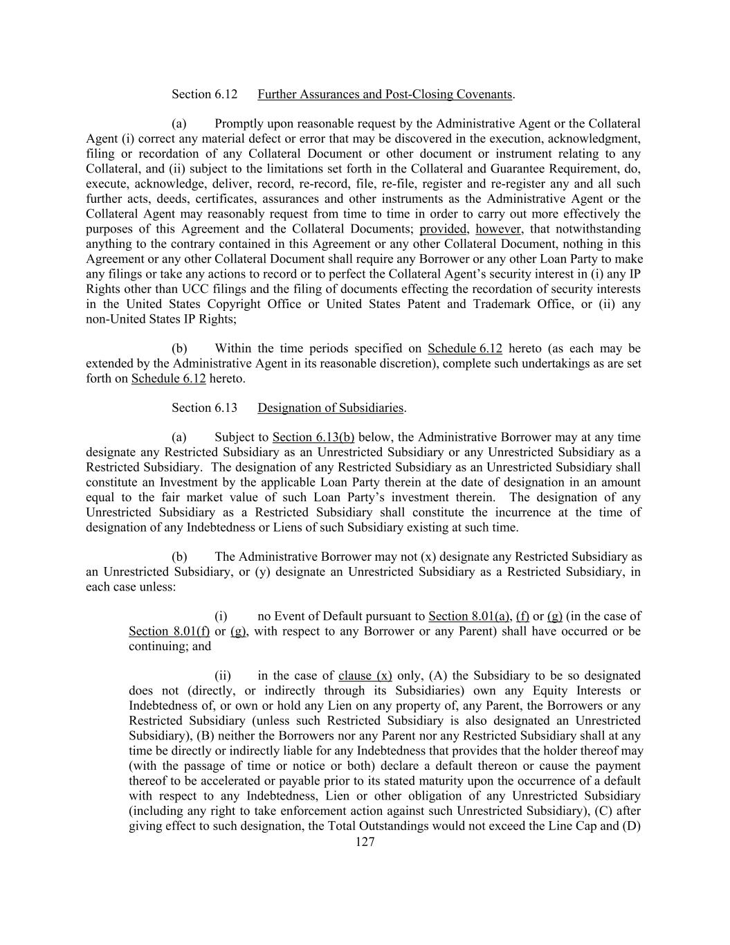 Section 6.12 Further Assurances and Post-Closing Covenants. (a) Promptly upon reasonable request by the Administrative Agent or the Collateral Agent (i) correct any material defect or error that may be discovered in the execution, acknowledgment, filing or recordation of any Collateral Document or other document or instrument relating to any Collateral, and (ii) subject to the limitations set forth in the Collateral and Guarantee Requirement, do, execute, acknowledge, deliver, record, re-record, file, re-file, register and re-register any and all such further acts, deeds, certificates, assurances and other instruments as the Administrative Agent or the Collateral Agent may reasonably request from time to time in order to carry out more effectively the purposes of this Agreement and the Collateral Documents; provided, however, that notwithstanding anything to the contrary contained in this Agreement or any other Collateral Document, nothing in this Agreement or any other Collateral Document shall require any Borrower or any other Loan Party to make any filings or take any actions to record or to perfect the Collateral Agent’s security interest in (i) any IP Rights other than UCC filings and the filing of documents effecting the recordation of security interests in the United States Copyright Office or United States Patent and Trademark Office, or (ii) any non-United States IP Rights; (b) Within the time periods specified on Schedule 6.12 hereto (as each may be extended by the Administrative Agent in its reasonable discretion), complete such undertakings as are set forth on Schedule 6.12 hereto. Section 6.13 Designation of Subsidiaries. (a) Subject to Section 6.13(b) below, the Administrative Borrower may at any time designate any Restricted Subsidiary as an Unrestricted Subsidiary or any Unrestricted Subsidiary as a Restricted Subsidiary. The designation of any Restricted Subsidiary as an Unrestricted Subsidiary shall constitute an Investment by the applicable Loan Party therein at the date of designation in an amount equal to the fair market value of such Loan Party’s investment therein. The designation of any Unrestricted Subsidiary as a Restricted Subsidiary shall constitute the incurrence at the time of designation of any Indebtedness or Liens of such Subsidiary existing at such time. (b) The Administrative Borrower may not (x) designate any Restricted Subsidiary as an Unrestricted Subsidiary, or (y) designate an Unrestricted Subsidiary as a Restricted Subsidiary, in each case unless: (i) no Event of Default pursuant to Section 8.01(a), (f) or (g) (in the case of Section 8.01(f) or (g), with respect to any Borrower or any Parent) shall have occurred or be continuing; and (ii) in the case of clause (x) only, (A) the Subsidiary to be so designated does not (directly, or indirectly through its Subsidiaries) own any Equity Interests or Indebtedness of, or own or hold any Lien on any property of, any Parent, the Borrowers or any Restricted Subsidiary (unless such Restricted Subsidiary is also designated an Unrestricted Subsidiary), (B) neither the Borrowers nor any Parent nor any Restricted Subsidiary shall at any time be directly or indirectly liable for any Indebtedness that provides that the holder thereof may (with the passage of time or notice or both) declare a default thereon or cause the payment thereof to be accelerated or payable prior to its stated maturity upon the occurrence of a default with respect to any Indebtedness, Lien or other obligation of any Unrestricted Subsidiary (including any right to take enforcement action against such Unrestricted Subsidiary), (C) after giving effect to such designation, the Total Outstandings would not exceed the Line Cap and (D) 127