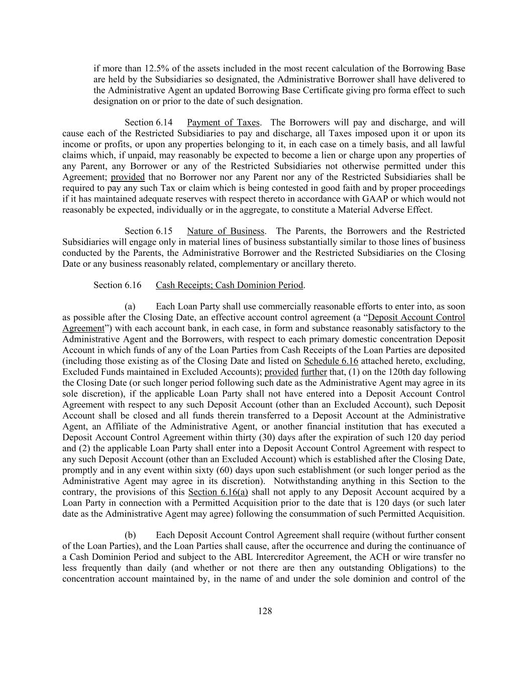 if more than 12.5% of the assets included in the most recent calculation of the Borrowing Base are held by the Subsidiaries so designated, the Administrative Borrower shall have delivered to the Administrative Agent an updated Borrowing Base Certificate giving pro forma effect to such designation on or prior to the date of such designation. Section 6.14 Payment of Taxes. The Borrowers will pay and discharge, and will cause each of the Restricted Subsidiaries to pay and discharge, all Taxes imposed upon it or upon its income or profits, or upon any properties belonging to it, in each case on a timely basis, and all lawful claims which, if unpaid, may reasonably be expected to become a lien or charge upon any properties of any Parent, any Borrower or any of the Restricted Subsidiaries not otherwise permitted under this Agreement; provided that no Borrower nor any Parent nor any of the Restricted Subsidiaries shall be required to pay any such Tax or claim which is being contested in good faith and by proper proceedings if it has maintained adequate reserves with respect thereto in accordance with GAAP or which would not reasonably be expected, individually or in the aggregate, to constitute a Material Adverse Effect. Section 6.15 Nature of Business. The Parents, the Borrowers and the Restricted Subsidiaries will engage only in material lines of business substantially similar to those lines of business conducted by the Parents, the Administrative Borrower and the Restricted Subsidiaries on the Closing Date or any business reasonably related, complementary or ancillary thereto. Section 6.16 Cash Receipts; Cash Dominion Period. (a) Each Loan Party shall use commercially reasonable efforts to enter into, as soon as possible after the Closing Date, an effective account control agreement (a “Deposit Account Control Agreement”) with each account bank, in each case, in form and substance reasonably satisfactory to the Administrative Agent and the Borrowers, with respect to each primary domestic concentration Deposit Account in which funds of any of the Loan Parties from Cash Receipts of the Loan Parties are deposited (including those existing as of the Closing Date and listed on Schedule 6.16 attached hereto, excluding, Excluded Funds maintained in Excluded Accounts); provided further that, (1) on the 120th day following the Closing Date (or such longer period following such date as the Administrative Agent may agree in its sole discretion), if the applicable Loan Party shall not have entered into a Deposit Account Control Agreement with respect to any such Deposit Account (other than an Excluded Account), such Deposit Account shall be closed and all funds therein transferred to a Deposit Account at the Administrative Agent, an Affiliate of the Administrative Agent, or another financial institution that has executed a Deposit Account Control Agreement within thirty (30) days after the expiration of such 120 day period and (2) the applicable Loan Party shall enter into a Deposit Account Control Agreement with respect to any such Deposit Account (other than an Excluded Account) which is established after the Closing Date, promptly and in any event within sixty (60) days upon such establishment (or such longer period as the Administrative Agent may agree in its discretion). Notwithstanding anything in this Section to the contrary, the provisions of this Section 6.16(a) shall not apply to any Deposit Account acquired by a Loan Party in connection with a Permitted Acquisition prior to the date that is 120 days (or such later date as the Administrative Agent may agree) following the consummation of such Permitted Acquisition. (b) Each Deposit Account Control Agreement shall require (without further consent of the Loan Parties), and the Loan Parties shall cause, after the occurrence and during the continuance of a Cash Dominion Period and subject to the ABL Intercreditor Agreement, the ACH or wire transfer no less frequently than daily (and whether or not there are then any outstanding Obligations) to the concentration account maintained by, in the name of and under the sole dominion and control of the 128