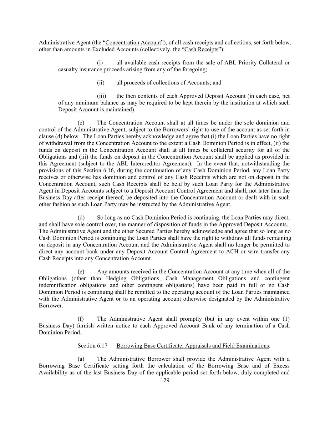 Administrative Agent (the “Concentration Account”), of all cash receipts and collections, set forth below, other than amounts in Excluded Accounts (collectively, the “Cash Receipts”): (i) all available cash receipts from the sale of ABL Priority Collateral or casualty insurance proceeds arising from any of the foregoing; (ii) all proceeds of collections of Accounts; and (iii) the then contents of each Approved Deposit Account (in each case, net of any minimum balance as may be required to be kept therein by the institution at which such Deposit Account is maintained). (c) The Concentration Account shall at all times be under the sole dominion and control of the Administrative Agent, subject to the Borrowers’ right to use of the account as set forth in clause (d) below. The Loan Parties hereby acknowledge and agree that (i) the Loan Parties have no right of withdrawal from the Concentration Account to the extent a Cash Dominion Period is in effect, (ii) the funds on deposit in the Concentration Account shall at all times be collateral security for all of the Obligations and (iii) the funds on deposit in the Concentration Account shall be applied as provided in this Agreement (subject to the ABL Intercreditor Agreement). In the event that, notwithstanding the provisions of this Section 6.16, during the continuation of any Cash Dominion Period, any Loan Party receives or otherwise has dominion and control of any Cash Receipts which are not on deposit in the Concentration Account, such Cash Receipts shall be held by such Loan Party for the Administrative Agent in Deposit Accounts subject to a Deposit Account Control Agreement and shall, not later than the Business Day after receipt thereof, be deposited into the Concentration Account or dealt with in such other fashion as such Loan Party may be instructed by the Administrative Agent. (d) So long as no Cash Dominion Period is continuing, the Loan Parties may direct, and shall have sole control over, the manner of disposition of funds in the Approved Deposit Accounts. The Administrative Agent and the other Secured Parties hereby acknowledge and agree that so long as no Cash Dominion Period is continuing the Loan Parties shall have the right to withdraw all funds remaining on deposit in any Concentration Account and the Administrative Agent shall no longer be permitted to direct any account bank under any Deposit Account Control Agreement to ACH or wire transfer any Cash Receipts into any Concentration Account. (e) Any amounts received in the Concentration Account at any time when all of the Obligations (other than Hedging Obligations, Cash Management Obligations and contingent indemnification obligations and other contingent obligations) have been paid in full or no Cash Dominion Period is continuing shall be remitted to the operating account of the Loan Parties maintained with the Administrative Agent or to an operating account otherwise designated by the Administrative Borrower. (f) The Administrative Agent shall promptly (but in any event within one (1) Business Day) furnish written notice to each Approved Account Bank of any termination of a Cash Dominion Period. Section 6.17 Borrowing Base Certificate; Appraisals and Field Examinations. (a) The Administrative Borrower shall provide the Administrative Agent with a Borrowing Base Certificate setting forth the calculation of the Borrowing Base and of Excess Availability as of the last Business Day of the applicable period set forth below, duly completed and 129