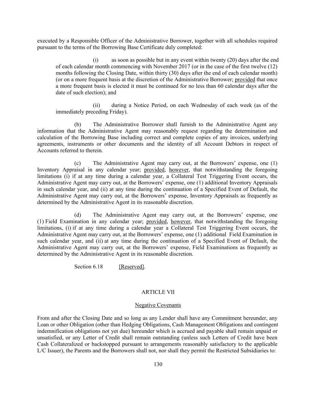 executed by a Responsible Officer of the Administrative Borrower, together with all schedules required pursuant to the terms of the Borrowing Base Certificate duly completed: (i) as soon as possible but in any event within twenty (20) days after the end of each calendar month commencing with November 2017 (or in the case of the first twelve (12) months following the Closing Date, within thirty (30) days after the end of each calendar month) (or on a more frequent basis at the discretion of the Administrative Borrower; provided that once a more frequent basis is elected it must be continued for no less than 60 calendar days after the date of such election); and (ii) during a Notice Period, on each Wednesday of each week (as of the immediately preceding Friday). (b) The Administrative Borrower shall furnish to the Administrative Agent any information that the Administrative Agent may reasonably request regarding the determination and calculation of the Borrowing Base including correct and complete copies of any invoices, underlying agreements, instruments or other documents and the identity of all Account Debtors in respect of Accounts referred to therein. (c) The Administrative Agent may carry out, at the Borrowers’ expense, one (1) Inventory Appraisal in any calendar year; provided, however, that notwithstanding the foregoing limitations (i) if at any time during a calendar year, a Collateral Test Triggering Event occurs, the Administrative Agent may carry out, at the Borrowers’ expense, one (1) additional Inventory Appraisals in such calendar year, and (ii) at any time during the continuation of a Specified Event of Default, the Administrative Agent may carry out, at the Borrowers’ expense, Inventory Appraisals as frequently as determined by the Administrative Agent in its reasonable discretion. (d) The Administrative Agent may carry out, at the Borrowers’ expense, one (1) Field Examination in any calendar year; provided, however, that notwithstanding the foregoing limitations, (i) if at any time during a calendar year a Collateral Test Triggering Event occurs, the Administrative Agent may carry out, at the Borrowers’ expense, one (1) additional Field Examination in such calendar year, and (ii) at any time during the continuation of a Specified Event of Default, the Administrative Agent may carry out, at the Borrowers’ expense, Field Examinations as frequently as determined by the Administrative Agent in its reasonable discretion. Section 6.18 [Reserved]. ARTICLE VII Negative Covenants From and after the Closing Date and so long as any Lender shall have any Commitment hereunder, any Loan or other Obligation (other than Hedging Obligations, Cash Management Obligations and contingent indemnification obligations not yet due) hereunder which is accrued and payable shall remain unpaid or unsatisfied, or any Letter of Credit shall remain outstanding (unless such Letters of Credit have been Cash Collateralized or backstopped pursuant to arrangements reasonably satisfactory to the applicable L/C Issuer), the Parents and the Borrowers shall not, nor shall they permit the Restricted Subsidiaries to: 130