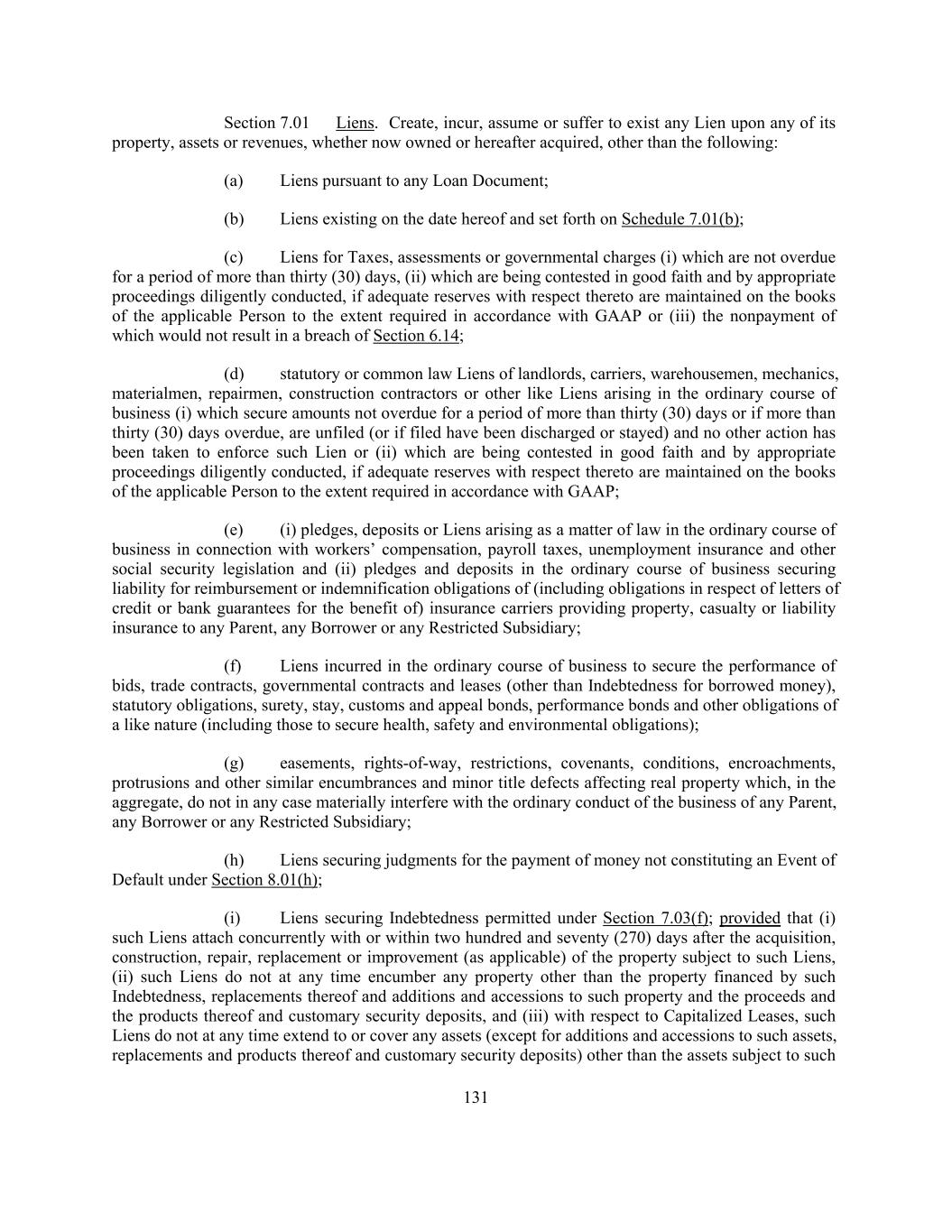 Section 7.01 Liens. Create, incur, assume or suffer to exist any Lien upon any of its property, assets or revenues, whether now owned or hereafter acquired, other than the following: (a) Liens pursuant to any Loan Document; (b) Liens existing on the date hereof and set forth on Schedule 7.01(b); (c) Liens for Taxes, assessments or governmental charges (i) which are not overdue for a period of more than thirty (30) days, (ii) which are being contested in good faith and by appropriate proceedings diligently conducted, if adequate reserves with respect thereto are maintained on the books of the applicable Person to the extent required in accordance with GAAP or (iii) the nonpayment of which would not result in a breach of Section 6.14; (d) statutory or common law Liens of landlords, carriers, warehousemen, mechanics, materialmen, repairmen, construction contractors or other like Liens arising in the ordinary course of business (i) which secure amounts not overdue for a period of more than thirty (30) days or if more than thirty (30) days overdue, are unfiled (or if filed have been discharged or stayed) and no other action has been taken to enforce such Lien or (ii) which are being contested in good faith and by appropriate proceedings diligently conducted, if adequate reserves with respect thereto are maintained on the books of the applicable Person to the extent required in accordance with GAAP; (e) (i) pledges, deposits or Liens arising as a matter of law in the ordinary course of business in connection with workers’ compensation, payroll taxes, unemployment insurance and other social security legislation and (ii) pledges and deposits in the ordinary course of business securing liability for reimbursement or indemnification obligations of (including obligations in respect of letters of credit or bank guarantees for the benefit of) insurance carriers providing property, casualty or liability insurance to any Parent, any Borrower or any Restricted Subsidiary; (f) Liens incurred in the ordinary course of business to secure the performance of bids, trade contracts, governmental contracts and leases (other than Indebtedness for borrowed money), statutory obligations, surety, stay, customs and appeal bonds, performance bonds and other obligations of a like nature (including those to secure health, safety and environmental obligations); (g) easements, rights-of-way, restrictions, covenants, conditions, encroachments, protrusions and other similar encumbrances and minor title defects affecting real property which, in the aggregate, do not in any case materially interfere with the ordinary conduct of the business of any Parent, any Borrower or any Restricted Subsidiary; (h) Liens securing judgments for the payment of money not constituting an Event of Default under Section 8.01(h); (i) Liens securing Indebtedness permitted under Section 7.03(f); provided that (i) such Liens attach concurrently with or within two hundred and seventy (270) days after the acquisition, construction, repair, replacement or improvement (as applicable) of the property subject to such Liens, (ii) such Liens do not at any time encumber any property other than the property financed by such Indebtedness, replacements thereof and additions and accessions to such property and the proceeds and the products thereof and customary security deposits, and (iii) with respect to Capitalized Leases, such Liens do not at any time extend to or cover any assets (except for additions and accessions to such assets, replacements and products thereof and customary security deposits) other than the assets subject to such 131