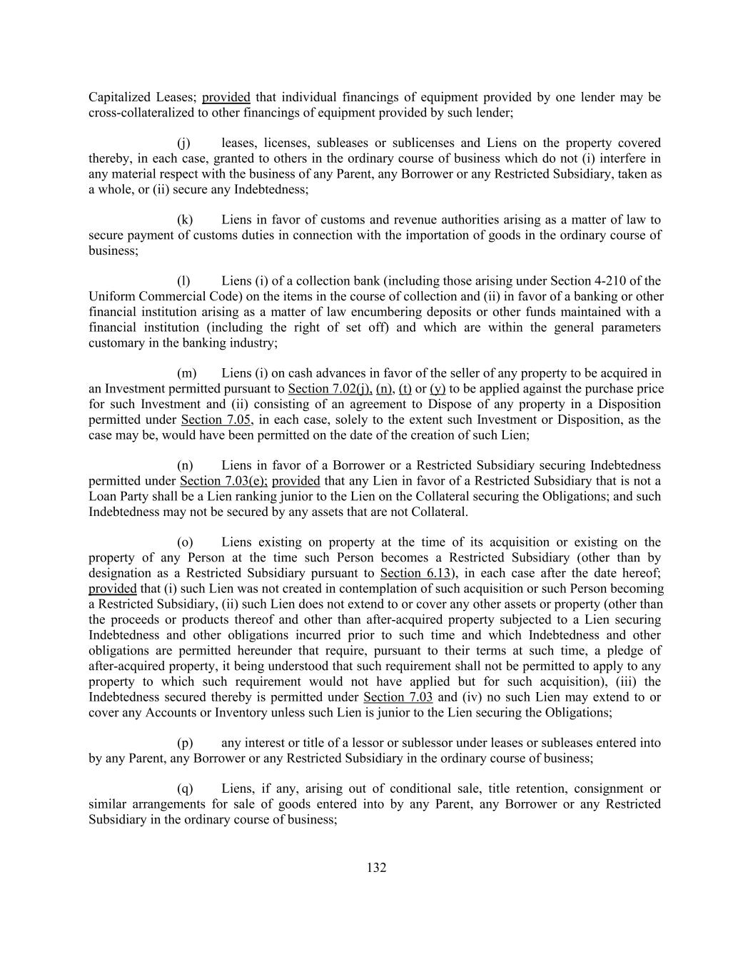 Capitalized Leases; provided that individual financings of equipment provided by one lender may be cross-collateralized to other financings of equipment provided by such lender; (j) leases, licenses, subleases or sublicenses and Liens on the property covered thereby, in each case, granted to others in the ordinary course of business which do not (i) interfere in any material respect with the business of any Parent, any Borrower or any Restricted Subsidiary, taken as a whole, or (ii) secure any Indebtedness; (k) Liens in favor of customs and revenue authorities arising as a matter of law to secure payment of customs duties in connection with the importation of goods in the ordinary course of business; (l) Liens (i) of a collection bank (including those arising under Section 4-210 of the Uniform Commercial Code) on the items in the course of collection and (ii) in favor of a banking or other financial institution arising as a matter of law encumbering deposits or other funds maintained with a financial institution (including the right of set off) and which are within the general parameters customary in the banking industry; (m) Liens (i) on cash advances in favor of the seller of any property to be acquired in an Investment permitted pursuant to Section 7.02(j), (n), (t) or (y) to be applied against the purchase price for such Investment and (ii) consisting of an agreement to Dispose of any property in a Disposition permitted under Section 7.05, in each case, solely to the extent such Investment or Disposition, as the case may be, would have been permitted on the date of the creation of such Lien; (n) Liens in favor of a Borrower or a Restricted Subsidiary securing Indebtedness permitted under Section 7.03(e); provided that any Lien in favor of a Restricted Subsidiary that is not a Loan Party shall be a Lien ranking junior to the Lien on the Collateral securing the Obligations; and such Indebtedness may not be secured by any assets that are not Collateral. (o) Liens existing on property at the time of its acquisition or existing on the property of any Person at the time such Person becomes a Restricted Subsidiary (other than by designation as a Restricted Subsidiary pursuant to Section 6.13), in each case after the date hereof; provided that (i) such Lien was not created in contemplation of such acquisition or such Person becoming a Restricted Subsidiary, (ii) such Lien does not extend to or cover any other assets or property (other than the proceeds or products thereof and other than after-acquired property subjected to a Lien securing Indebtedness and other obligations incurred prior to such time and which Indebtedness and other obligations are permitted hereunder that require, pursuant to their terms at such time, a pledge of after-acquired property, it being understood that such requirement shall not be permitted to apply to any property to which such requirement would not have applied but for such acquisition), (iii) the Indebtedness secured thereby is permitted under Section 7.03 and (iv) no such Lien may extend to or cover any Accounts or Inventory unless such Lien is junior to the Lien securing the Obligations; (p) any interest or title of a lessor or sublessor under leases or subleases entered into by any Parent, any Borrower or any Restricted Subsidiary in the ordinary course of business; (q) Liens, if any, arising out of conditional sale, title retention, consignment or similar arrangements for sale of goods entered into by any Parent, any Borrower or any Restricted Subsidiary in the ordinary course of business; 132