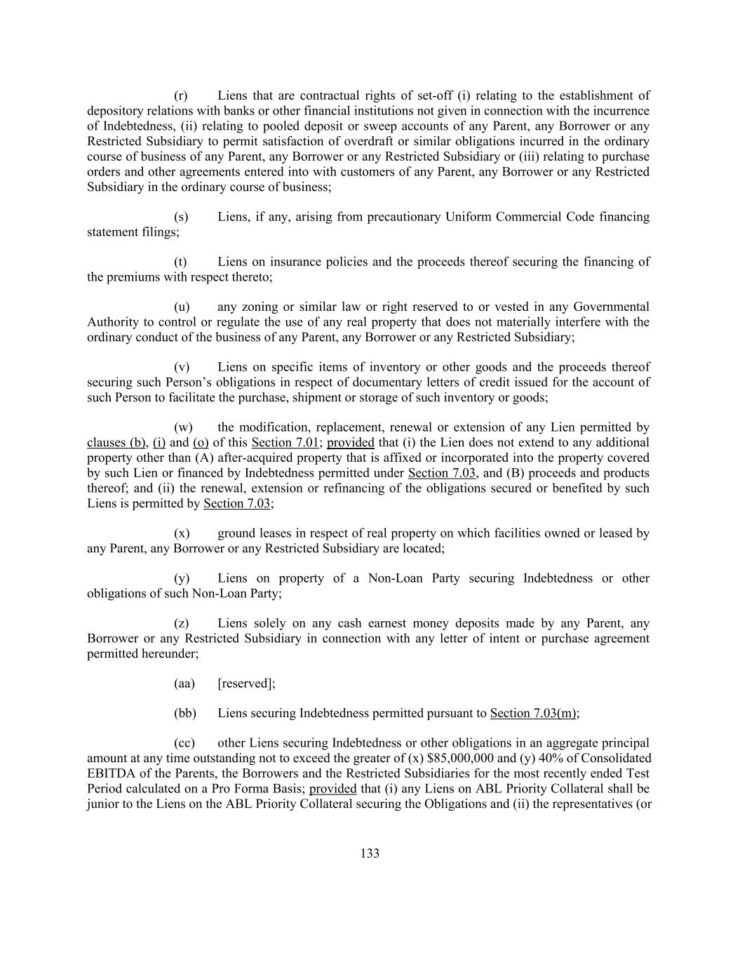 (r) Liens that are contractual rights of set-off (i) relating to the establishment of depository relations with banks or other financial institutions not given in connection with the incurrence of Indebtedness, (ii) relating to pooled deposit or sweep accounts of any Parent, any Borrower or any Restricted Subsidiary to permit satisfaction of overdraft or similar obligations incurred in the ordinary course of business of any Parent, any Borrower or any Restricted Subsidiary or (iii) relating to purchase orders and other agreements entered into with customers of any Parent, any Borrower or any Restricted Subsidiary in the ordinary course of business; (s) Liens, if any, arising from precautionary Uniform Commercial Code financing statement filings; (t) Liens on insurance policies and the proceeds thereof securing the financing of the premiums with respect thereto; (u) any zoning or similar law or right reserved to or vested in any Governmental Authority to control or regulate the use of any real property that does not materially interfere with the ordinary conduct of the business of any Parent, any Borrower or any Restricted Subsidiary; (v) Liens on specific items of inventory or other goods and the proceeds thereof securing such Person’s obligations in respect of documentary letters of credit issued for the account of such Person to facilitate the purchase, shipment or storage of such inventory or goods; (w) the modification, replacement, renewal or extension of any Lien permitted by clauses (b), (i) and (o) of this Section 7.01; provided that (i) the Lien does not extend to any additional property other than (A) after-acquired property that is affixed or incorporated into the property covered by such Lien or financed by Indebtedness permitted under Section 7.03, and (B) proceeds and products thereof; and (ii) the renewal, extension or refinancing of the obligations secured or benefited by such Liens is permitted by Section 7.03; (x) ground leases in respect of real property on which facilities owned or leased by any Parent, any Borrower or any Restricted Subsidiary are located; (y) Liens on property of a Non-Loan Party securing Indebtedness or other obligations of such Non-Loan Party; (z) Liens solely on any cash earnest money deposits made by any Parent, any Borrower or any Restricted Subsidiary in connection with any letter of intent or purchase agreement permitted hereunder; (aa) [reserved]; (bb) Liens securing Indebtedness permitted pursuant to Section 7.03(m); (cc) other Liens securing Indebtedness or other obligations in an aggregate principal amount at any time outstanding not to exceed the greater of (x) $85,000,000 and (y) 40% of Consolidated EBITDA of the Parents, the Borrowers and the Restricted Subsidiaries for the most recently ended Test Period calculated on a Pro Forma Basis; provided that (i) any Liens on ABL Priority Collateral shall be junior to the Liens on the ABL Priority Collateral securing the Obligations and (ii) the representatives (or 133