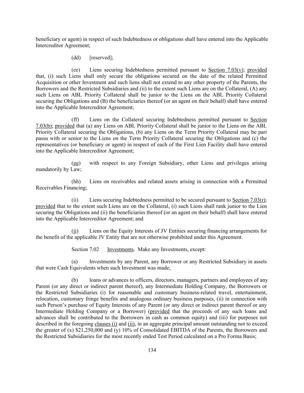 beneficiary or agent) in respect of such Indebtedness or obligations shall have entered into the Applicable Intercreditor Agreement; (dd) [reserved]; (ee) Liens securing Indebtedness permitted pursuant to Section 7.03(v); provided that, (i) such Liens shall only secure the obligations secured on the date of the related Permitted Acquisition or other Investment and such liens shall not extend to any other property of the Parents, the Borrowers and the Restricted Subsidiaries and (ii) to the extent such Liens are on the Collateral, (A) any such Liens on ABL Priority Collateral shall be junior to the Liens on the ABL Priority Collateral securing the Obligations and (B) the beneficiaries thereof (or an agent on their behalf) shall have entered into the Applicable Intercreditor Agreement; (ff) Liens on the Collateral securing Indebtedness permitted pursuant to Section 7.03(b); provided that (a) any Liens on ABL Priority Collateral shall be junior to the Liens on the ABL Priority Collateral securing the Obligations, (b) any Liens on the Term Priority Collateral may be pari passu with or senior to the Liens on the Term Priority Collateral securing the Obligations and (c) the representatives (or beneficiary or agent) in respect of each of the First Lien Facility shall have entered into the Applicable Intercreditor Agreement; (gg) with respect to any Foreign Subsidiary, other Liens and privileges arising mandatorily by Law; (hh) Liens on receivables and related assets arising in connection with a Permitted Receivables Financing; (ii) Liens securing Indebtedness permitted to be secured pursuant to Section 7.03(r); provided that to the extent such Liens are on the Collateral, (i) such Liens shall rank junior to the Lien securing the Obligations and (ii) the beneficiaries thereof (or an agent on their behalf) shall have entered into the Applicable Intercreditor Agreement; and (jj) Liens on the Equity Interests of JV Entities securing financing arrangements for the benefit of the applicable JV Entity that are not otherwise prohibited under this Agreement. Section 7.02 Investments. Make any Investments, except: (a) Investments by any Parent, any Borrower or any Restricted Subsidiary in assets that were Cash Equivalents when such Investment was made; (b) loans or advances to officers, directors, managers, partners and employees of any Parent (or any direct or indirect parent thereof), any Intermediate Holding Company, the Borrowers or the Restricted Subsidiaries (i) for reasonable and customary business-related travel, entertainment, relocation, customary fringe benefits and analogous ordinary business purposes, (ii) in connection with such Person’s purchase of Equity Interests of any Parent (or any direct or indirect parent thereof or any Intermediate Holding Company or a Borrower) (provided that the proceeds of any such loans and advances shall be contributed to the Borrowers in cash as common equity) and (iii) for purposes not described in the foregoing clauses (i) and (ii), in an aggregate principal amount outstanding not to exceed the greater of (x) $21,250,000 and (y) 10% of Consolidated EBITDA of the Parents, the Borrowers and the Restricted Subsidiaries for the most recently ended Test Period calculated on a Pro Forma Basis; 134