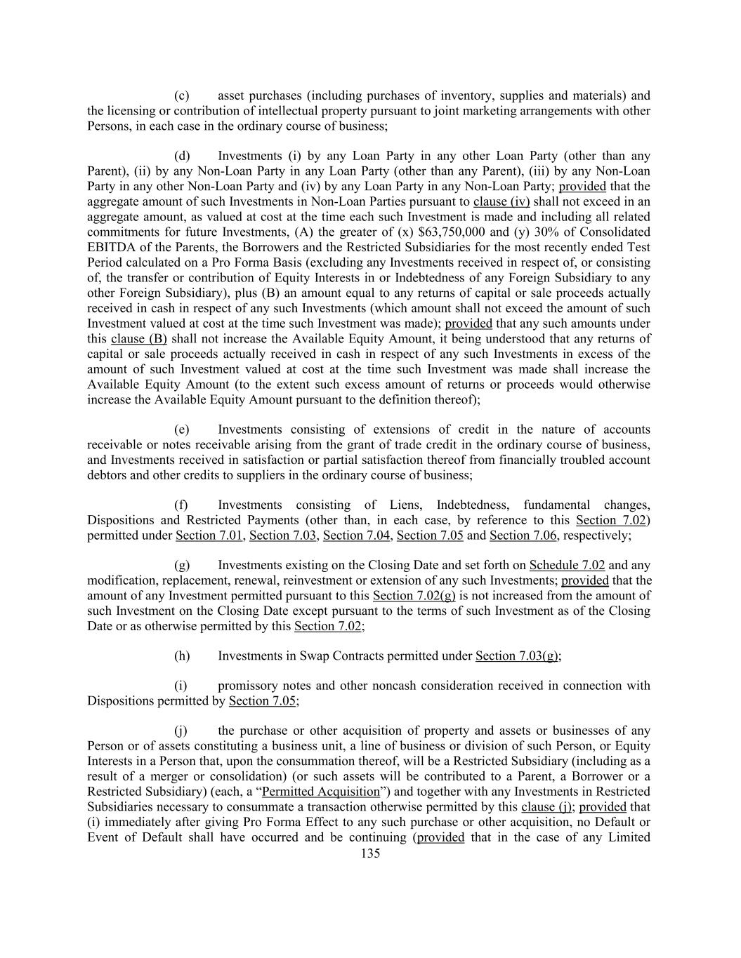 (c) asset purchases (including purchases of inventory, supplies and materials) and the licensing or contribution of intellectual property pursuant to joint marketing arrangements with other Persons, in each case in the ordinary course of business; (d) Investments (i) by any Loan Party in any other Loan Party (other than any Parent), (ii) by any Non-Loan Party in any Loan Party (other than any Parent), (iii) by any Non-Loan Party in any other Non-Loan Party and (iv) by any Loan Party in any Non-Loan Party; provided that the aggregate amount of such Investments in Non-Loan Parties pursuant to clause (iv) shall not exceed in an aggregate amount, as valued at cost at the time each such Investment is made and including all related commitments for future Investments, (A) the greater of (x) $63,750,000 and (y) 30% of Consolidated EBITDA of the Parents, the Borrowers and the Restricted Subsidiaries for the most recently ended Test Period calculated on a Pro Forma Basis (excluding any Investments received in respect of, or consisting of, the transfer or contribution of Equity Interests in or Indebtedness of any Foreign Subsidiary to any other Foreign Subsidiary), plus (B) an amount equal to any returns of capital or sale proceeds actually received in cash in respect of any such Investments (which amount shall not exceed the amount of such Investment valued at cost at the time such Investment was made); provided that any such amounts under this clause (B) shall not increase the Available Equity Amount, it being understood that any returns of capital or sale proceeds actually received in cash in respect of any such Investments in excess of the amount of such Investment valued at cost at the time such Investment was made shall increase the Available Equity Amount (to the extent such excess amount of returns or proceeds would otherwise increase the Available Equity Amount pursuant to the definition thereof); (e) Investments consisting of extensions of credit in the nature of accounts receivable or notes receivable arising from the grant of trade credit in the ordinary course of business, and Investments received in satisfaction or partial satisfaction thereof from financially troubled account debtors and other credits to suppliers in the ordinary course of business; (f) Investments consisting of Liens, Indebtedness, fundamental changes, Dispositions and Restricted Payments (other than, in each case, by reference to this Section 7.02) permitted under Section 7.01, Section 7.03, Section 7.04, Section 7.05 and Section 7.06, respectively; (g) Investments existing on the Closing Date and set forth on Schedule 7.02 and any modification, replacement, renewal, reinvestment or extension of any such Investments; provided that the amount of any Investment permitted pursuant to this Section 7.02(g) is not increased from the amount of such Investment on the Closing Date except pursuant to the terms of such Investment as of the Closing Date or as otherwise permitted by this Section 7.02; (h) Investments in Swap Contracts permitted under Section 7.03(g); (i) promissory notes and other noncash consideration received in connection with Dispositions permitted by Section 7.05; (j) the purchase or other acquisition of property and assets or businesses of any Person or of assets constituting a business unit, a line of business or division of such Person, or Equity Interests in a Person that, upon the consummation thereof, will be a Restricted Subsidiary (including as a result of a merger or consolidation) (or such assets will be contributed to a Parent, a Borrower or a Restricted Subsidiary) (each, a “Permitted Acquisition”) and together with any Investments in Restricted Subsidiaries necessary to consummate a transaction otherwise permitted by this clause (j); provided that (i) immediately after giving Pro Forma Effect to any such purchase or other acquisition, no Default or Event of Default shall have occurred and be continuing (provided that in the case of any Limited 135