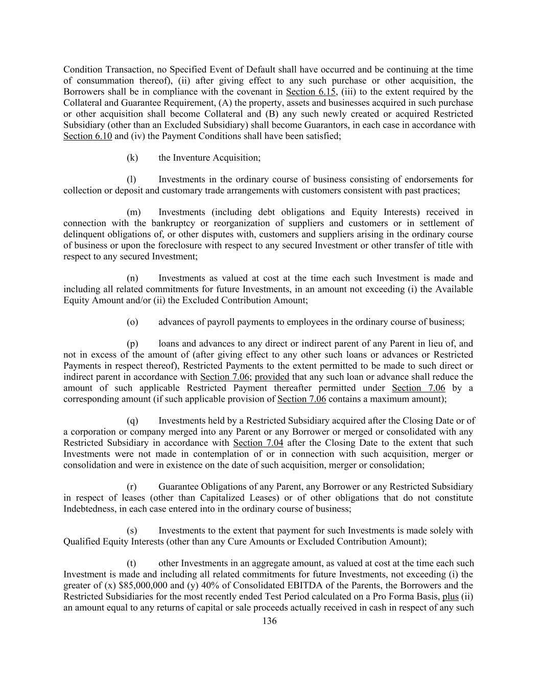 Condition Transaction, no Specified Event of Default shall have occurred and be continuing at the time of consummation thereof), (ii) after giving effect to any such purchase or other acquisition, the Borrowers shall be in compliance with the covenant in Section 6.15, (iii) to the extent required by the Collateral and Guarantee Requirement, (A) the property, assets and businesses acquired in such purchase or other acquisition shall become Collateral and (B) any such newly created or acquired Restricted Subsidiary (other than an Excluded Subsidiary) shall become Guarantors, in each case in accordance with Section 6.10 and (iv) the Payment Conditions shall have been satisfied; (k) the Inventure Acquisition; (l) Investments in the ordinary course of business consisting of endorsements for collection or deposit and customary trade arrangements with customers consistent with past practices; (m) Investments (including debt obligations and Equity Interests) received in connection with the bankruptcy or reorganization of suppliers and customers or in settlement of delinquent obligations of, or other disputes with, customers and suppliers arising in the ordinary course of business or upon the foreclosure with respect to any secured Investment or other transfer of title with respect to any secured Investment; (n) Investments as valued at cost at the time each such Investment is made and including all related commitments for future Investments, in an amount not exceeding (i) the Available Equity Amount and/or (ii) the Excluded Contribution Amount; (o) advances of payroll payments to employees in the ordinary course of business; (p) loans and advances to any direct or indirect parent of any Parent in lieu of, and not in excess of the amount of (after giving effect to any other such loans or advances or Restricted Payments in respect thereof), Restricted Payments to the extent permitted to be made to such direct or indirect parent in accordance with Section 7.06; provided that any such loan or advance shall reduce the amount of such applicable Restricted Payment thereafter permitted under Section 7.06 by a corresponding amount (if such applicable provision of Section 7.06 contains a maximum amount); (q) Investments held by a Restricted Subsidiary acquired after the Closing Date or of a corporation or company merged into any Parent or any Borrower or merged or consolidated with any Restricted Subsidiary in accordance with Section 7.04 after the Closing Date to the extent that such Investments were not made in contemplation of or in connection with such acquisition, merger or consolidation and were in existence on the date of such acquisition, merger or consolidation; (r) Guarantee Obligations of any Parent, any Borrower or any Restricted Subsidiary in respect of leases (other than Capitalized Leases) or of other obligations that do not constitute Indebtedness, in each case entered into in the ordinary course of business; (s) Investments to the extent that payment for such Investments is made solely with Qualified Equity Interests (other than any Cure Amounts or Excluded Contribution Amount); (t) other Investments in an aggregate amount, as valued at cost at the time each such Investment is made and including all related commitments for future Investments, not exceeding (i) the greater of (x) $85,000,000 and (y) 40% of Consolidated EBITDA of the Parents, the Borrowers and the Restricted Subsidiaries for the most recently ended Test Period calculated on a Pro Forma Basis, plus (ii) an amount equal to any returns of capital or sale proceeds actually received in cash in respect of any such 136