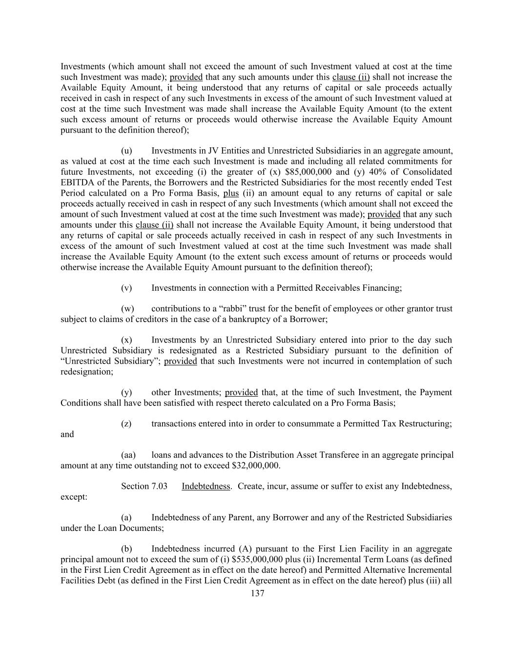 Investments (which amount shall not exceed the amount of such Investment valued at cost at the time such Investment was made); provided that any such amounts under this clause (ii) shall not increase the Available Equity Amount, it being understood that any returns of capital or sale proceeds actually received in cash in respect of any such Investments in excess of the amount of such Investment valued at cost at the time such Investment was made shall increase the Available Equity Amount (to the extent such excess amount of returns or proceeds would otherwise increase the Available Equity Amount pursuant to the definition thereof); (u) Investments in JV Entities and Unrestricted Subsidiaries in an aggregate amount, as valued at cost at the time each such Investment is made and including all related commitments for future Investments, not exceeding (i) the greater of (x) $85,000,000 and (y) 40% of Consolidated EBITDA of the Parents, the Borrowers and the Restricted Subsidiaries for the most recently ended Test Period calculated on a Pro Forma Basis, plus (ii) an amount equal to any returns of capital or sale proceeds actually received in cash in respect of any such Investments (which amount shall not exceed the amount of such Investment valued at cost at the time such Investment was made); provided that any such amounts under this clause (ii) shall not increase the Available Equity Amount, it being understood that any returns of capital or sale proceeds actually received in cash in respect of any such Investments in excess of the amount of such Investment valued at cost at the time such Investment was made shall increase the Available Equity Amount (to the extent such excess amount of returns or proceeds would otherwise increase the Available Equity Amount pursuant to the definition thereof); (v) Investments in connection with a Permitted Receivables Financing; (w) contributions to a “rabbi” trust for the benefit of employees or other grantor trust subject to claims of creditors in the case of a bankruptcy of a Borrower; (x) Investments by an Unrestricted Subsidiary entered into prior to the day such Unrestricted Subsidiary is redesignated as a Restricted Subsidiary pursuant to the definition of “Unrestricted Subsidiary”; provided that such Investments were not incurred in contemplation of such redesignation; (y) other Investments; provided that, at the time of such Investment, the Payment Conditions shall have been satisfied with respect thereto calculated on a Pro Forma Basis; (z) transactions entered into in order to consummate a Permitted Tax Restructuring; and (aa) loans and advances to the Distribution Asset Transferee in an aggregate principal amount at any time outstanding not to exceed $32,000,000. Section 7.03 Indebtedness. Create, incur, assume or suffer to exist any Indebtedness, except: (a) Indebtedness of any Parent, any Borrower and any of the Restricted Subsidiaries under the Loan Documents; (b) Indebtedness incurred (A) pursuant to the First Lien Facility in an aggregate principal amount not to exceed the sum of (i) $535,000,000 plus (ii) Incremental Term Loans (as defined in the First Lien Credit Agreement as in effect on the date hereof) and Permitted Alternative Incremental Facilities Debt (as defined in the First Lien Credit Agreement as in effect on the date hereof) plus (iii) all 137