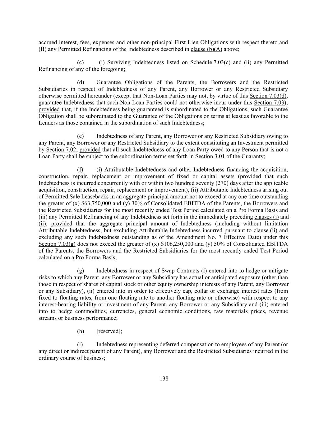 accrued interest, fees, expenses and other non-principal First Lien Obligations with respect thereto and (B) any Permitted Refinancing of the Indebtedness described in clause (b)(A) above; (c) (i) Surviving Indebtedness listed on Schedule 7.03(c) and (ii) any Permitted Refinancing of any of the foregoing; (d) Guarantee Obligations of the Parents, the Borrowers and the Restricted Subsidiaries in respect of Indebtedness of any Parent, any Borrower or any Restricted Subsidiary otherwise permitted hereunder (except that Non-Loan Parties may not, by virtue of this Section 7.03(d), guarantee Indebtedness that such Non-Loan Parties could not otherwise incur under this Section 7.03); provided that, if the Indebtedness being guaranteed is subordinated to the Obligations, such Guarantee Obligation shall be subordinated to the Guarantee of the Obligations on terms at least as favorable to the Lenders as those contained in the subordination of such Indebtedness; (e) Indebtedness of any Parent, any Borrower or any Restricted Subsidiary owing to any Parent, any Borrower or any Restricted Subsidiary to the extent constituting an Investment permitted by Section 7.02; provided that all such Indebtedness of any Loan Party owed to any Person that is not a Loan Party shall be subject to the subordination terms set forth in Section 3.01 of the Guaranty; (f) (i) Attributable Indebtedness and other Indebtedness financing the acquisition, construction, repair, replacement or improvement of fixed or capital assets (provided that such Indebtedness is incurred concurrently with or within two hundred seventy (270) days after the applicable acquisition, construction, repair, replacement or improvement), (ii) Attributable Indebtedness arising out of Permitted Sale Leasebacks in an aggregate principal amount not to exceed at any one time outstanding the greater of (x) $63,750,000 and (y) 30% of Consolidated EBITDA of the Parents, the Borrowers and the Restricted Subsidiaries for the most recently ended Test Period calculated on a Pro Forma Basis and (iii) any Permitted Refinancing of any Indebtedness set forth in the immediately preceding clauses (i) and (ii); provided that the aggregate principal amount of Indebtedness (including without limitation Attributable Indebtedness, but excluding Attributable Indebtedness incurred pursuant to clause (ii) and excluding any such Indebtedness outstanding as of the Amendment No. 7 Effective Date) under this Section 7.03(g) does not exceed the greater of (x) $106,250,000 and (y) 50% of Consolidated EBITDA of the Parents, the Borrowers and the Restricted Subsidiaries for the most recently ended Test Period calculated on a Pro Forma Basis; (g) Indebtedness in respect of Swap Contracts (i) entered into to hedge or mitigate risks to which any Parent, any Borrower or any Subsidiary has actual or anticipated exposure (other than those in respect of shares of capital stock or other equity ownership interests of any Parent, any Borrower or any Subsidiary), (ii) entered into in order to effectively cap, collar or exchange interest rates (from fixed to floating rates, from one floating rate to another floating rate or otherwise) with respect to any interest-bearing liability or investment of any Parent, any Borrower or any Subsidiary and (iii) entered into to hedge commodities, currencies, general economic conditions, raw materials prices, revenue streams or business performance; (h) [reserved]; (i) Indebtedness representing deferred compensation to employees of any Parent (or any direct or indirect parent of any Parent), any Borrower and the Restricted Subsidiaries incurred in the ordinary course of business; 138