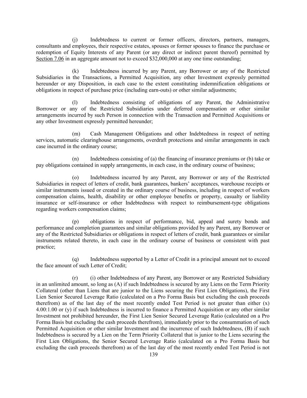 (j) Indebtedness to current or former officers, directors, partners, managers, consultants and employees, their respective estates, spouses or former spouses to finance the purchase or redemption of Equity Interests of any Parent (or any direct or indirect parent thereof) permitted by Section 7.06 in an aggregate amount not to exceed $32,000,000 at any one time outstanding; (k) Indebtedness incurred by any Parent, any Borrower or any of the Restricted Subsidiaries in the Transactions, a Permitted Acquisition, any other Investment expressly permitted hereunder or any Disposition, in each case to the extent constituting indemnification obligations or obligations in respect of purchase price (including earn-outs) or other similar adjustments; (l) Indebtedness consisting of obligations of any Parent, the Administrative Borrower or any of the Restricted Subsidiaries under deferred compensation or other similar arrangements incurred by such Person in connection with the Transaction and Permitted Acquisitions or any other Investment expressly permitted hereunder; (m) Cash Management Obligations and other Indebtedness in respect of netting services, automatic clearinghouse arrangements, overdraft protections and similar arrangements in each case incurred in the ordinary course; (n) Indebtedness consisting of (a) the financing of insurance premiums or (b) take or pay obligations contained in supply arrangements, in each case, in the ordinary course of business; (o) Indebtedness incurred by any Parent, any Borrower or any of the Restricted Subsidiaries in respect of letters of credit, bank guarantees, bankers’ acceptances, warehouse receipts or similar instruments issued or created in the ordinary course of business, including in respect of workers compensation claims, health, disability or other employee benefits or property, casualty or liability insurance or self-insurance or other Indebtedness with respect to reimbursement-type obligations regarding workers compensation claims; (p) obligations in respect of performance, bid, appeal and surety bonds and performance and completion guarantees and similar obligations provided by any Parent, any Borrower or any of the Restricted Subsidiaries or obligations in respect of letters of credit, bank guarantees or similar instruments related thereto, in each case in the ordinary course of business or consistent with past practice; (q) Indebtedness supported by a Letter of Credit in a principal amount not to exceed the face amount of such Letter of Credit; (r) (i) other Indebtedness of any Parent, any Borrower or any Restricted Subsidiary in an unlimited amount, so long as (A) if such Indebtedness is secured by any Liens on the Term Priority Collateral (other than Liens that are junior to the Liens securing the First Lien Obligations), the First Lien Senior Secured Leverage Ratio (calculated on a Pro Forma Basis but excluding the cash proceeds therefrom) as of the last day of the most recently ended Test Period is not greater than either (x) 4.00:1.00 or (y) if such Indebtedness is incurred to finance a Permitted Acquisition or any other similar Investment not prohibited hereunder, the First Lien Senior Secured Leverage Ratio (calculated on a Pro Forma Basis but excluding the cash proceeds therefrom), immediately prior to the consummation of such Permitted Acquisition or other similar Investment and the incurrence of such Indebtedness, (B) if such Indebtedness is secured by a Lien on the Term Priority Collateral that is junior to the Liens securing the First Lien Obligations, the Senior Secured Leverage Ratio (calculated on a Pro Forma Basis but excluding the cash proceeds therefrom) as of the last day of the most recently ended Test Period is not 139