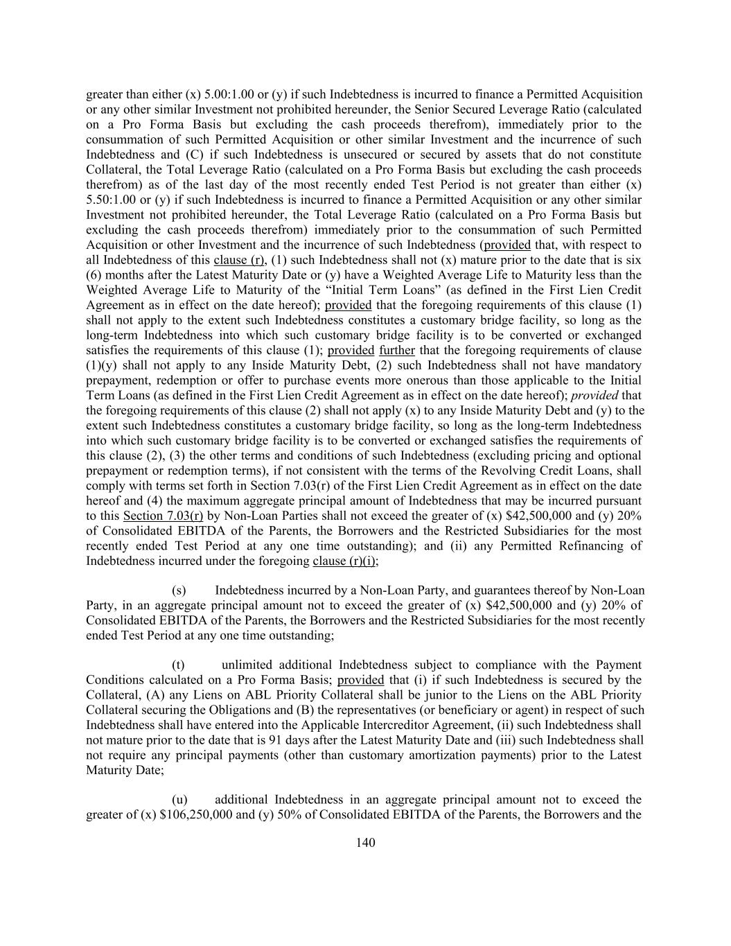 greater than either (x) 5.00:1.00 or (y) if such Indebtedness is incurred to finance a Permitted Acquisition or any other similar Investment not prohibited hereunder, the Senior Secured Leverage Ratio (calculated on a Pro Forma Basis but excluding the cash proceeds therefrom), immediately prior to the consummation of such Permitted Acquisition or other similar Investment and the incurrence of such Indebtedness and (C) if such Indebtedness is unsecured or secured by assets that do not constitute Collateral, the Total Leverage Ratio (calculated on a Pro Forma Basis but excluding the cash proceeds therefrom) as of the last day of the most recently ended Test Period is not greater than either (x) 5.50:1.00 or (y) if such Indebtedness is incurred to finance a Permitted Acquisition or any other similar Investment not prohibited hereunder, the Total Leverage Ratio (calculated on a Pro Forma Basis but excluding the cash proceeds therefrom) immediately prior to the consummation of such Permitted Acquisition or other Investment and the incurrence of such Indebtedness (provided that, with respect to all Indebtedness of this clause (r), (1) such Indebtedness shall not (x) mature prior to the date that is six (6) months after the Latest Maturity Date or (y) have a Weighted Average Life to Maturity less than the Weighted Average Life to Maturity of the “Initial Term Loans” (as defined in the First Lien Credit Agreement as in effect on the date hereof); provided that the foregoing requirements of this clause (1) shall not apply to the extent such Indebtedness constitutes a customary bridge facility, so long as the long-term Indebtedness into which such customary bridge facility is to be converted or exchanged satisfies the requirements of this clause (1); provided further that the foregoing requirements of clause (1)(y) shall not apply to any Inside Maturity Debt, (2) such Indebtedness shall not have mandatory prepayment, redemption or offer to purchase events more onerous than those applicable to the Initial Term Loans (as defined in the First Lien Credit Agreement as in effect on the date hereof); provided that the foregoing requirements of this clause (2) shall not apply (x) to any Inside Maturity Debt and (y) to the extent such Indebtedness constitutes a customary bridge facility, so long as the long-term Indebtedness into which such customary bridge facility is to be converted or exchanged satisfies the requirements of this clause (2), (3) the other terms and conditions of such Indebtedness (excluding pricing and optional prepayment or redemption terms), if not consistent with the terms of the Revolving Credit Loans, shall comply with terms set forth in Section 7.03(r) of the First Lien Credit Agreement as in effect on the date hereof and (4) the maximum aggregate principal amount of Indebtedness that may be incurred pursuant to this Section 7.03(r) by Non-Loan Parties shall not exceed the greater of (x) $42,500,000 and (y) 20% of Consolidated EBITDA of the Parents, the Borrowers and the Restricted Subsidiaries for the most recently ended Test Period at any one time outstanding); and (ii) any Permitted Refinancing of Indebtedness incurred under the foregoing clause (r)(i); (s) Indebtedness incurred by a Non-Loan Party, and guarantees thereof by Non-Loan Party, in an aggregate principal amount not to exceed the greater of (x) $42,500,000 and (y) 20% of Consolidated EBITDA of the Parents, the Borrowers and the Restricted Subsidiaries for the most recently ended Test Period at any one time outstanding; (t) unlimited additional Indebtedness subject to compliance with the Payment Conditions calculated on a Pro Forma Basis; provided that (i) if such Indebtedness is secured by the Collateral, (A) any Liens on ABL Priority Collateral shall be junior to the Liens on the ABL Priority Collateral securing the Obligations and (B) the representatives (or beneficiary or agent) in respect of such Indebtedness shall have entered into the Applicable Intercreditor Agreement, (ii) such Indebtedness shall not mature prior to the date that is 91 days after the Latest Maturity Date and (iii) such Indebtedness shall not require any principal payments (other than customary amortization payments) prior to the Latest Maturity Date; (u) additional Indebtedness in an aggregate principal amount not to exceed the greater of (x) $106,250,000 and (y) 50% of Consolidated EBITDA of the Parents, the Borrowers and the 140