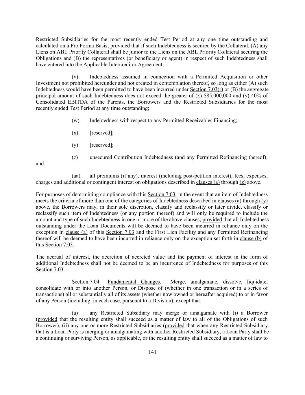 Restricted Subsidiaries for the most recently ended Test Period at any one time outstanding and calculated on a Pro Forma Basis; provided that if such Indebtedness is secured by the Collateral, (A) any Liens on ABL Priority Collateral shall be junior to the Liens on the ABL Priority Collateral securing the Obligations and (B) the representatives (or beneficiary or agent) in respect of such Indebtedness shall have entered into the Applicable Intercreditor Agreement; (v) Indebtedness assumed in connection with a Permitted Acquisition or other Investment not prohibited hereunder and not created in contemplation thereof, so long as either (A) such Indebtedness would have been permitted to have been incurred under Section 7.03(r) or (B) the aggregate principal amount of such Indebtedness does not exceed the greater of (x) $85,000,000 and (y) 40% of Consolidated EBITDA of the Parents, the Borrowers and the Restricted Subsidiaries for the most recently ended Test Period at any time outstanding; (w) Indebtedness with respect to any Permitted Receivables Financing; (x) [reserved]; (y) [reserved]; (z) unsecured Contribution Indebtedness (and any Permitted Refinancing thereof); and (aa) all premiums (if any), interest (including post-petition interest), fees, expenses, charges and additional or contingent interest on obligations described in clauses (a) through (z) above. For purposes of determining compliance with this Section 7.03, in the event that an item of Indebtedness meets the criteria of more than one of the categories of Indebtedness described in clauses (a) through (y) above, the Borrowers may, in their sole discretion, classify and reclassify or later divide, classify or reclassify such item of Indebtedness (or any portion thereof) and will only be required to include the amount and type of such Indebtedness in one or more of the above clauses; provided that all Indebtedness outstanding under the Loan Documents will be deemed to have been incurred in reliance only on the exception in clause (a) of this Section 7.03 and the First Lien Facility and any Permitted Refinancing thereof will be deemed to have been incurred in reliance only on the exception set forth in clause (b) of this Section 7.03. The accrual of interest, the accretion of accreted value and the payment of interest in the form of additional Indebtedness shall not be deemed to be an incurrence of Indebtedness for purposes of this Section 7.03. Section 7.04 Fundamental Changes. Merge, amalgamate, dissolve, liquidate, consolidate with or into another Person, or Dispose of (whether in one transaction or in a series of transactions) all or substantially all of its assets (whether now owned or hereafter acquired) to or in favor of any Person (including, in each case, pursuant to a Division), except that: (a) any Restricted Subsidiary may merge or amalgamate with (i) a Borrower (provided that the resulting entity shall succeed as a matter of law to all of the Obligations of such Borrower), (ii) any one or more Restricted Subsidiaries (provided that when any Restricted Subsidiary that is a Loan Party is merging or amalgamating with another Restricted Subsidiary, a Loan Party shall be a continuing or surviving Person, as applicable, or the resulting entity shall succeed as a matter of law to 141