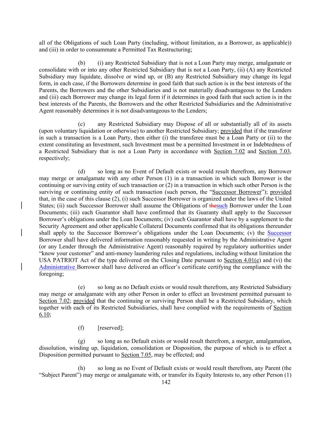 all of the Obligations of such Loan Party (including, without limitation, as a Borrower, as applicable)) and (iii) in order to consummate a Permitted Tax Restructuring; (b) (i) any Restricted Subsidiary that is not a Loan Party may merge, amalgamate or consolidate with or into any other Restricted Subsidiary that is not a Loan Party, (ii) (A) any Restricted Subsidiary may liquidate, dissolve or wind up, or (B) any Restricted Subsidiary may change its legal form, in each case, if the Borrowers determine in good faith that such action is in the best interests of the Parents, the Borrowers and the other Subsidiaries and is not materially disadvantageous to the Lenders and (iii) each Borrower may change its legal form if it determines in good faith that such action is in the best interests of the Parents, the Borrowers and the other Restricted Subsidiaries and the Administrative Agent reasonably determines it is not disadvantageous to the Lenders; (c) any Restricted Subsidiary may Dispose of all or substantially all of its assets (upon voluntary liquidation or otherwise) to another Restricted Subsidiary; provided that if the transferor in such a transaction is a Loan Party, then either (i) the transferee must be a Loan Party or (ii) to the extent constituting an Investment, such Investment must be a permitted Investment in or Indebtedness of a Restricted Subsidiary that is not a Loan Party in accordance with Section 7.02 and Section 7.03, respectively; (d) so long as no Event of Default exists or would result therefrom, any Borrower may merge or amalgamate with any other Person (1) in a transaction in which such Borrower is the continuing or surviving entity of such transaction or (2) in a transaction in which such other Person is the surviving or continuing entity of such transaction (such person, the “Successor Borrower”); provided that, in the case of this clause (2), (i) such Successor Borrower is organized under the laws of the United States; (ii) such Successor Borrower shall assume the Obligations of thesuch Borrower under the Loan Documents; (iii) each Guarantor shall have confirmed that its Guaranty shall apply to the Successor Borrower’s obligations under the Loan Documents; (iv) each Guarantor shall have by a supplement to the Security Agreement and other applicable Collateral Documents confirmed that its obligations thereunder shall apply to the Successor Borrower’s obligations under the Loan Documents; (v) the Successor Borrower shall have delivered information reasonably requested in writing by the Administrative Agent (or any Lender through the Administrative Agent) reasonably required by regulatory authorities under “know your customer” and anti-money laundering rules and regulations, including without limitation the USA PATRIOT Act of the type delivered on the Closing Date pursuant to Section 4.01(e) and (vi) the Administrative Borrower shall have delivered an officer’s certificate certifying the compliance with the foregoing; (e) so long as no Default exists or would result therefrom, any Restricted Subsidiary may merge or amalgamate with any other Person in order to effect an Investment permitted pursuant to Section 7.02; provided that the continuing or surviving Person shall be a Restricted Subsidiary, which together with each of its Restricted Subsidiaries, shall have complied with the requirements of Section 6.10; (f) [reserved]; (g) so long as no Default exists or would result therefrom, a merger, amalgamation, dissolution, winding up, liquidation, consolidation or Disposition, the purpose of which is to effect a Disposition permitted pursuant to Section 7.05, may be effected; and (h) so long as no Event of Default exists or would result therefrom, any Parent (the “Subject Parent”) may merge or amalgamate with, or transfer its Equity Interests to, any other Person (1) 142