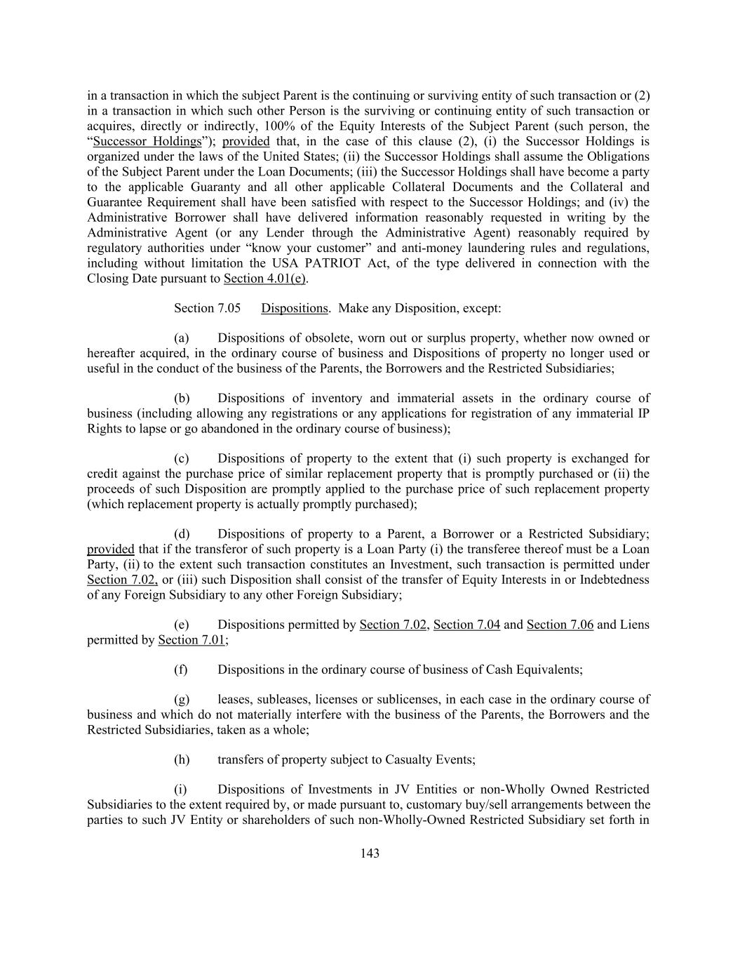 in a transaction in which the subject Parent is the continuing or surviving entity of such transaction or (2) in a transaction in which such other Person is the surviving or continuing entity of such transaction or acquires, directly or indirectly, 100% of the Equity Interests of the Subject Parent (such person, the “Successor Holdings”); provided that, in the case of this clause (2), (i) the Successor Holdings is organized under the laws of the United States; (ii) the Successor Holdings shall assume the Obligations of the Subject Parent under the Loan Documents; (iii) the Successor Holdings shall have become a party to the applicable Guaranty and all other applicable Collateral Documents and the Collateral and Guarantee Requirement shall have been satisfied with respect to the Successor Holdings; and (iv) the Administrative Borrower shall have delivered information reasonably requested in writing by the Administrative Agent (or any Lender through the Administrative Agent) reasonably required by regulatory authorities under “know your customer” and anti-money laundering rules and regulations, including without limitation the USA PATRIOT Act, of the type delivered in connection with the Closing Date pursuant to Section 4.01(e). Section 7.05 Dispositions. Make any Disposition, except: (a) Dispositions of obsolete, worn out or surplus property, whether now owned or hereafter acquired, in the ordinary course of business and Dispositions of property no longer used or useful in the conduct of the business of the Parents, the Borrowers and the Restricted Subsidiaries; (b) Dispositions of inventory and immaterial assets in the ordinary course of business (including allowing any registrations or any applications for registration of any immaterial IP Rights to lapse or go abandoned in the ordinary course of business); (c) Dispositions of property to the extent that (i) such property is exchanged for credit against the purchase price of similar replacement property that is promptly purchased or (ii) the proceeds of such Disposition are promptly applied to the purchase price of such replacement property (which replacement property is actually promptly purchased); (d) Dispositions of property to a Parent, a Borrower or a Restricted Subsidiary; provided that if the transferor of such property is a Loan Party (i) the transferee thereof must be a Loan Party, (ii) to the extent such transaction constitutes an Investment, such transaction is permitted under Section 7.02, or (iii) such Disposition shall consist of the transfer of Equity Interests in or Indebtedness of any Foreign Subsidiary to any other Foreign Subsidiary; (e) Dispositions permitted by Section 7.02, Section 7.04 and Section 7.06 and Liens permitted by Section 7.01; (f) Dispositions in the ordinary course of business of Cash Equivalents; (g) leases, subleases, licenses or sublicenses, in each case in the ordinary course of business and which do not materially interfere with the business of the Parents, the Borrowers and the Restricted Subsidiaries, taken as a whole; (h) transfers of property subject to Casualty Events; (i) Dispositions of Investments in JV Entities or non-Wholly Owned Restricted Subsidiaries to the extent required by, or made pursuant to, customary buy/sell arrangements between the parties to such JV Entity or shareholders of such non-Wholly-Owned Restricted Subsidiary set forth in 143