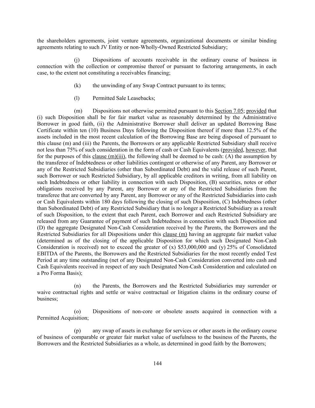 the shareholders agreements, joint venture agreements, organizational documents or similar binding agreements relating to such JV Entity or non-Wholly-Owned Restricted Subsidiary; (j) Dispositions of accounts receivable in the ordinary course of business in connection with the collection or compromise thereof or pursuant to factoring arrangements, in each case, to the extent not constituting a receivables financing; (k) the unwinding of any Swap Contract pursuant to its terms; (l) Permitted Sale Leasebacks; (m) Dispositions not otherwise permitted pursuant to this Section 7.05; provided that (i) such Disposition shall be for fair market value as reasonably determined by the Administrative Borrower in good faith, (ii) the Administrative Borrower shall deliver an updated Borrowing Base Certificate within ten (10) Business Days following the Disposition thereof if more than 12.5% of the assets included in the most recent calculation of the Borrowing Base are being disposed of pursuant to this clause (m) and (iii) the Parents, the Borrowers or any applicable Restricted Subsidiary shall receive not less than 75% of such consideration in the form of cash or Cash Equivalents (provided, however, that for the purposes of this clause (m)(iii), the following shall be deemed to be cash: (A) the assumption by the transferee of Indebtedness or other liabilities contingent or otherwise of any Parent, any Borrower or any of the Restricted Subsidiaries (other than Subordinated Debt) and the valid release of such Parent, such Borrower or such Restricted Subsidiary, by all applicable creditors in writing, from all liability on such Indebtedness or other liability in connection with such Disposition, (B) securities, notes or other obligations received by any Parent, any Borrower or any of the Restricted Subsidiaries from the transferee that are converted by any Parent, any Borrower or any of the Restricted Subsidiaries into cash or Cash Equivalents within 180 days following the closing of such Disposition, (C) Indebtedness (other than Subordinated Debt) of any Restricted Subsidiary that is no longer a Restricted Subsidiary as a result of such Disposition, to the extent that each Parent, each Borrower and each Restricted Subsidiary are released from any Guarantee of payment of such Indebtedness in connection with such Disposition and (D) the aggregate Designated Non-Cash Consideration received by the Parents, the Borrowers and the Restricted Subsidiaries for all Dispositions under this clause (m) having an aggregate fair market value (determined as of the closing of the applicable Disposition for which such Designated Non-Cash Consideration is received) not to exceed the greater of (x) $53,000,000 and (y) 25% of Consolidated EBITDA of the Parents, the Borrowers and the Restricted Subsidiaries for the most recently ended Test Period at any time outstanding (net of any Designated Non-Cash Consideration converted into cash and Cash Equivalents received in respect of any such Designated Non-Cash Consideration and calculated on a Pro Forma Basis); (n) the Parents, the Borrowers and the Restricted Subsidiaries may surrender or waive contractual rights and settle or waive contractual or litigation claims in the ordinary course of business; (o) Dispositions of non-core or obsolete assets acquired in connection with a Permitted Acquisition; (p) any swap of assets in exchange for services or other assets in the ordinary course of business of comparable or greater fair market value of usefulness to the business of the Parents, the Borrowers and the Restricted Subsidiaries as a whole, as determined in good faith by the Borrowers; 144