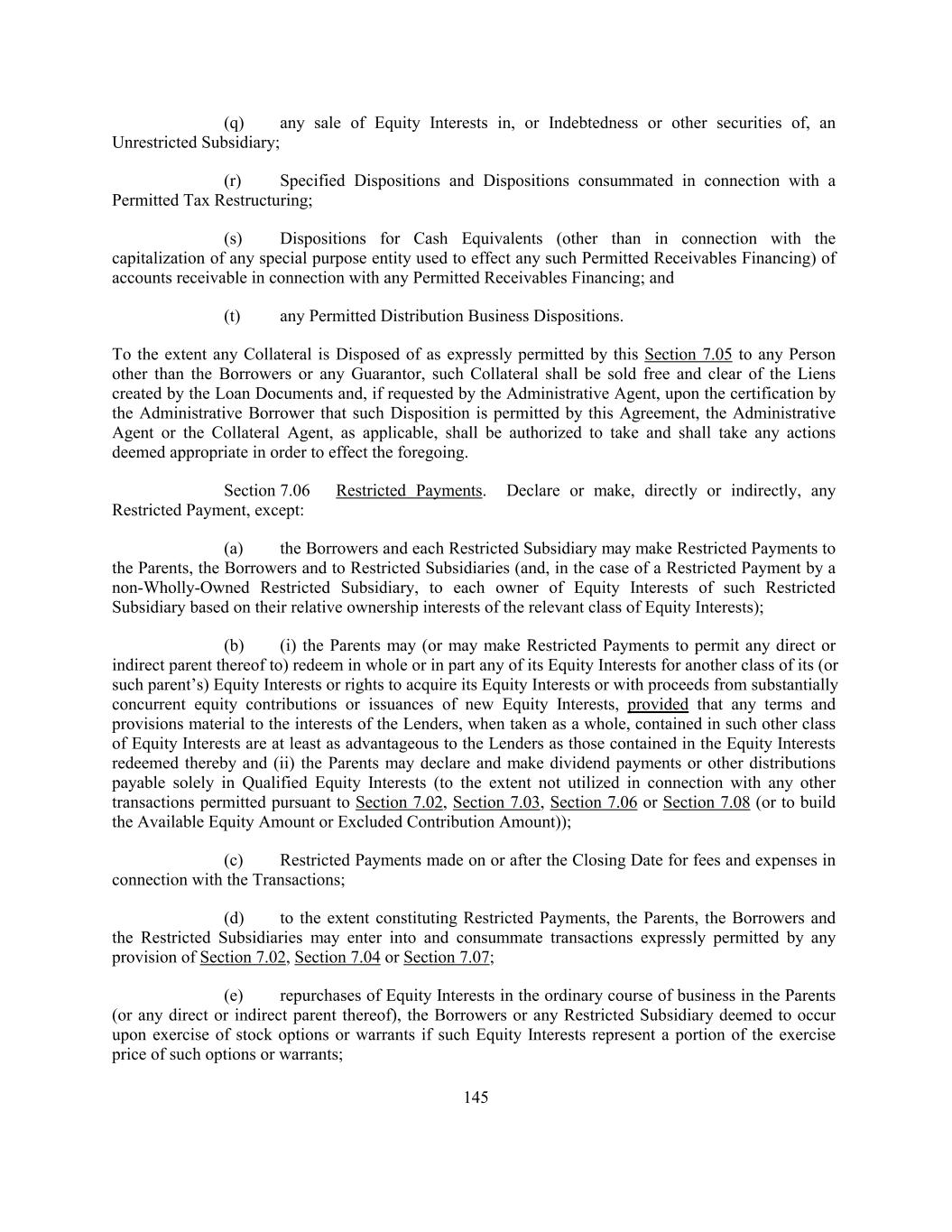 (q) any sale of Equity Interests in, or Indebtedness or other securities of, an Unrestricted Subsidiary; (r) Specified Dispositions and Dispositions consummated in connection with a Permitted Tax Restructuring; (s) Dispositions for Cash Equivalents (other than in connection with the capitalization of any special purpose entity used to effect any such Permitted Receivables Financing) of accounts receivable in connection with any Permitted Receivables Financing; and (t) any Permitted Distribution Business Dispositions. To the extent any Collateral is Disposed of as expressly permitted by this Section 7.05 to any Person other than the Borrowers or any Guarantor, such Collateral shall be sold free and clear of the Liens created by the Loan Documents and, if requested by the Administrative Agent, upon the certification by the Administrative Borrower that such Disposition is permitted by this Agreement, the Administrative Agent or the Collateral Agent, as applicable, shall be authorized to take and shall take any actions deemed appropriate in order to effect the foregoing. Section 7.06 Restricted Payments. Declare or make, directly or indirectly, any Restricted Payment, except: (a) the Borrowers and each Restricted Subsidiary may make Restricted Payments to the Parents, the Borrowers and to Restricted Subsidiaries (and, in the case of a Restricted Payment by a non-Wholly-Owned Restricted Subsidiary, to each owner of Equity Interests of such Restricted Subsidiary based on their relative ownership interests of the relevant class of Equity Interests); (b) (i) the Parents may (or may make Restricted Payments to permit any direct or indirect parent thereof to) redeem in whole or in part any of its Equity Interests for another class of its (or such parent’s) Equity Interests or rights to acquire its Equity Interests or with proceeds from substantially concurrent equity contributions or issuances of new Equity Interests, provided that any terms and provisions material to the interests of the Lenders, when taken as a whole, contained in such other class of Equity Interests are at least as advantageous to the Lenders as those contained in the Equity Interests redeemed thereby and (ii) the Parents may declare and make dividend payments or other distributions payable solely in Qualified Equity Interests (to the extent not utilized in connection with any other transactions permitted pursuant to Section 7.02, Section 7.03, Section 7.06 or Section 7.08 (or to build the Available Equity Amount or Excluded Contribution Amount)); (c) Restricted Payments made on or after the Closing Date for fees and expenses in connection with the Transactions; (d) to the extent constituting Restricted Payments, the Parents, the Borrowers and the Restricted Subsidiaries may enter into and consummate transactions expressly permitted by any provision of Section 7.02, Section 7.04 or Section 7.07; (e) repurchases of Equity Interests in the ordinary course of business in the Parents (or any direct or indirect parent thereof), the Borrowers or any Restricted Subsidiary deemed to occur upon exercise of stock options or warrants if such Equity Interests represent a portion of the exercise price of such options or warrants; 145