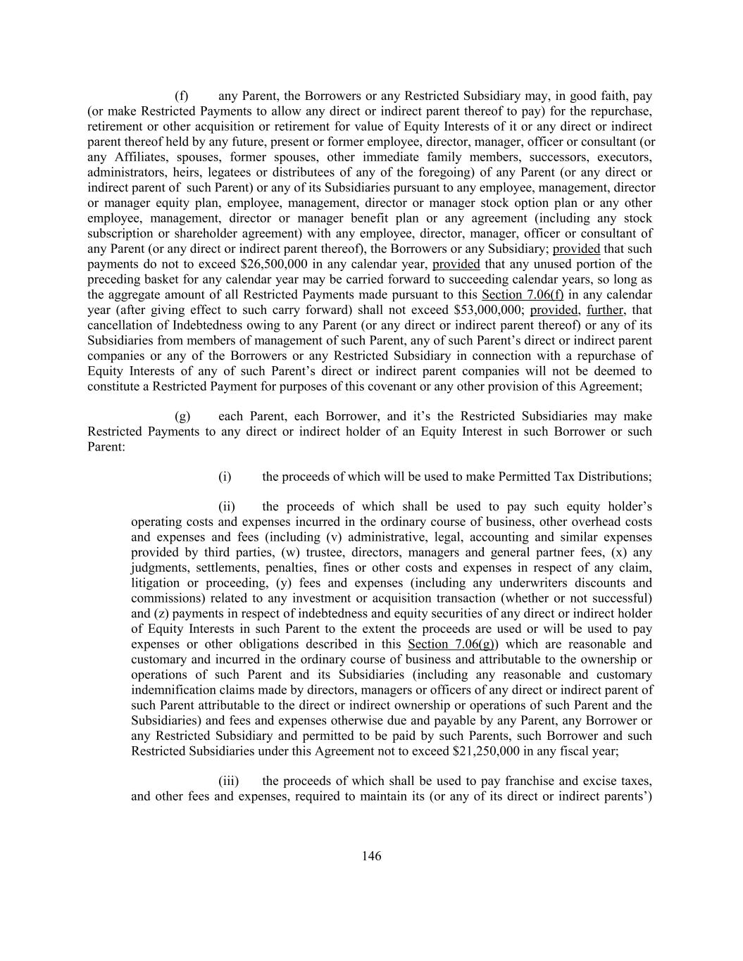 (f) any Parent, the Borrowers or any Restricted Subsidiary may, in good faith, pay (or make Restricted Payments to allow any direct or indirect parent thereof to pay) for the repurchase, retirement or other acquisition or retirement for value of Equity Interests of it or any direct or indirect parent thereof held by any future, present or former employee, director, manager, officer or consultant (or any Affiliates, spouses, former spouses, other immediate family members, successors, executors, administrators, heirs, legatees or distributees of any of the foregoing) of any Parent (or any direct or indirect parent of such Parent) or any of its Subsidiaries pursuant to any employee, management, director or manager equity plan, employee, management, director or manager stock option plan or any other employee, management, director or manager benefit plan or any agreement (including any stock subscription or shareholder agreement) with any employee, director, manager, officer or consultant of any Parent (or any direct or indirect parent thereof), the Borrowers or any Subsidiary; provided that such payments do not to exceed $26,500,000 in any calendar year, provided that any unused portion of the preceding basket for any calendar year may be carried forward to succeeding calendar years, so long as the aggregate amount of all Restricted Payments made pursuant to this Section 7.06(f) in any calendar year (after giving effect to such carry forward) shall not exceed $53,000,000; provided, further, that cancellation of Indebtedness owing to any Parent (or any direct or indirect parent thereof) or any of its Subsidiaries from members of management of such Parent, any of such Parent’s direct or indirect parent companies or any of the Borrowers or any Restricted Subsidiary in connection with a repurchase of Equity Interests of any of such Parent’s direct or indirect parent companies will not be deemed to constitute a Restricted Payment for purposes of this covenant or any other provision of this Agreement; (g) each Parent, each Borrower, and it’s the Restricted Subsidiaries may make Restricted Payments to any direct or indirect holder of an Equity Interest in such Borrower or such Parent: (i) the proceeds of which will be used to make Permitted Tax Distributions; (ii) the proceeds of which shall be used to pay such equity holder’s operating costs and expenses incurred in the ordinary course of business, other overhead costs and expenses and fees (including (v) administrative, legal, accounting and similar expenses provided by third parties, (w) trustee, directors, managers and general partner fees, (x) any judgments, settlements, penalties, fines or other costs and expenses in respect of any claim, litigation or proceeding, (y) fees and expenses (including any underwriters discounts and commissions) related to any investment or acquisition transaction (whether or not successful) and (z) payments in respect of indebtedness and equity securities of any direct or indirect holder of Equity Interests in such Parent to the extent the proceeds are used or will be used to pay expenses or other obligations described in this Section 7.06(g)) which are reasonable and customary and incurred in the ordinary course of business and attributable to the ownership or operations of such Parent and its Subsidiaries (including any reasonable and customary indemnification claims made by directors, managers or officers of any direct or indirect parent of such Parent attributable to the direct or indirect ownership or operations of such Parent and the Subsidiaries) and fees and expenses otherwise due and payable by any Parent, any Borrower or any Restricted Subsidiary and permitted to be paid by such Parents, such Borrower and such Restricted Subsidiaries under this Agreement not to exceed $21,250,000 in any fiscal year; (iii) the proceeds of which shall be used to pay franchise and excise taxes, and other fees and expenses, required to maintain its (or any of its direct or indirect parents’) 146