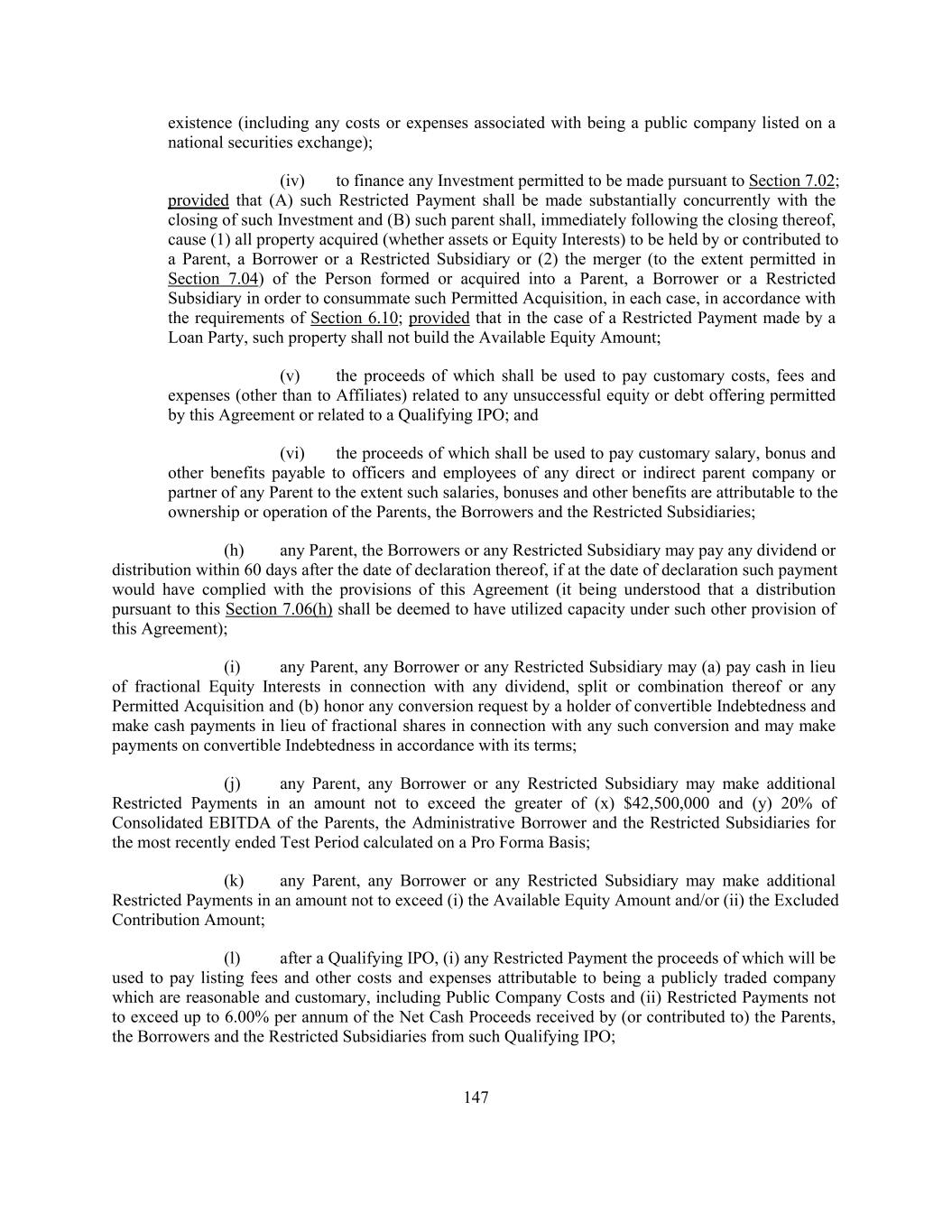 existence (including any costs or expenses associated with being a public company listed on a national securities exchange); (iv) to finance any Investment permitted to be made pursuant to Section 7.02; provided that (A) such Restricted Payment shall be made substantially concurrently with the closing of such Investment and (B) such parent shall, immediately following the closing thereof, cause (1) all property acquired (whether assets or Equity Interests) to be held by or contributed to a Parent, a Borrower or a Restricted Subsidiary or (2) the merger (to the extent permitted in Section 7.04) of the Person formed or acquired into a Parent, a Borrower or a Restricted Subsidiary in order to consummate such Permitted Acquisition, in each case, in accordance with the requirements of Section 6.10; provided that in the case of a Restricted Payment made by a Loan Party, such property shall not build the Available Equity Amount; (v) the proceeds of which shall be used to pay customary costs, fees and expenses (other than to Affiliates) related to any unsuccessful equity or debt offering permitted by this Agreement or related to a Qualifying IPO; and (vi) the proceeds of which shall be used to pay customary salary, bonus and other benefits payable to officers and employees of any direct or indirect parent company or partner of any Parent to the extent such salaries, bonuses and other benefits are attributable to the ownership or operation of the Parents, the Borrowers and the Restricted Subsidiaries; (h) any Parent, the Borrowers or any Restricted Subsidiary may pay any dividend or distribution within 60 days after the date of declaration thereof, if at the date of declaration such payment would have complied with the provisions of this Agreement (it being understood that a distribution pursuant to this Section 7.06(h) shall be deemed to have utilized capacity under such other provision of this Agreement); (i) any Parent, any Borrower or any Restricted Subsidiary may (a) pay cash in lieu of fractional Equity Interests in connection with any dividend, split or combination thereof or any Permitted Acquisition and (b) honor any conversion request by a holder of convertible Indebtedness and make cash payments in lieu of fractional shares in connection with any such conversion and may make payments on convertible Indebtedness in accordance with its terms; (j) any Parent, any Borrower or any Restricted Subsidiary may make additional Restricted Payments in an amount not to exceed the greater of (x) $42,500,000 and (y) 20% of Consolidated EBITDA of the Parents, the Administrative Borrower and the Restricted Subsidiaries for the most recently ended Test Period calculated on a Pro Forma Basis; (k) any Parent, any Borrower or any Restricted Subsidiary may make additional Restricted Payments in an amount not to exceed (i) the Available Equity Amount and/or (ii) the Excluded Contribution Amount; (l) after a Qualifying IPO, (i) any Restricted Payment the proceeds of which will be used to pay listing fees and other costs and expenses attributable to being a publicly traded company which are reasonable and customary, including Public Company Costs and (ii) Restricted Payments not to exceed up to 6.00% per annum of the Net Cash Proceeds received by (or contributed to) the Parents, the Borrowers and the Restricted Subsidiaries from such Qualifying IPO; 147
