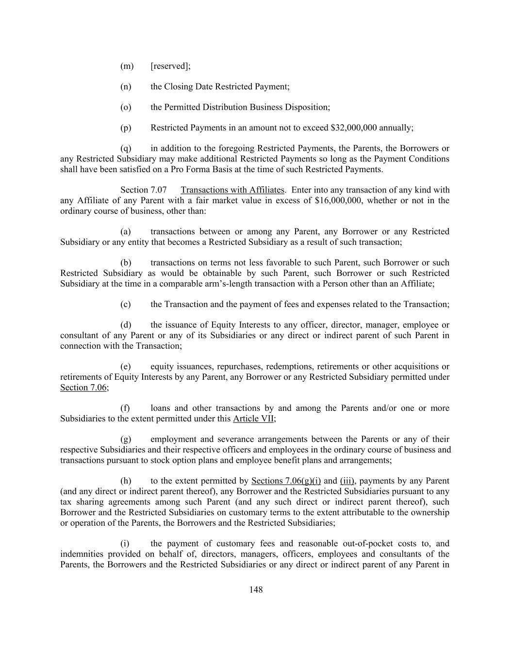 (m) [reserved]; (n) the Closing Date Restricted Payment; (o) the Permitted Distribution Business Disposition; (p) Restricted Payments in an amount not to exceed $32,000,000 annually; (q) in addition to the foregoing Restricted Payments, the Parents, the Borrowers or any Restricted Subsidiary may make additional Restricted Payments so long as the Payment Conditions shall have been satisfied on a Pro Forma Basis at the time of such Restricted Payments. Section 7.07 Transactions with Affiliates. Enter into any transaction of any kind with any Affiliate of any Parent with a fair market value in excess of $16,000,000, whether or not in the ordinary course of business, other than: (a) transactions between or among any Parent, any Borrower or any Restricted Subsidiary or any entity that becomes a Restricted Subsidiary as a result of such transaction; (b) transactions on terms not less favorable to such Parent, such Borrower or such Restricted Subsidiary as would be obtainable by such Parent, such Borrower or such Restricted Subsidiary at the time in a comparable arm’s-length transaction with a Person other than an Affiliate; (c) the Transaction and the payment of fees and expenses related to the Transaction; (d) the issuance of Equity Interests to any officer, director, manager, employee or consultant of any Parent or any of its Subsidiaries or any direct or indirect parent of such Parent in connection with the Transaction; (e) equity issuances, repurchases, redemptions, retirements or other acquisitions or retirements of Equity Interests by any Parent, any Borrower or any Restricted Subsidiary permitted under Section 7.06; (f) loans and other transactions by and among the Parents and/or one or more Subsidiaries to the extent permitted under this Article VII; (g) employment and severance arrangements between the Parents or any of their respective Subsidiaries and their respective officers and employees in the ordinary course of business and transactions pursuant to stock option plans and employee benefit plans and arrangements; (h) to the extent permitted by Sections 7.06(g)(i) and (iii), payments by any Parent (and any direct or indirect parent thereof), any Borrower and the Restricted Subsidiaries pursuant to any tax sharing agreements among such Parent (and any such direct or indirect parent thereof), such Borrower and the Restricted Subsidiaries on customary terms to the extent attributable to the ownership or operation of the Parents, the Borrowers and the Restricted Subsidiaries; (i) the payment of customary fees and reasonable out-of-pocket costs to, and indemnities provided on behalf of, directors, managers, officers, employees and consultants of the Parents, the Borrowers and the Restricted Subsidiaries or any direct or indirect parent of any Parent in 148