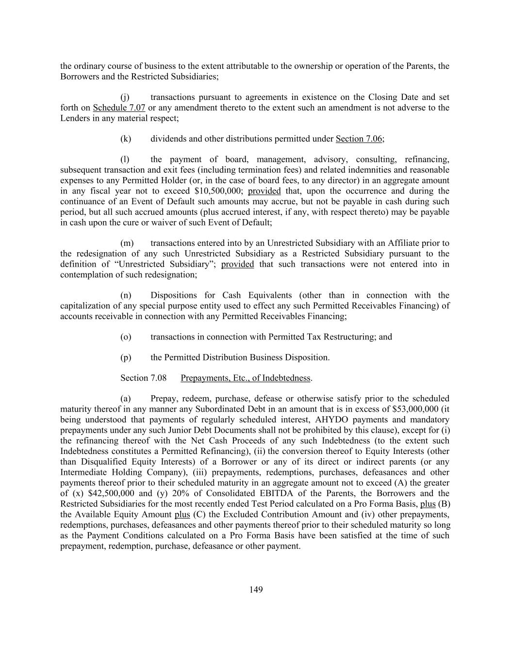 the ordinary course of business to the extent attributable to the ownership or operation of the Parents, the Borrowers and the Restricted Subsidiaries; (j) transactions pursuant to agreements in existence on the Closing Date and set forth on Schedule 7.07 or any amendment thereto to the extent such an amendment is not adverse to the Lenders in any material respect; (k) dividends and other distributions permitted under Section 7.06; (l) the payment of board, management, advisory, consulting, refinancing, subsequent transaction and exit fees (including termination fees) and related indemnities and reasonable expenses to any Permitted Holder (or, in the case of board fees, to any director) in an aggregate amount in any fiscal year not to exceed $10,500,000; provided that, upon the occurrence and during the continuance of an Event of Default such amounts may accrue, but not be payable in cash during such period, but all such accrued amounts (plus accrued interest, if any, with respect thereto) may be payable in cash upon the cure or waiver of such Event of Default; (m) transactions entered into by an Unrestricted Subsidiary with an Affiliate prior to the redesignation of any such Unrestricted Subsidiary as a Restricted Subsidiary pursuant to the definition of “Unrestricted Subsidiary”; provided that such transactions were not entered into in contemplation of such redesignation; (n) Dispositions for Cash Equivalents (other than in connection with the capitalization of any special purpose entity used to effect any such Permitted Receivables Financing) of accounts receivable in connection with any Permitted Receivables Financing; (o) transactions in connection with Permitted Tax Restructuring; and (p) the Permitted Distribution Business Disposition. Section 7.08 Prepayments, Etc., of Indebtedness. (a) Prepay, redeem, purchase, defease or otherwise satisfy prior to the scheduled maturity thereof in any manner any Subordinated Debt in an amount that is in excess of $53,000,000 (it being understood that payments of regularly scheduled interest, AHYDO payments and mandatory prepayments under any such Junior Debt Documents shall not be prohibited by this clause), except for (i) the refinancing thereof with the Net Cash Proceeds of any such Indebtedness (to the extent such Indebtedness constitutes a Permitted Refinancing), (ii) the conversion thereof to Equity Interests (other than Disqualified Equity Interests) of a Borrower or any of its direct or indirect parents (or any Intermediate Holding Company), (iii) prepayments, redemptions, purchases, defeasances and other payments thereof prior to their scheduled maturity in an aggregate amount not to exceed (A) the greater of (x) $42,500,000 and (y) 20% of Consolidated EBITDA of the Parents, the Borrowers and the Restricted Subsidiaries for the most recently ended Test Period calculated on a Pro Forma Basis, plus (B) the Available Equity Amount plus (C) the Excluded Contribution Amount and (iv) other prepayments, redemptions, purchases, defeasances and other payments thereof prior to their scheduled maturity so long as the Payment Conditions calculated on a Pro Forma Basis have been satisfied at the time of such prepayment, redemption, purchase, defeasance or other payment. 149