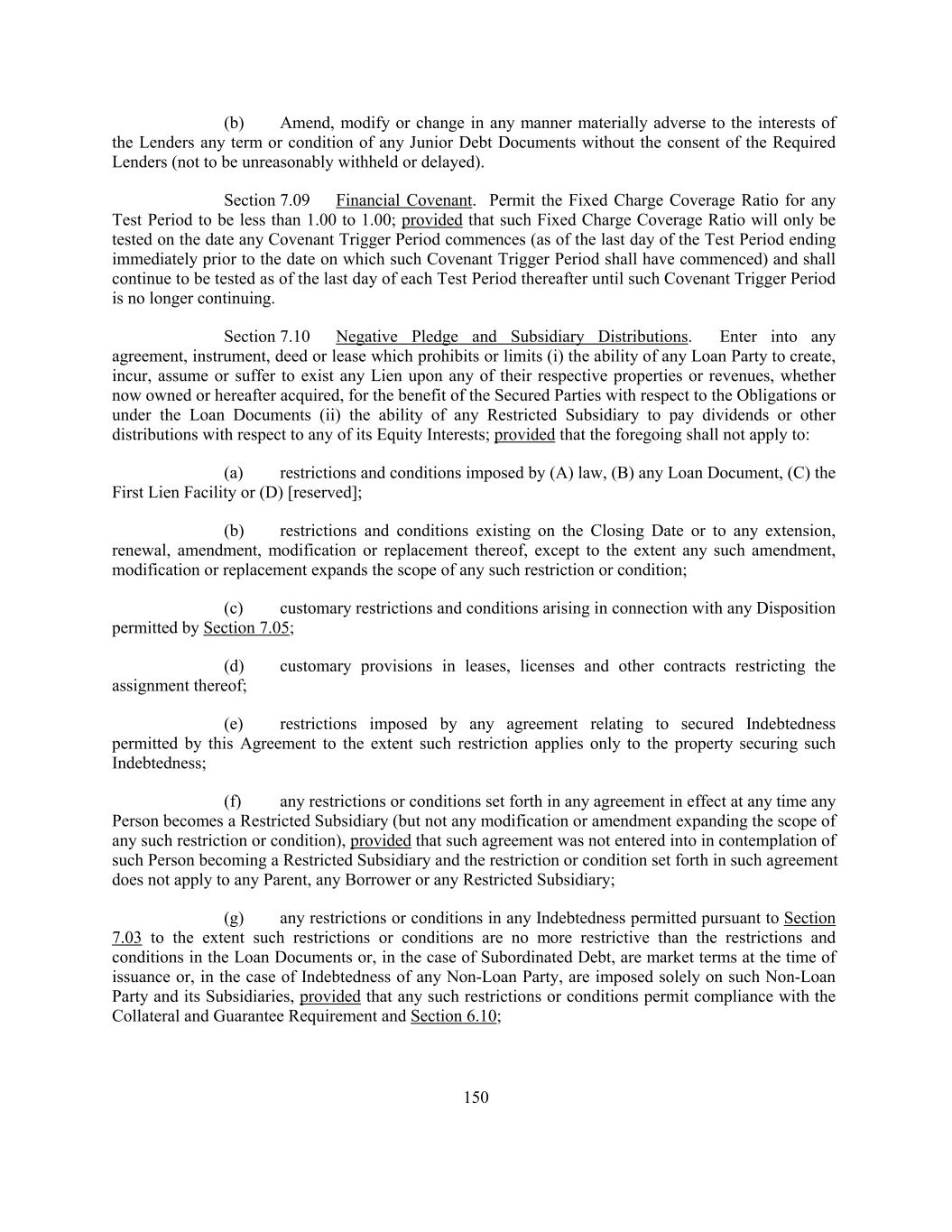 (b) Amend, modify or change in any manner materially adverse to the interests of the Lenders any term or condition of any Junior Debt Documents without the consent of the Required Lenders (not to be unreasonably withheld or delayed). Section 7.09 Financial Covenant. Permit the Fixed Charge Coverage Ratio for any Test Period to be less than 1.00 to 1.00; provided that such Fixed Charge Coverage Ratio will only be tested on the date any Covenant Trigger Period commences (as of the last day of the Test Period ending immediately prior to the date on which such Covenant Trigger Period shall have commenced) and shall continue to be tested as of the last day of each Test Period thereafter until such Covenant Trigger Period is no longer continuing. Section 7.10 Negative Pledge and Subsidiary Distributions. Enter into any agreement, instrument, deed or lease which prohibits or limits (i) the ability of any Loan Party to create, incur, assume or suffer to exist any Lien upon any of their respective properties or revenues, whether now owned or hereafter acquired, for the benefit of the Secured Parties with respect to the Obligations or under the Loan Documents (ii) the ability of any Restricted Subsidiary to pay dividends or other distributions with respect to any of its Equity Interests; provided that the foregoing shall not apply to: (a) restrictions and conditions imposed by (A) law, (B) any Loan Document, (C) the First Lien Facility or (D) [reserved]; (b) restrictions and conditions existing on the Closing Date or to any extension, renewal, amendment, modification or replacement thereof, except to the extent any such amendment, modification or replacement expands the scope of any such restriction or condition; (c) customary restrictions and conditions arising in connection with any Disposition permitted by Section 7.05; (d) customary provisions in leases, licenses and other contracts restricting the assignment thereof; (e) restrictions imposed by any agreement relating to secured Indebtedness permitted by this Agreement to the extent such restriction applies only to the property securing such Indebtedness; (f) any restrictions or conditions set forth in any agreement in effect at any time any Person becomes a Restricted Subsidiary (but not any modification or amendment expanding the scope of any such restriction or condition), provided that such agreement was not entered into in contemplation of such Person becoming a Restricted Subsidiary and the restriction or condition set forth in such agreement does not apply to any Parent, any Borrower or any Restricted Subsidiary; (g) any restrictions or conditions in any Indebtedness permitted pursuant to Section 7.03 to the extent such restrictions or conditions are no more restrictive than the restrictions and conditions in the Loan Documents or, in the case of Subordinated Debt, are market terms at the time of issuance or, in the case of Indebtedness of any Non-Loan Party, are imposed solely on such Non-Loan Party and its Subsidiaries, provided that any such restrictions or conditions permit compliance with the Collateral and Guarantee Requirement and Section 6.10; 150