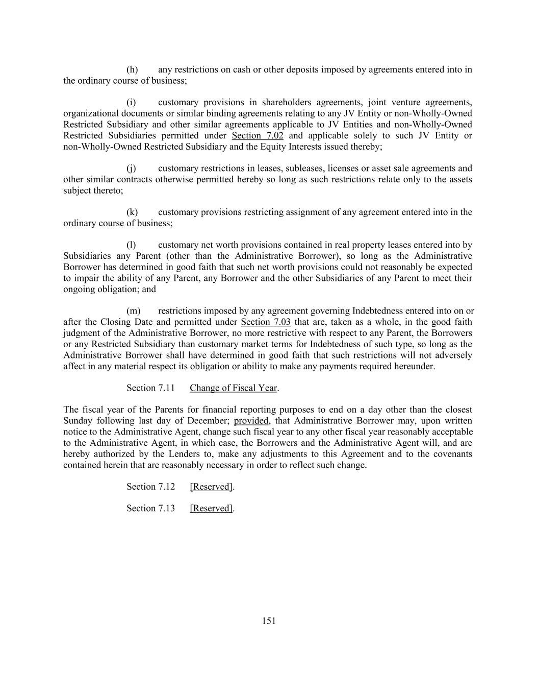 (h) any restrictions on cash or other deposits imposed by agreements entered into in the ordinary course of business; (i) customary provisions in shareholders agreements, joint venture agreements, organizational documents or similar binding agreements relating to any JV Entity or non-Wholly-Owned Restricted Subsidiary and other similar agreements applicable to JV Entities and non-Wholly-Owned Restricted Subsidiaries permitted under Section 7.02 and applicable solely to such JV Entity or non-Wholly-Owned Restricted Subsidiary and the Equity Interests issued thereby; (j) customary restrictions in leases, subleases, licenses or asset sale agreements and other similar contracts otherwise permitted hereby so long as such restrictions relate only to the assets subject thereto; (k) customary provisions restricting assignment of any agreement entered into in the ordinary course of business; (l) customary net worth provisions contained in real property leases entered into by Subsidiaries any Parent (other than the Administrative Borrower), so long as the Administrative Borrower has determined in good faith that such net worth provisions could not reasonably be expected to impair the ability of any Parent, any Borrower and the other Subsidiaries of any Parent to meet their ongoing obligation; and (m) restrictions imposed by any agreement governing Indebtedness entered into on or after the Closing Date and permitted under Section 7.03 that are, taken as a whole, in the good faith judgment of the Administrative Borrower, no more restrictive with respect to any Parent, the Borrowers or any Restricted Subsidiary than customary market terms for Indebtedness of such type, so long as the Administrative Borrower shall have determined in good faith that such restrictions will not adversely affect in any material respect its obligation or ability to make any payments required hereunder. Section 7.11 Change of Fiscal Year. The fiscal year of the Parents for financial reporting purposes to end on a day other than the closest Sunday following last day of December; provided, that Administrative Borrower may, upon written notice to the Administrative Agent, change such fiscal year to any other fiscal year reasonably acceptable to the Administrative Agent, in which case, the Borrowers and the Administrative Agent will, and are hereby authorized by the Lenders to, make any adjustments to this Agreement and to the covenants contained herein that are reasonably necessary in order to reflect such change. Section 7.12 [Reserved]. Section 7.13 [Reserved]. 151