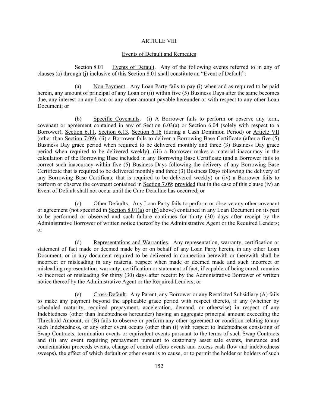 ARTICLE VIII Events of Default and Remedies Section 8.01 Events of Default. Any of the following events referred to in any of clauses (a) through (j) inclusive of this Section 8.01 shall constitute an “Event of Default”: (a) Non-Payment. Any Loan Party fails to pay (i) when and as required to be paid herein, any amount of principal of any Loan or (ii) within five (5) Business Days after the same becomes due, any interest on any Loan or any other amount payable hereunder or with respect to any other Loan Document; or (b) Specific Covenants. (i) A Borrower fails to perform or observe any term, covenant or agreement contained in any of Section 6.03(a) or Section 6.04 (solely with respect to a Borrower), Section 6.11, Section 6.13, Section 6.16 (during a Cash Dominion Period) or Article VII (other than Section 7.09), (ii) a Borrower fails to deliver a Borrowing Base Certificate (after a five (5) Business Day grace period when required to be delivered monthly and three (3) Business Day grace period when required to be delivered weekly), (iii) a Borrower makes a material inaccuracy in the calculation of the Borrowing Base included in any Borrowing Base Certificate (and a Borrower fails to correct such inaccuracy within five (5) Business Days following the delivery of any Borrowing Base Certificate that is required to be delivered monthly and three (3) Business Days following the delivery of any Borrowing Base Certificate that is required to be delivered weekly) or (iv) a Borrower fails to perform or observe the covenant contained in Section 7.09; provided that in the case of this clause (iv) an Event of Default shall not occur until the Cure Deadline has occurred; or (c) Other Defaults. Any Loan Party fails to perform or observe any other covenant or agreement (not specified in Section 8.01(a) or (b) above) contained in any Loan Document on its part to be performed or observed and such failure continues for thirty (30) days after receipt by the Administrative Borrower of written notice thereof by the Administrative Agent or the Required Lenders; or (d) Representations and Warranties. Any representation, warranty, certification or statement of fact made or deemed made by or on behalf of any Loan Party herein, in any other Loan Document, or in any document required to be delivered in connection herewith or therewith shall be incorrect or misleading in any material respect when made or deemed made and such incorrect or misleading representation, warranty, certification or statement of fact, if capable of being cured, remains so incorrect or misleading for thirty (30) days after receipt by the Administrative Borrower of written notice thereof by the Administrative Agent or the Required Lenders; or (e) Cross-Default. Any Parent, any Borrower or any Restricted Subsidiary (A) fails to make any payment beyond the applicable grace period with respect thereto, if any (whether by scheduled maturity, required prepayment, acceleration, demand, or otherwise) in respect of any Indebtedness (other than Indebtedness hereunder) having an aggregate principal amount exceeding the Threshold Amount, or (B) fails to observe or perform any other agreement or condition relating to any such Indebtedness, or any other event occurs (other than (i) with respect to Indebtedness consisting of Swap Contracts, termination events or equivalent events pursuant to the terms of such Swap Contracts and (ii) any event requiring prepayment pursuant to customary asset sale events, insurance and condemnation proceeds events, change of control offers events and excess cash flow and indebtedness sweeps), the effect of which default or other event is to cause, or to permit the holder or holders of such 152