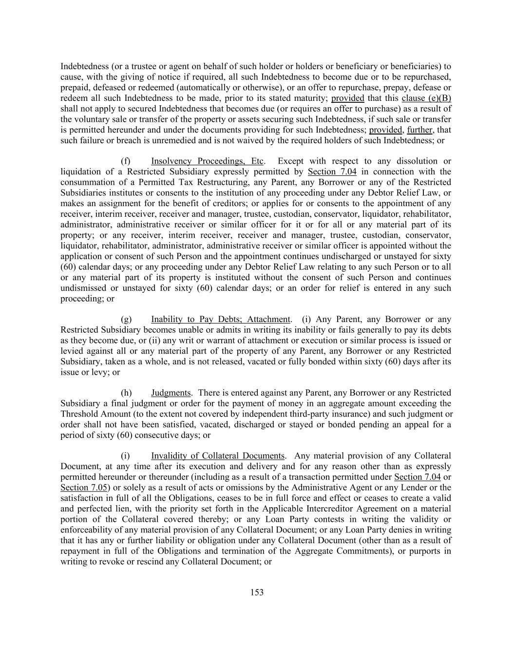 Indebtedness (or a trustee or agent on behalf of such holder or holders or beneficiary or beneficiaries) to cause, with the giving of notice if required, all such Indebtedness to become due or to be repurchased, prepaid, defeased or redeemed (automatically or otherwise), or an offer to repurchase, prepay, defease or redeem all such Indebtedness to be made, prior to its stated maturity; provided that this clause (e)(B) shall not apply to secured Indebtedness that becomes due (or requires an offer to purchase) as a result of the voluntary sale or transfer of the property or assets securing such Indebtedness, if such sale or transfer is permitted hereunder and under the documents providing for such Indebtedness; provided, further, that such failure or breach is unremedied and is not waived by the required holders of such Indebtedness; or (f) Insolvency Proceedings, Etc. Except with respect to any dissolution or liquidation of a Restricted Subsidiary expressly permitted by Section 7.04 in connection with the consummation of a Permitted Tax Restructuring, any Parent, any Borrower or any of the Restricted Subsidiaries institutes or consents to the institution of any proceeding under any Debtor Relief Law, or makes an assignment for the benefit of creditors; or applies for or consents to the appointment of any receiver, interim receiver, receiver and manager, trustee, custodian, conservator, liquidator, rehabilitator, administrator, administrative receiver or similar officer for it or for all or any material part of its property; or any receiver, interim receiver, receiver and manager, trustee, custodian, conservator, liquidator, rehabilitator, administrator, administrative receiver or similar officer is appointed without the application or consent of such Person and the appointment continues undischarged or unstayed for sixty (60) calendar days; or any proceeding under any Debtor Relief Law relating to any such Person or to all or any material part of its property is instituted without the consent of such Person and continues undismissed or unstayed for sixty (60) calendar days; or an order for relief is entered in any such proceeding; or (g) Inability to Pay Debts; Attachment. (i) Any Parent, any Borrower or any Restricted Subsidiary becomes unable or admits in writing its inability or fails generally to pay its debts as they become due, or (ii) any writ or warrant of attachment or execution or similar process is issued or levied against all or any material part of the property of any Parent, any Borrower or any Restricted Subsidiary, taken as a whole, and is not released, vacated or fully bonded within sixty (60) days after its issue or levy; or (h) Judgments. There is entered against any Parent, any Borrower or any Restricted Subsidiary a final judgment or order for the payment of money in an aggregate amount exceeding the Threshold Amount (to the extent not covered by independent third-party insurance) and such judgment or order shall not have been satisfied, vacated, discharged or stayed or bonded pending an appeal for a period of sixty (60) consecutive days; or (i) Invalidity of Collateral Documents. Any material provision of any Collateral Document, at any time after its execution and delivery and for any reason other than as expressly permitted hereunder or thereunder (including as a result of a transaction permitted under Section 7.04 or Section 7.05) or solely as a result of acts or omissions by the Administrative Agent or any Lender or the satisfaction in full of all the Obligations, ceases to be in full force and effect or ceases to create a valid and perfected lien, with the priority set forth in the Applicable Intercreditor Agreement on a material portion of the Collateral covered thereby; or any Loan Party contests in writing the validity or enforceability of any material provision of any Collateral Document; or any Loan Party denies in writing that it has any or further liability or obligation under any Collateral Document (other than as a result of repayment in full of the Obligations and termination of the Aggregate Commitments), or purports in writing to revoke or rescind any Collateral Document; or 153