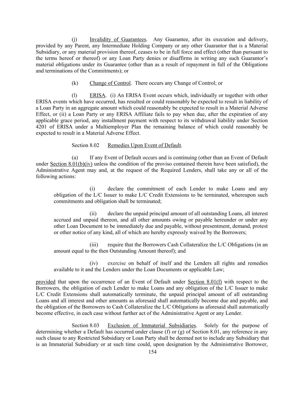 (j) Invalidity of Guarantees. Any Guarantee, after its execution and delivery, provided by any Parent, any Intermediate Holding Company or any other Guarantor that is a Material Subsidiary, or any material provision thereof, ceases to be in full force and effect (other than pursuant to the terms hereof or thereof) or any Loan Party denies or disaffirms in writing any such Guarantor’s material obligations under its Guarantee (other than as a result of repayment in full of the Obligations and terminations of the Commitments); or (k) Change of Control. There occurs any Change of Control; or (l) ERISA. (i) An ERISA Event occurs which, individually or together with other ERISA events which have occurred, has resulted or could reasonably be expected to result in liability of a Loan Party in an aggregate amount which could reasonably be expected to result in a Material Adverse Effect, or (ii) a Loan Party or any ERISA Affiliate fails to pay when due, after the expiration of any applicable grace period, any installment payment with respect to its withdrawal liability under Section 4201 of ERISA under a Multiemployer Plan the remaining balance of which could reasonably be expected to result in a Material Adverse Effect. Section 8.02 Remedies Upon Event of Default. (a) If any Event of Default occurs and is continuing (other than an Event of Default under Section 8.01(b)(iv) unless the condition of the proviso contained therein have been satisfied), the Administrative Agent may and, at the request of the Required Lenders, shall take any or all of the following actions: (i) declare the commitment of each Lender to make Loans and any obligation of the L/C Issuer to make L/C Credit Extensions to be terminated, whereupon such commitments and obligation shall be terminated; (ii) declare the unpaid principal amount of all outstanding Loans, all interest accrued and unpaid thereon, and all other amounts owing or payable hereunder or under any other Loan Document to be immediately due and payable, without presentment, demand, protest or other notice of any kind, all of which are hereby expressly waived by the Borrowers; (iii) require that the Borrowers Cash Collateralize the L/C Obligations (in an amount equal to the then Outstanding Amount thereof); and (iv) exercise on behalf of itself and the Lenders all rights and remedies available to it and the Lenders under the Loan Documents or applicable Law; provided that upon the occurrence of an Event of Default under Section 8.01(f) with respect to the Borrowers, the obligation of each Lender to make Loans and any obligation of the L/C Issuer to make L/C Credit Extensions shall automatically terminate, the unpaid principal amount of all outstanding Loans and all interest and other amounts as aforesaid shall automatically become due and payable, and the obligation of the Borrowers to Cash Collateralize the L/C Obligations as aforesaid shall automatically become effective, in each case without further act of the Administrative Agent or any Lender. Section 8.03 Exclusion of Immaterial Subsidiaries. Solely for the purpose of determining whether a Default has occurred under clause (f) or (g) of Section 8.01, any reference in any such clause to any Restricted Subsidiary or Loan Party shall be deemed not to include any Subsidiary that is an Immaterial Subsidiary or at such time could, upon designation by the Administrative Borrower, 154