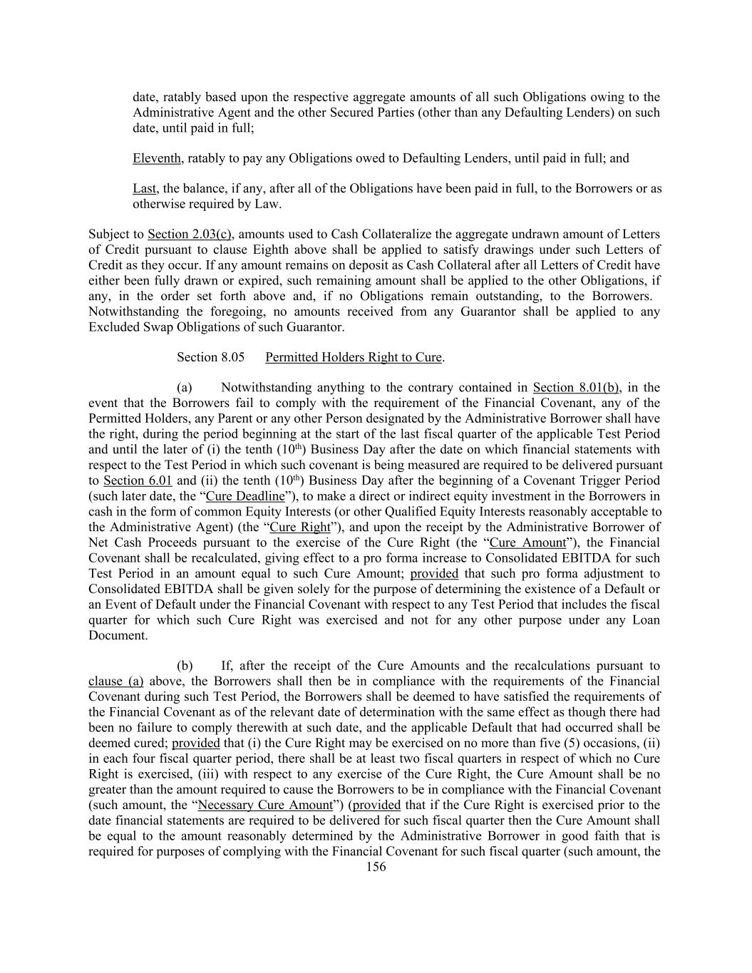 date, ratably based upon the respective aggregate amounts of all such Obligations owing to the Administrative Agent and the other Secured Parties (other than any Defaulting Lenders) on such date, until paid in full; Eleventh, ratably to pay any Obligations owed to Defaulting Lenders, until paid in full; and Last, the balance, if any, after all of the Obligations have been paid in full, to the Borrowers or as otherwise required by Law. Subject to Section 2.03(c), amounts used to Cash Collateralize the aggregate undrawn amount of Letters of Credit pursuant to clause Eighth above shall be applied to satisfy drawings under such Letters of Credit as they occur. If any amount remains on deposit as Cash Collateral after all Letters of Credit have either been fully drawn or expired, such remaining amount shall be applied to the other Obligations, if any, in the order set forth above and, if no Obligations remain outstanding, to the Borrowers. Notwithstanding the foregoing, no amounts received from any Guarantor shall be applied to any Excluded Swap Obligations of such Guarantor. Section 8.05 Permitted Holders Right to Cure. (a) Notwithstanding anything to the contrary contained in Section 8.01(b), in the event that the Borrowers fail to comply with the requirement of the Financial Covenant, any of the Permitted Holders, any Parent or any other Person designated by the Administrative Borrower shall have the right, during the period beginning at the start of the last fiscal quarter of the applicable Test Period and until the later of (i) the tenth (10th) Business Day after the date on which financial statements with respect to the Test Period in which such covenant is being measured are required to be delivered pursuant to Section 6.01 and (ii) the tenth (10th) Business Day after the beginning of a Covenant Trigger Period (such later date, the “Cure Deadline”), to make a direct or indirect equity investment in the Borrowers in cash in the form of common Equity Interests (or other Qualified Equity Interests reasonably acceptable to the Administrative Agent) (the “Cure Right”), and upon the receipt by the Administrative Borrower of Net Cash Proceeds pursuant to the exercise of the Cure Right (the “Cure Amount”), the Financial Covenant shall be recalculated, giving effect to a pro forma increase to Consolidated EBITDA for such Test Period in an amount equal to such Cure Amount; provided that such pro forma adjustment to Consolidated EBITDA shall be given solely for the purpose of determining the existence of a Default or an Event of Default under the Financial Covenant with respect to any Test Period that includes the fiscal quarter for which such Cure Right was exercised and not for any other purpose under any Loan Document. (b) If, after the receipt of the Cure Amounts and the recalculations pursuant to clause (a) above, the Borrowers shall then be in compliance with the requirements of the Financial Covenant during such Test Period, the Borrowers shall be deemed to have satisfied the requirements of the Financial Covenant as of the relevant date of determination with the same effect as though there had been no failure to comply therewith at such date, and the applicable Default that had occurred shall be deemed cured; provided that (i) the Cure Right may be exercised on no more than five (5) occasions, (ii) in each four fiscal quarter period, there shall be at least two fiscal quarters in respect of which no Cure Right is exercised, (iii) with respect to any exercise of the Cure Right, the Cure Amount shall be no greater than the amount required to cause the Borrowers to be in compliance with the Financial Covenant (such amount, the “Necessary Cure Amount”) (provided that if the Cure Right is exercised prior to the date financial statements are required to be delivered for such fiscal quarter then the Cure Amount shall be equal to the amount reasonably determined by the Administrative Borrower in good faith that is required for purposes of complying with the Financial Covenant for such fiscal quarter (such amount, the 156