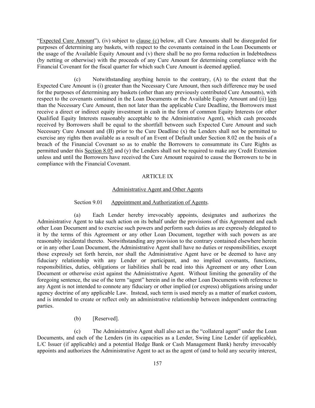 “Expected Cure Amount”), (iv) subject to clause (c) below, all Cure Amounts shall be disregarded for purposes of determining any baskets, with respect to the covenants contained in the Loan Documents or the usage of the Available Equity Amount and (v) there shall be no pro forma reduction in Indebtedness (by netting or otherwise) with the proceeds of any Cure Amount for determining compliance with the Financial Covenant for the fiscal quarter for which such Cure Amount is deemed applied. (c) Notwithstanding anything herein to the contrary, (A) to the extent that the Expected Cure Amount is (i) greater than the Necessary Cure Amount, then such difference may be used for the purposes of determining any baskets (other than any previously contributed Cure Amounts), with respect to the covenants contained in the Loan Documents or the Available Equity Amount and (ii) less than the Necessary Cure Amount, then not later than the applicable Cure Deadline, the Borrowers must receive a direct or indirect equity investment in cash in the form of common Equity Interests (or other Qualified Equity Interests reasonably acceptable to the Administrative Agent), which cash proceeds received by Borrowers shall be equal to the shortfall between such Expected Cure Amount and such Necessary Cure Amount and (B) prior to the Cure Deadline (x) the Lenders shall not be permitted to exercise any rights then available as a result of an Event of Default under Section 8.02 on the basis of a breach of the Financial Covenant so as to enable the Borrowers to consummate its Cure Rights as permitted under this Section 8.05 and (y) the Lenders shall not be required to make any Credit Extension unless and until the Borrowers have received the Cure Amount required to cause the Borrowers to be in compliance with the Financial Covenant. ARTICLE IX Administrative Agent and Other Agents Section 9.01 Appointment and Authorization of Agents. (a) Each Lender hereby irrevocably appoints, designates and authorizes the Administrative Agent to take such action on its behalf under the provisions of this Agreement and each other Loan Document and to exercise such powers and perform such duties as are expressly delegated to it by the terms of this Agreement or any other Loan Document, together with such powers as are reasonably incidental thereto. Notwithstanding any provision to the contrary contained elsewhere herein or in any other Loan Document, the Administrative Agent shall have no duties or responsibilities, except those expressly set forth herein, nor shall the Administrative Agent have or be deemed to have any fiduciary relationship with any Lender or participant, and no implied covenants, functions, responsibilities, duties, obligations or liabilities shall be read into this Agreement or any other Loan Document or otherwise exist against the Administrative Agent. Without limiting the generality of the foregoing sentence, the use of the term “agent” herein and in the other Loan Documents with reference to any Agent is not intended to connote any fiduciary or other implied (or express) obligations arising under agency doctrine of any applicable Law. Instead, such term is used merely as a matter of market custom, and is intended to create or reflect only an administrative relationship between independent contracting parties. (b) [Reserved]. (c) The Administrative Agent shall also act as the “collateral agent” under the Loan Documents, and each of the Lenders (in its capacities as a Lender, Swing Line Lender (if applicable), L/C Issuer (if applicable) and a potential Hedge Bank or Cash Management Bank) hereby irrevocably appoints and authorizes the Administrative Agent to act as the agent of (and to hold any security interest, 157
