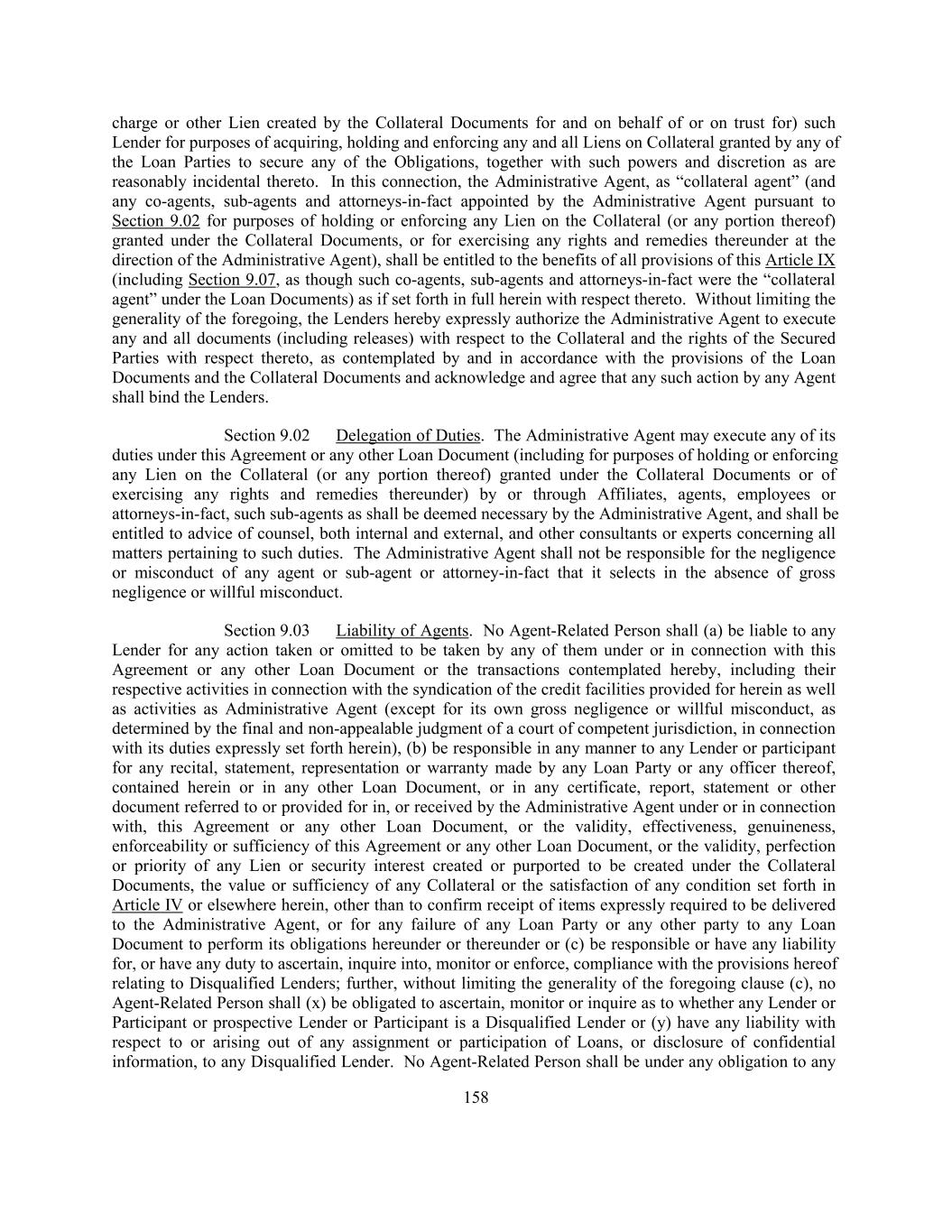 charge or other Lien created by the Collateral Documents for and on behalf of or on trust for) such Lender for purposes of acquiring, holding and enforcing any and all Liens on Collateral granted by any of the Loan Parties to secure any of the Obligations, together with such powers and discretion as are reasonably incidental thereto. In this connection, the Administrative Agent, as “collateral agent” (and any co-agents, sub-agents and attorneys-in-fact appointed by the Administrative Agent pursuant to Section 9.02 for purposes of holding or enforcing any Lien on the Collateral (or any portion thereof) granted under the Collateral Documents, or for exercising any rights and remedies thereunder at the direction of the Administrative Agent), shall be entitled to the benefits of all provisions of this Article IX (including Section 9.07, as though such co-agents, sub-agents and attorneys-in-fact were the “collateral agent” under the Loan Documents) as if set forth in full herein with respect thereto. Without limiting the generality of the foregoing, the Lenders hereby expressly authorize the Administrative Agent to execute any and all documents (including releases) with respect to the Collateral and the rights of the Secured Parties with respect thereto, as contemplated by and in accordance with the provisions of the Loan Documents and the Collateral Documents and acknowledge and agree that any such action by any Agent shall bind the Lenders. Section 9.02 Delegation of Duties. The Administrative Agent may execute any of its duties under this Agreement or any other Loan Document (including for purposes of holding or enforcing any Lien on the Collateral (or any portion thereof) granted under the Collateral Documents or of exercising any rights and remedies thereunder) by or through Affiliates, agents, employees or attorneys-in-fact, such sub-agents as shall be deemed necessary by the Administrative Agent, and shall be entitled to advice of counsel, both internal and external, and other consultants or experts concerning all matters pertaining to such duties. The Administrative Agent shall not be responsible for the negligence or misconduct of any agent or sub-agent or attorney-in-fact that it selects in the absence of gross negligence or willful misconduct. Section 9.03 Liability of Agents. No Agent-Related Person shall (a) be liable to any Lender for any action taken or omitted to be taken by any of them under or in connection with this Agreement or any other Loan Document or the transactions contemplated hereby, including their respective activities in connection with the syndication of the credit facilities provided for herein as well as activities as Administrative Agent (except for its own gross negligence or willful misconduct, as determined by the final and non-appealable judgment of a court of competent jurisdiction, in connection with its duties expressly set forth herein), (b) be responsible in any manner to any Lender or participant for any recital, statement, representation or warranty made by any Loan Party or any officer thereof, contained herein or in any other Loan Document, or in any certificate, report, statement or other document referred to or provided for in, or received by the Administrative Agent under or in connection with, this Agreement or any other Loan Document, or the validity, effectiveness, genuineness, enforceability or sufficiency of this Agreement or any other Loan Document, or the validity, perfection or priority of any Lien or security interest created or purported to be created under the Collateral Documents, the value or sufficiency of any Collateral or the satisfaction of any condition set forth in Article IV or elsewhere herein, other than to confirm receipt of items expressly required to be delivered to the Administrative Agent, or for any failure of any Loan Party or any other party to any Loan Document to perform its obligations hereunder or thereunder or (c) be responsible or have any liability for, or have any duty to ascertain, inquire into, monitor or enforce, compliance with the provisions hereof relating to Disqualified Lenders; further, without limiting the generality of the foregoing clause (c), no Agent-Related Person shall (x) be obligated to ascertain, monitor or inquire as to whether any Lender or Participant or prospective Lender or Participant is a Disqualified Lender or (y) have any liability with respect to or arising out of any assignment or participation of Loans, or disclosure of confidential information, to any Disqualified Lender. No Agent-Related Person shall be under any obligation to any 158