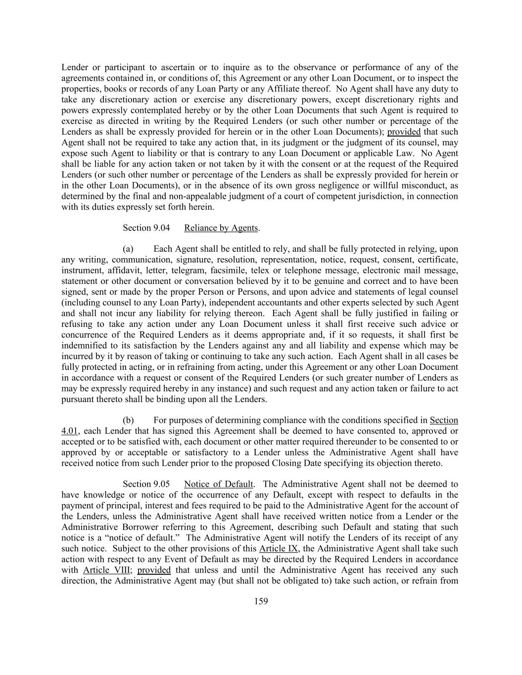 Lender or participant to ascertain or to inquire as to the observance or performance of any of the agreements contained in, or conditions of, this Agreement or any other Loan Document, or to inspect the properties, books or records of any Loan Party or any Affiliate thereof. No Agent shall have any duty to take any discretionary action or exercise any discretionary powers, except discretionary rights and powers expressly contemplated hereby or by the other Loan Documents that such Agent is required to exercise as directed in writing by the Required Lenders (or such other number or percentage of the Lenders as shall be expressly provided for herein or in the other Loan Documents); provided that such Agent shall not be required to take any action that, in its judgment or the judgment of its counsel, may expose such Agent to liability or that is contrary to any Loan Document or applicable Law. No Agent shall be liable for any action taken or not taken by it with the consent or at the request of the Required Lenders (or such other number or percentage of the Lenders as shall be expressly provided for herein or in the other Loan Documents), or in the absence of its own gross negligence or willful misconduct, as determined by the final and non-appealable judgment of a court of competent jurisdiction, in connection with its duties expressly set forth herein. Section 9.04 Reliance by Agents. (a) Each Agent shall be entitled to rely, and shall be fully protected in relying, upon any writing, communication, signature, resolution, representation, notice, request, consent, certificate, instrument, affidavit, letter, telegram, facsimile, telex or telephone message, electronic mail message, statement or other document or conversation believed by it to be genuine and correct and to have been signed, sent or made by the proper Person or Persons, and upon advice and statements of legal counsel (including counsel to any Loan Party), independent accountants and other experts selected by such Agent and shall not incur any liability for relying thereon. Each Agent shall be fully justified in failing or refusing to take any action under any Loan Document unless it shall first receive such advice or concurrence of the Required Lenders as it deems appropriate and, if it so requests, it shall first be indemnified to its satisfaction by the Lenders against any and all liability and expense which may be incurred by it by reason of taking or continuing to take any such action. Each Agent shall in all cases be fully protected in acting, or in refraining from acting, under this Agreement or any other Loan Document in accordance with a request or consent of the Required Lenders (or such greater number of Lenders as may be expressly required hereby in any instance) and such request and any action taken or failure to act pursuant thereto shall be binding upon all the Lenders. (b) For purposes of determining compliance with the conditions specified in Section 4.01, each Lender that has signed this Agreement shall be deemed to have consented to, approved or accepted or to be satisfied with, each document or other matter required thereunder to be consented to or approved by or acceptable or satisfactory to a Lender unless the Administrative Agent shall have received notice from such Lender prior to the proposed Closing Date specifying its objection thereto. Section 9.05 Notice of Default. The Administrative Agent shall not be deemed to have knowledge or notice of the occurrence of any Default, except with respect to defaults in the payment of principal, interest and fees required to be paid to the Administrative Agent for the account of the Lenders, unless the Administrative Agent shall have received written notice from a Lender or the Administrative Borrower referring to this Agreement, describing such Default and stating that such notice is a “notice of default.” The Administrative Agent will notify the Lenders of its receipt of any such notice. Subject to the other provisions of this Article IX, the Administrative Agent shall take such action with respect to any Event of Default as may be directed by the Required Lenders in accordance with Article VIII; provided that unless and until the Administrative Agent has received any such direction, the Administrative Agent may (but shall not be obligated to) take such action, or refrain from 159