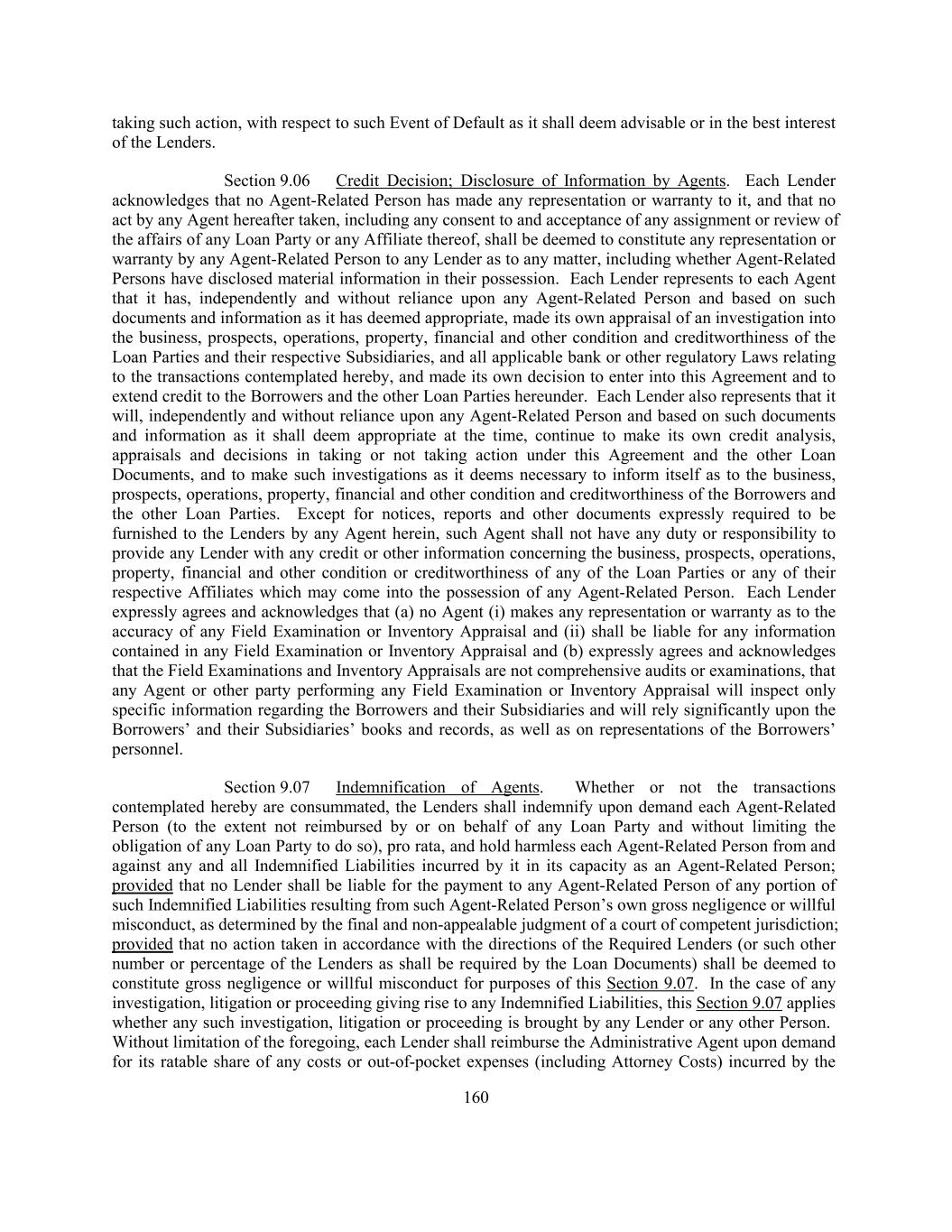 taking such action, with respect to such Event of Default as it shall deem advisable or in the best interest of the Lenders. Section 9.06 Credit Decision; Disclosure of Information by Agents. Each Lender acknowledges that no Agent-Related Person has made any representation or warranty to it, and that no act by any Agent hereafter taken, including any consent to and acceptance of any assignment or review of the affairs of any Loan Party or any Affiliate thereof, shall be deemed to constitute any representation or warranty by any Agent-Related Person to any Lender as to any matter, including whether Agent-Related Persons have disclosed material information in their possession. Each Lender represents to each Agent that it has, independently and without reliance upon any Agent-Related Person and based on such documents and information as it has deemed appropriate, made its own appraisal of an investigation into the business, prospects, operations, property, financial and other condition and creditworthiness of the Loan Parties and their respective Subsidiaries, and all applicable bank or other regulatory Laws relating to the transactions contemplated hereby, and made its own decision to enter into this Agreement and to extend credit to the Borrowers and the other Loan Parties hereunder. Each Lender also represents that it will, independently and without reliance upon any Agent-Related Person and based on such documents and information as it shall deem appropriate at the time, continue to make its own credit analysis, appraisals and decisions in taking or not taking action under this Agreement and the other Loan Documents, and to make such investigations as it deems necessary to inform itself as to the business, prospects, operations, property, financial and other condition and creditworthiness of the Borrowers and the other Loan Parties. Except for notices, reports and other documents expressly required to be furnished to the Lenders by any Agent herein, such Agent shall not have any duty or responsibility to provide any Lender with any credit or other information concerning the business, prospects, operations, property, financial and other condition or creditworthiness of any of the Loan Parties or any of their respective Affiliates which may come into the possession of any Agent-Related Person. Each Lender expressly agrees and acknowledges that (a) no Agent (i) makes any representation or warranty as to the accuracy of any Field Examination or Inventory Appraisal and (ii) shall be liable for any information contained in any Field Examination or Inventory Appraisal and (b) expressly agrees and acknowledges that the Field Examinations and Inventory Appraisals are not comprehensive audits or examinations, that any Agent or other party performing any Field Examination or Inventory Appraisal will inspect only specific information regarding the Borrowers and their Subsidiaries and will rely significantly upon the Borrowers’ and their Subsidiaries’ books and records, as well as on representations of the Borrowers’ personnel. Section 9.07 Indemnification of Agents. Whether or not the transactions contemplated hereby are consummated, the Lenders shall indemnify upon demand each Agent-Related Person (to the extent not reimbursed by or on behalf of any Loan Party and without limiting the obligation of any Loan Party to do so), pro rata, and hold harmless each Agent-Related Person from and against any and all Indemnified Liabilities incurred by it in its capacity as an Agent-Related Person; provided that no Lender shall be liable for the payment to any Agent-Related Person of any portion of such Indemnified Liabilities resulting from such Agent-Related Person’s own gross negligence or willful misconduct, as determined by the final and non-appealable judgment of a court of competent jurisdiction; provided that no action taken in accordance with the directions of the Required Lenders (or such other number or percentage of the Lenders as shall be required by the Loan Documents) shall be deemed to constitute gross negligence or willful misconduct for purposes of this Section 9.07. In the case of any investigation, litigation or proceeding giving rise to any Indemnified Liabilities, this Section 9.07 applies whether any such investigation, litigation or proceeding is brought by any Lender or any other Person. Without limitation of the foregoing, each Lender shall reimburse the Administrative Agent upon demand for its ratable share of any costs or out-of-pocket expenses (including Attorney Costs) incurred by the 160