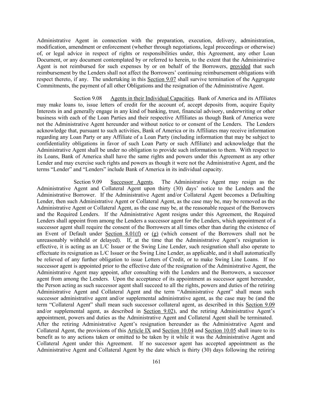 Administrative Agent in connection with the preparation, execution, delivery, administration, modification, amendment or enforcement (whether through negotiations, legal proceedings or otherwise) of, or legal advice in respect of rights or responsibilities under, this Agreement, any other Loan Document, or any document contemplated by or referred to herein, to the extent that the Administrative Agent is not reimbursed for such expenses by or on behalf of the Borrowers, provided that such reimbursement by the Lenders shall not affect the Borrowers’ continuing reimbursement obligations with respect thereto, if any. The undertaking in this Section 9.07 shall survive termination of the Aggregate Commitments, the payment of all other Obligations and the resignation of the Administrative Agent. Section 9.08 Agents in their Individual Capacities. Bank of America and its Affiliates may make loans to, issue letters of credit for the account of, accept deposits from, acquire Equity Interests in and generally engage in any kind of banking, trust, financial advisory, underwriting or other business with each of the Loan Parties and their respective Affiliates as though Bank of America were not the Administrative Agent hereunder and without notice to or consent of the Lenders. The Lenders acknowledge that, pursuant to such activities, Bank of America or its Affiliates may receive information regarding any Loan Party or any Affiliate of a Loan Party (including information that may be subject to confidentiality obligations in favor of such Loan Party or such Affiliate) and acknowledge that the Administrative Agent shall be under no obligation to provide such information to them. With respect to its Loans, Bank of America shall have the same rights and powers under this Agreement as any other Lender and may exercise such rights and powers as though it were not the Administrative Agent, and the terms “Lender” and “Lenders” include Bank of America in its individual capacity. Section 9.09 Successor Agents. The Administrative Agent may resign as the Administrative Agent and Collateral Agent upon thirty (30) days’ notice to the Lenders and the Administrative Borrower. If the Administrative Agent and/or Collateral Agent becomes a Defaulting Lender, then such Administrative Agent or Collateral Agent, as the case may be, may be removed as the Administrative Agent or Collateral Agent, as the case may be, at the reasonable request of the Borrowers and the Required Lenders. If the Administrative Agent resigns under this Agreement, the Required Lenders shall appoint from among the Lenders a successor agent for the Lenders, which appointment of a successor agent shall require the consent of the Borrowers at all times other than during the existence of an Event of Default under Section 8.01(f) or (g) (which consent of the Borrowers shall not be unreasonably withheld or delayed). If, at the time that the Administrative Agent’s resignation is effective, it is acting as an L/C Issuer or the Swing Line Lender, such resignation shall also operate to effectuate its resignation as L/C Issuer or the Swing Line Lender, as applicable, and it shall automatically be relieved of any further obligation to issue Letters of Credit, or to make Swing Line Loans. If no successor agent is appointed prior to the effective date of the resignation of the Administrative Agent, the Administrative Agent may appoint, after consulting with the Lenders and the Borrowers, a successor agent from among the Lenders. Upon the acceptance of its appointment as successor agent hereunder, the Person acting as such successor agent shall succeed to all the rights, powers and duties of the retiring Administrative Agent and Collateral Agent and the term “Administrative Agent” shall mean such successor administrative agent and/or supplemental administrative agent, as the case may be (and the term “Collateral Agent” shall mean such successor collateral agent, as described in this Section 9.09 and/or supplemental agent, as described in Section 9.02), and the retiring Administrative Agent’s appointment, powers and duties as the Administrative Agent and Collateral Agent shall be terminated. After the retiring Administrative Agent’s resignation hereunder as the Administrative Agent and Collateral Agent, the provisions of this Article IX and Section 10.04 and Section 10.05 shall inure to its benefit as to any actions taken or omitted to be taken by it while it was the Administrative Agent and Collateral Agent under this Agreement. If no successor agent has accepted appointment as the Administrative Agent and Collateral Agent by the date which is thirty (30) days following the retiring 161