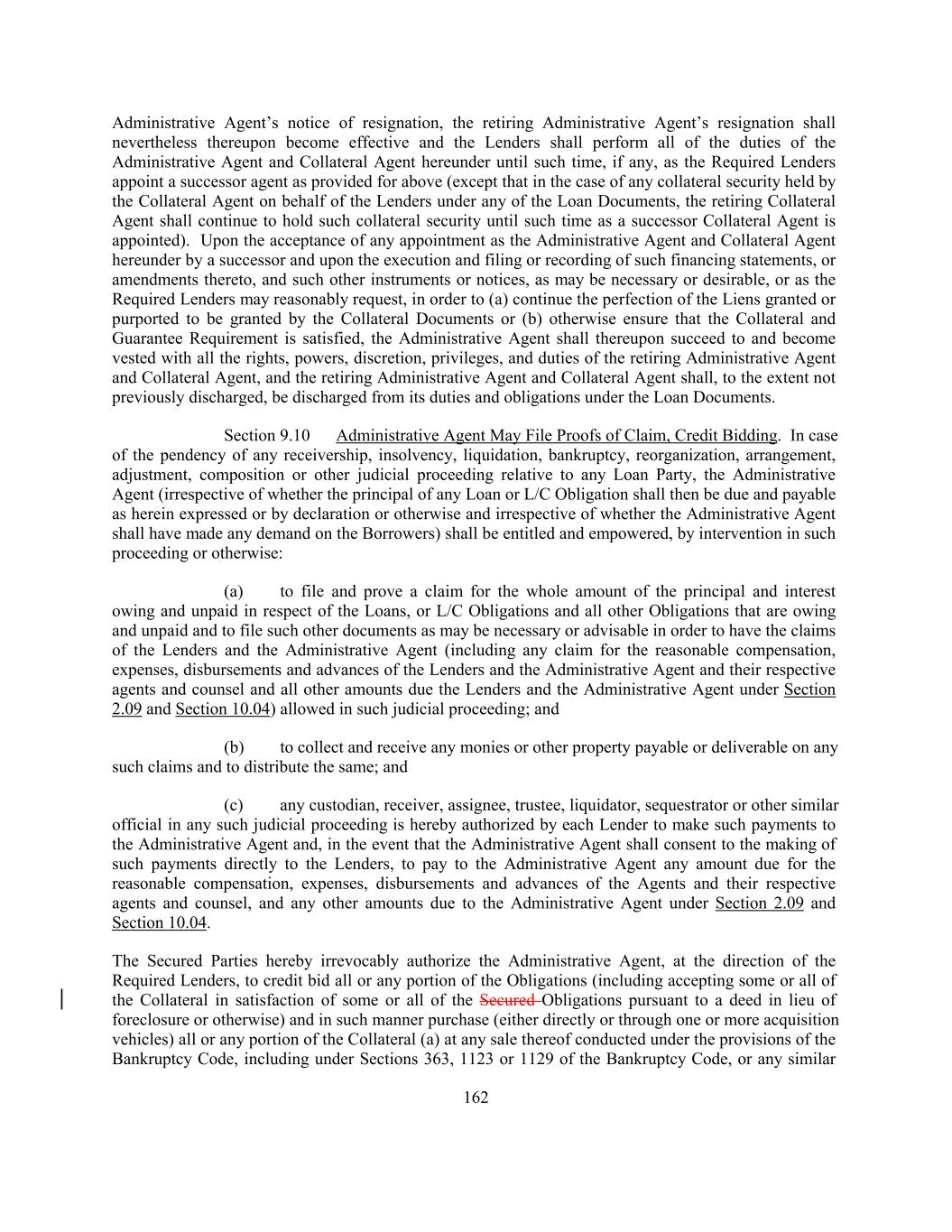 Administrative Agent’s notice of resignation, the retiring Administrative Agent’s resignation shall nevertheless thereupon become effective and the Lenders shall perform all of the duties of the Administrative Agent and Collateral Agent hereunder until such time, if any, as the Required Lenders appoint a successor agent as provided for above (except that in the case of any collateral security held by the Collateral Agent on behalf of the Lenders under any of the Loan Documents, the retiring Collateral Agent shall continue to hold such collateral security until such time as a successor Collateral Agent is appointed). Upon the acceptance of any appointment as the Administrative Agent and Collateral Agent hereunder by a successor and upon the execution and filing or recording of such financing statements, or amendments thereto, and such other instruments or notices, as may be necessary or desirable, or as the Required Lenders may reasonably request, in order to (a) continue the perfection of the Liens granted or purported to be granted by the Collateral Documents or (b) otherwise ensure that the Collateral and Guarantee Requirement is satisfied, the Administrative Agent shall thereupon succeed to and become vested with all the rights, powers, discretion, privileges, and duties of the retiring Administrative Agent and Collateral Agent, and the retiring Administrative Agent and Collateral Agent shall, to the extent not previously discharged, be discharged from its duties and obligations under the Loan Documents. Section 9.10 Administrative Agent May File Proofs of Claim, Credit Bidding. In case of the pendency of any receivership, insolvency, liquidation, bankruptcy, reorganization, arrangement, adjustment, composition or other judicial proceeding relative to any Loan Party, the Administrative Agent (irrespective of whether the principal of any Loan or L/C Obligation shall then be due and payable as herein expressed or by declaration or otherwise and irrespective of whether the Administrative Agent shall have made any demand on the Borrowers) shall be entitled and empowered, by intervention in such proceeding or otherwise: (a) to file and prove a claim for the whole amount of the principal and interest owing and unpaid in respect of the Loans, or L/C Obligations and all other Obligations that are owing and unpaid and to file such other documents as may be necessary or advisable in order to have the claims of the Lenders and the Administrative Agent (including any claim for the reasonable compensation, expenses, disbursements and advances of the Lenders and the Administrative Agent and their respective agents and counsel and all other amounts due the Lenders and the Administrative Agent under Section 2.09 and Section 10.04) allowed in such judicial proceeding; and (b) to collect and receive any monies or other property payable or deliverable on any such claims and to distribute the same; and (c) any custodian, receiver, assignee, trustee, liquidator, sequestrator or other similar official in any such judicial proceeding is hereby authorized by each Lender to make such payments to the Administrative Agent and, in the event that the Administrative Agent shall consent to the making of such payments directly to the Lenders, to pay to the Administrative Agent any amount due for the reasonable compensation, expenses, disbursements and advances of the Agents and their respective agents and counsel, and any other amounts due to the Administrative Agent under Section 2.09 and Section 10.04. The Secured Parties hereby irrevocably authorize the Administrative Agent, at the direction of the Required Lenders, to credit bid all or any portion of the Obligations (including accepting some or all of the Collateral in satisfaction of some or all of the Secured Obligations pursuant to a deed in lieu of foreclosure or otherwise) and in such manner purchase (either directly or through one or more acquisition vehicles) all or any portion of the Collateral (a) at any sale thereof conducted under the provisions of the Bankruptcy Code, including under Sections 363, 1123 or 1129 of the Bankruptcy Code, or any similar 162